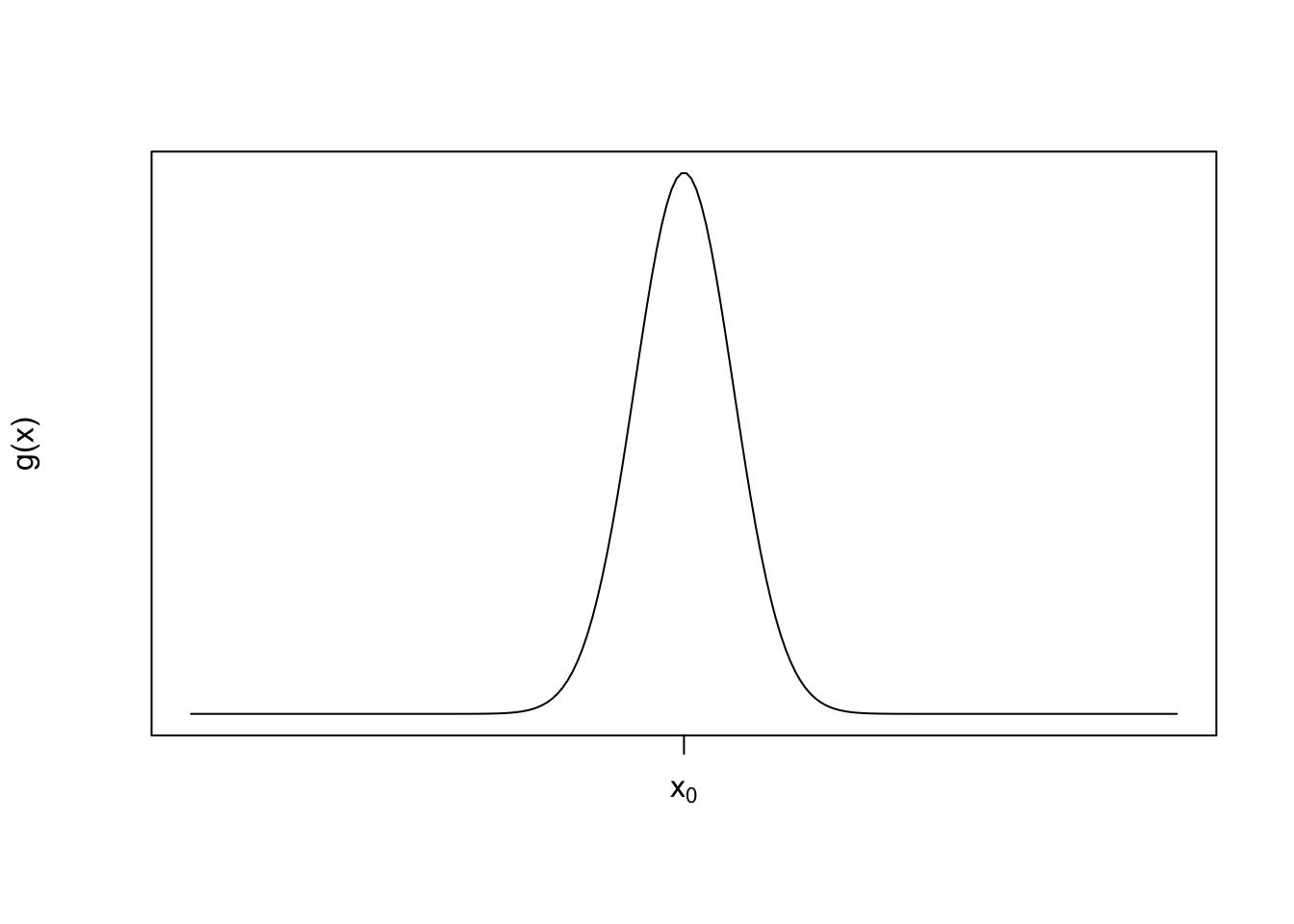 We can see that this function has most of its mass concentrated around the point \(x_0\) and that we could probably approximate the area under the function with something like a step function.