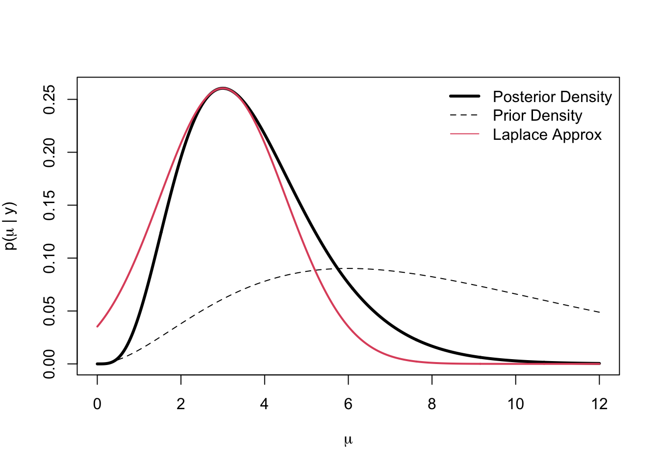 If we let \(h(\theta) = \log f(y\mid\theta)\pi(\theta)\), then we can use the same Laplace approximation procedure described in the previous section. However, in order to do that we must know where \(h(\theta)\) achieves its maximum. Because \(h(\theta)\) is simply a monotonic transformation of a function proportional to the posterior density, we know that \(h(\theta)\) achieves its maximum at the posterior mode.
