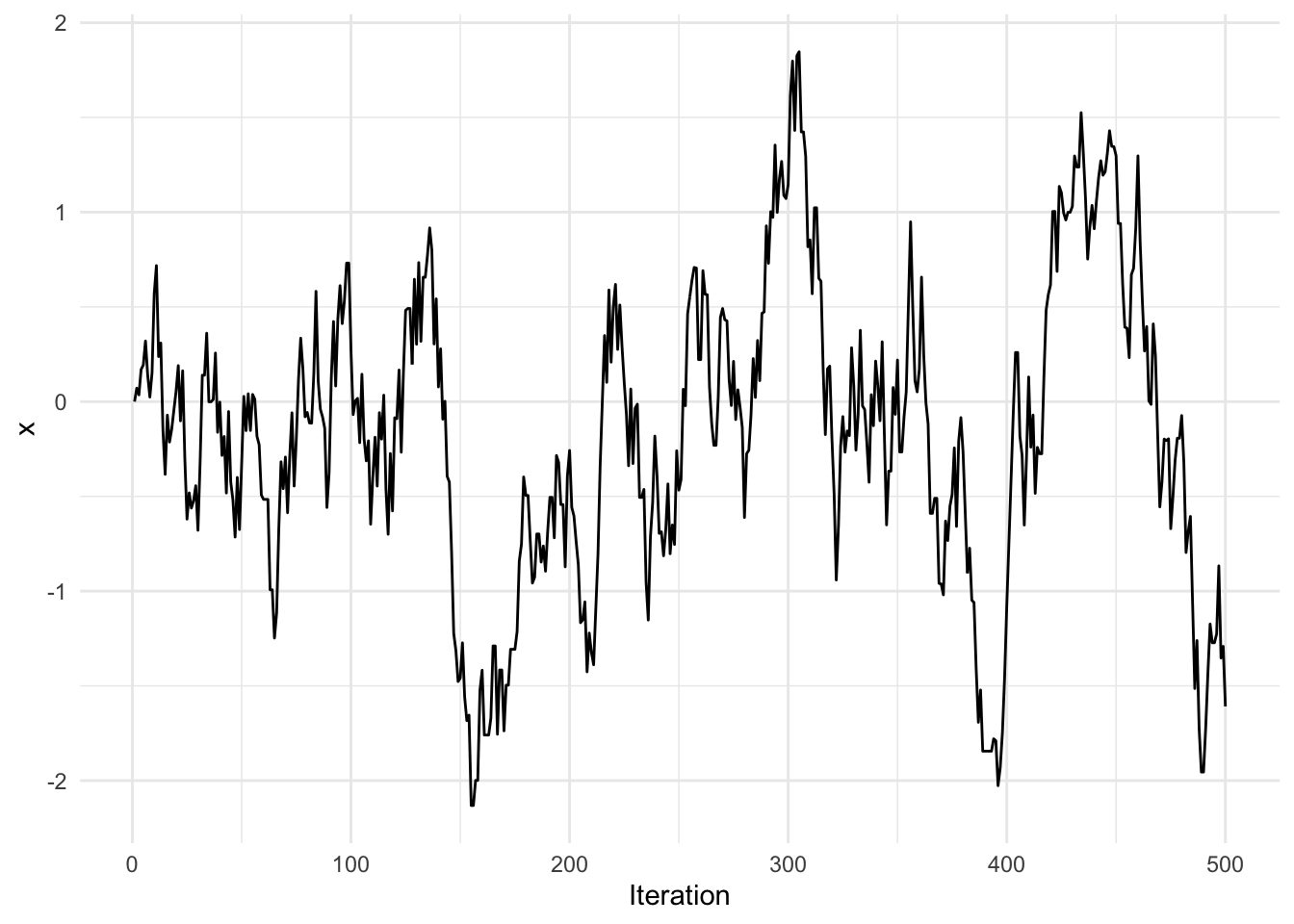 This raises an important in Markov chain samplers: tuning. The theory does not depend on a specific value of \(\delta\); both chains above should converge to a Normal distribution. However, the speed with which they converge and amount of the sample space that is explored does depend on \(\delta\). Hence, the sampler can be tuned to improve its efficiency.