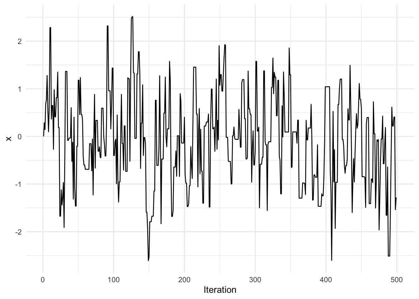You can see in this trace plot that there are a number of iterations where there is no movement (so that the candidate is rejected, whereas in the above trace plot with the smaller value of \(\delta\) there was much more movement, although the steps themselves were smaller. In particular, the first chain exhibited a bit more autocorrelation. With a larger \(\delta\), we are proposing candidates that are much further from the current state, and that may not comport with the Normal distribution. As a result, the candidates are more likely to be rejected.