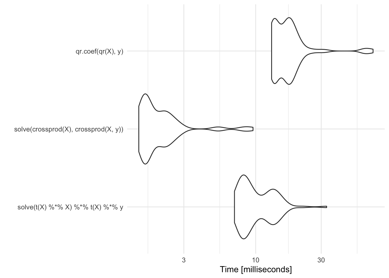 microbenchmark(solve(t(X) %*% X) %*% t(X) %*% y)Unit: milliseconds