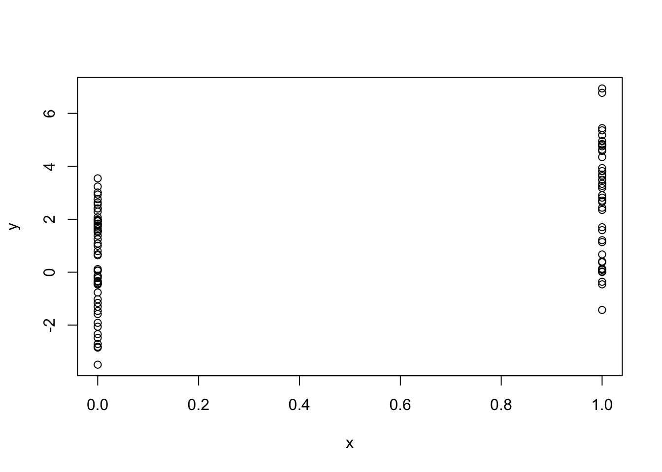What if we wanted to simulate a predictor variable x that is binary instead of having a Normal distribution. We can use the rbinom() function to simulate binary random variables.