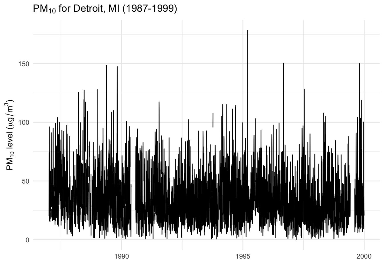 However, when looking at the plot above it’s difficult not to notice the extreme spikes that occur on a regular basis. A cursory reading of the plot shows days where the levels of PM10 reach over 100 \(\mu\)g/m\(^3\). So PM10 in Detroit is decreasing over time but we still experience high levels on certain days. Are things improving or not?