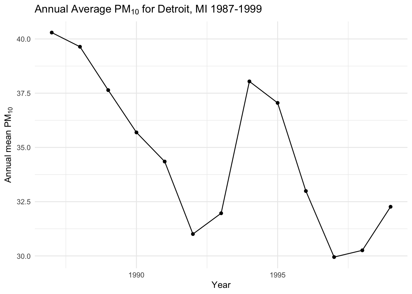 One might ask a seemingly simple question: Has air pollution in Detroit improved over the period 1987–1999? There is in fact a small but persistent overall decrease in pollution levels over this time period.