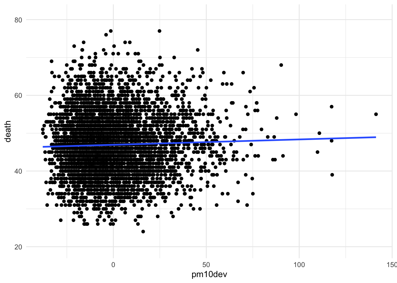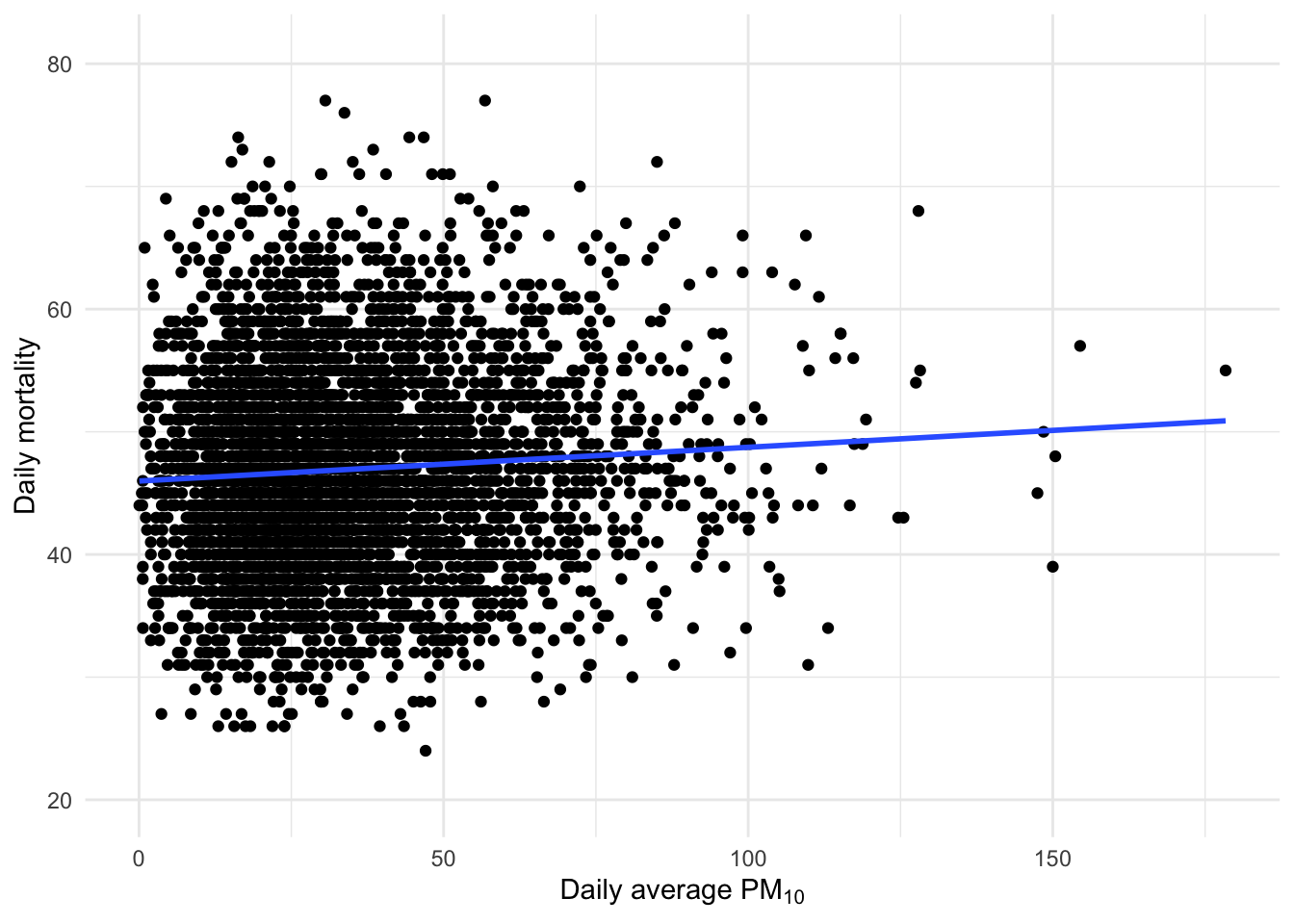 Here the association is quite a bit smaller, but of course we are only looking at daily changes in PM10 rather than annual changes. We would not expect massive numbers of deaths associated with a one-unit change in PM10 from one day to the next.