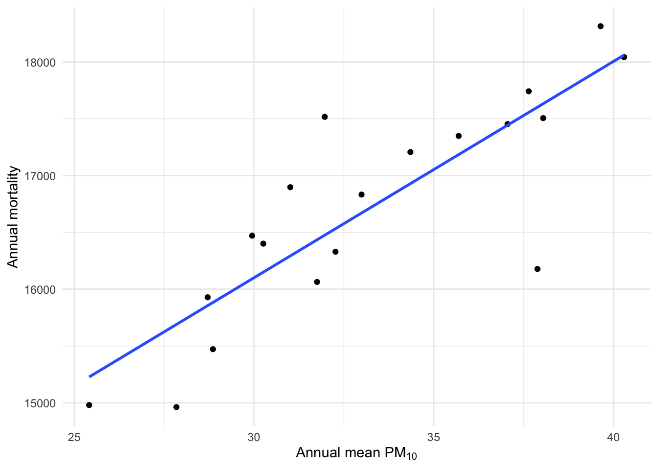 Let’s compute the annual mean of PM10 and sum the annual total number of deaths and make a scatter plot of these annual summary statistics.