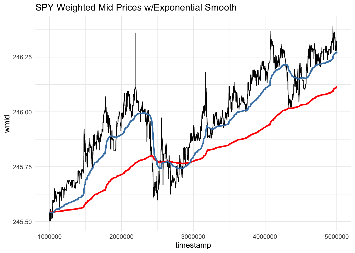 Here is a plot of the weighted mid price for the SPY exchange traded fund for a few seconds of trading.