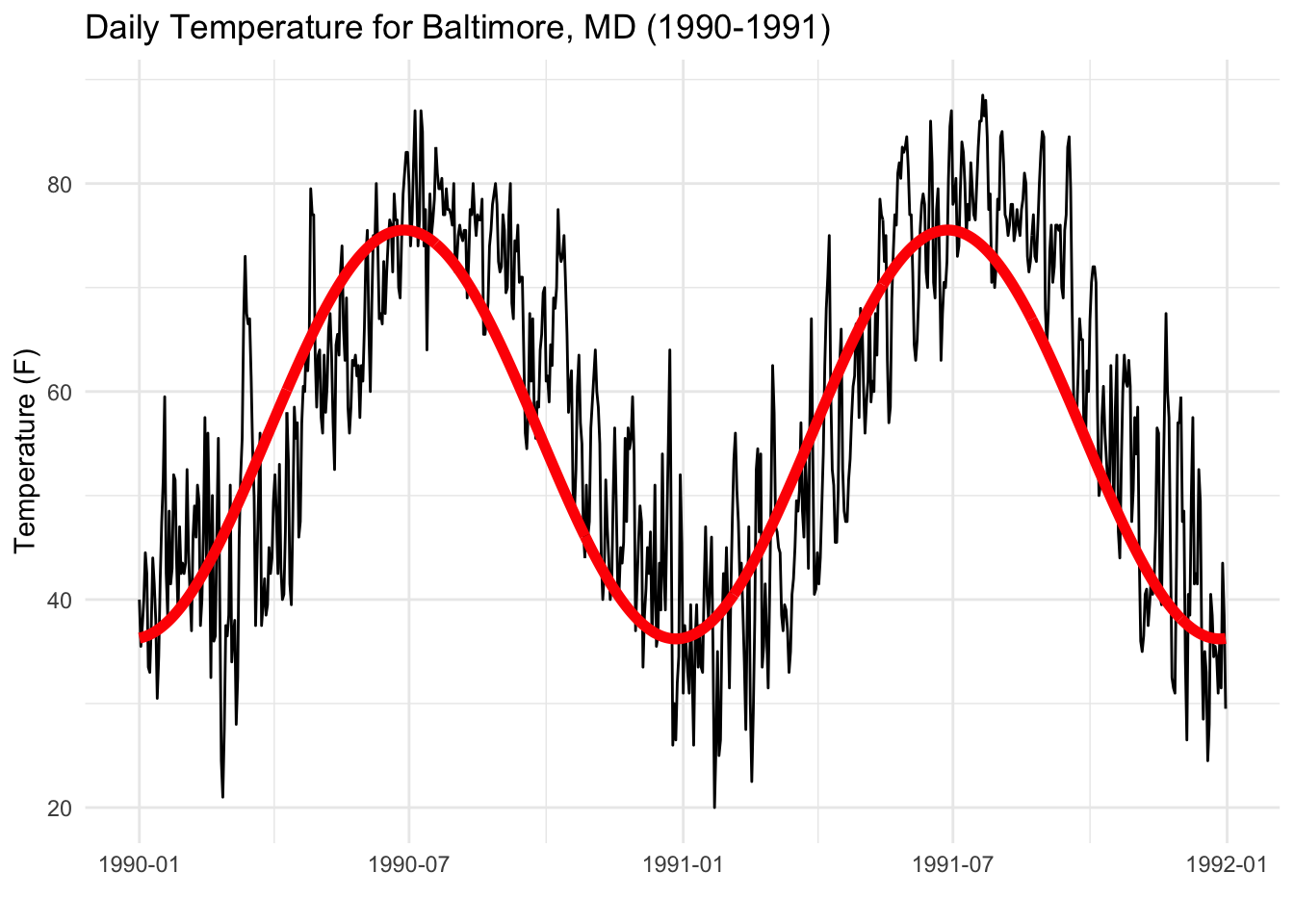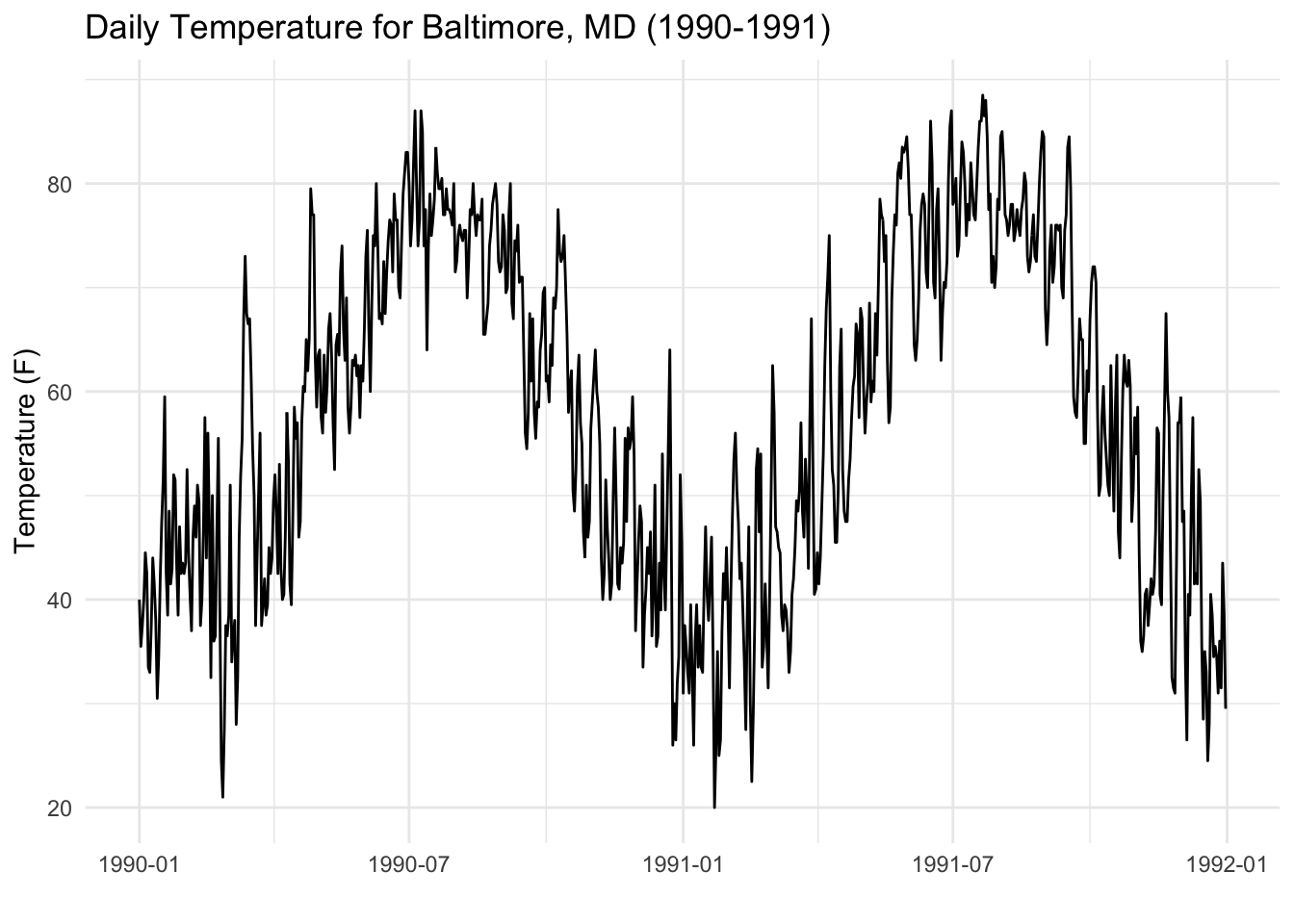 As an example, we will use daily temperature data from Baltimore, MD. The data represent 24-hour average temperatures taken from a monitor in downtown Baltimore. Here is a plot of the data from 1990–1991.