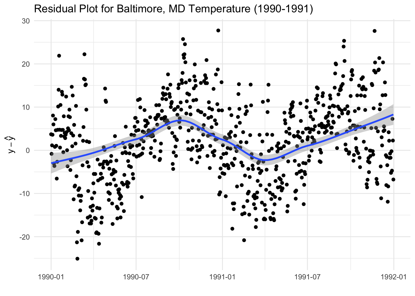 Suppose we wanted to know if there is an annual cycle in the data. From looking at the plot, it’s clear that there is an annual cycle, but bear with me here. We might fit the following linear model: