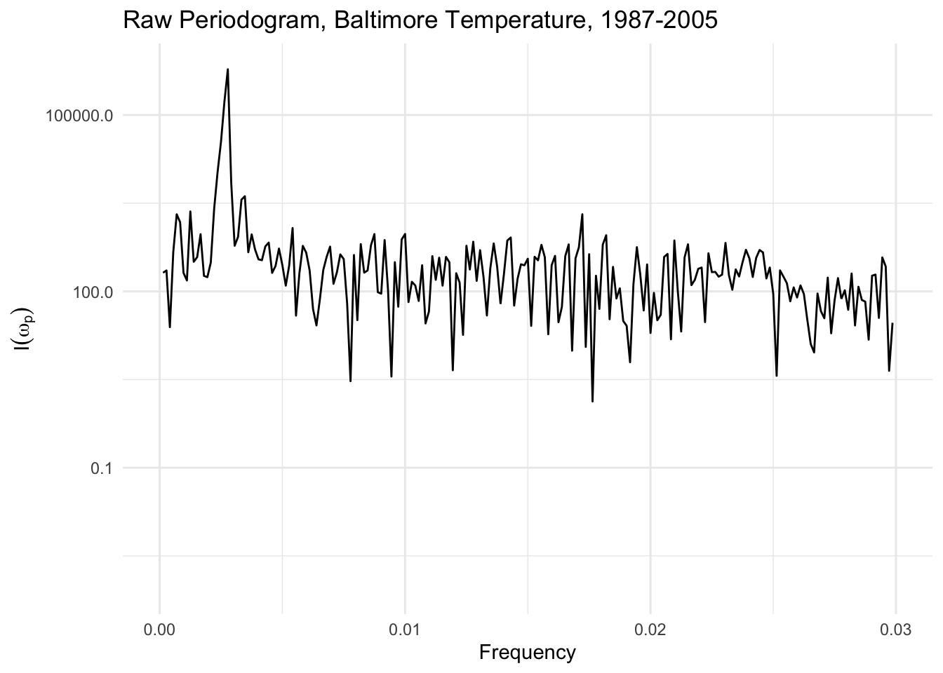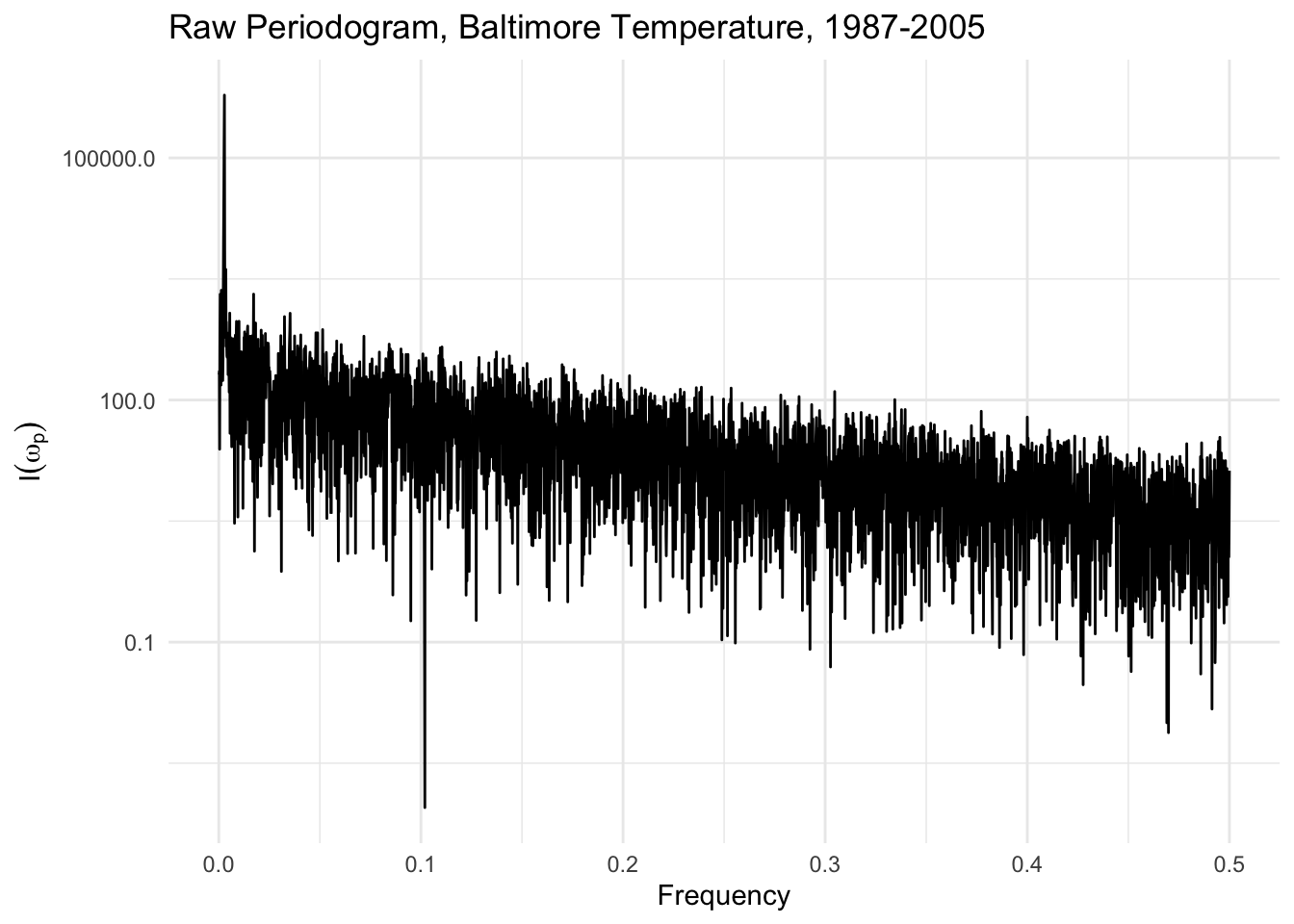 The raw periodogram can be obtained via the spectrum() function in R, which computes the periodogram using the Fast Fourier Transform (see below). We can plot the raw periodogram for the Baltimore temperature data below.