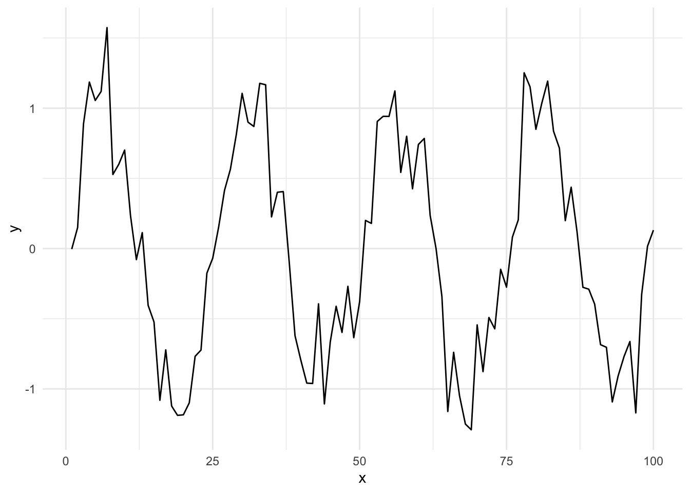 Before going too much further, it’s worth noting that we haven’t really done anything to reduce the complexity of the data, i.e. we haven’t modeled anything. Plotting the periodogram as a function of \(\omega_p\) shows a very noisy function. Furthermore, the estimate of \(I(\omega_p)\) does not get less noisy as we increase the sample size \(n\). Intuitively, this is because the “model” that we started out with here had \(n\) parameters for \(n\) data points. Therefore, as we increase \(n\), we simply increase the number of parameters that we need to estimate. This problem can be solved via smoothing, which we will discuss later.