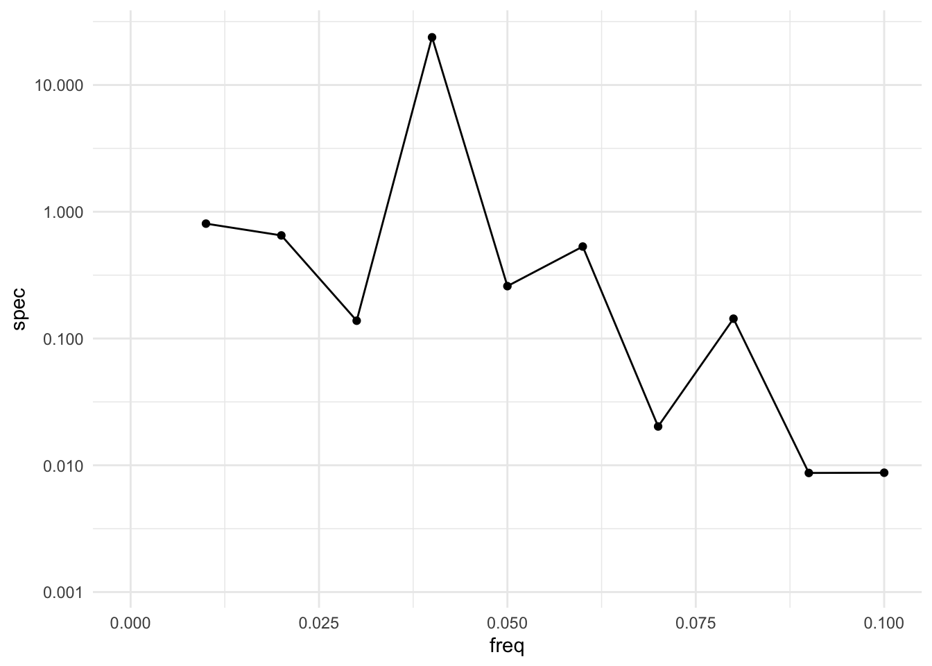 Note also that the y-axis is presented on a log scale, which is conventional for a plot of the raw periodogram.