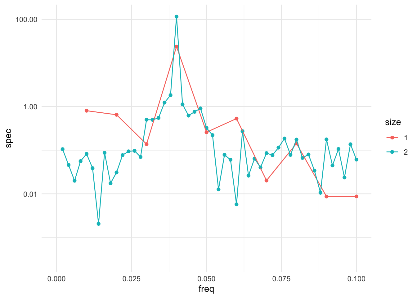 If we look more carefully at the spectrum, there is a large spike at frequency \(0.00278\), which comes out to a cycle with a period of \(1/0.00278 \approx 360\) days. Hence, we have re-discovered the annual cycle in the temperature data that we found previously with the linear model with the cosine terms.