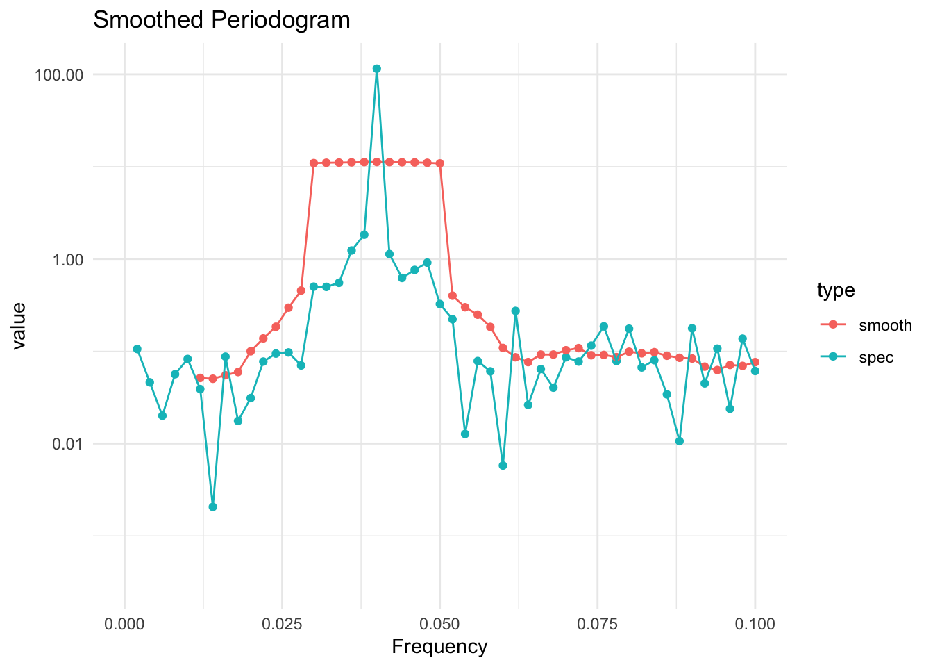 However, it turns out there is a simple way to produce a consistent estimate of \(I(\omega_p)\), and that is to smooth the estimate by averaging values of \(\hat{I}(\omega_p)\) with values at neighboring frequencies. This simple averaging is sufficient to produce an estimate whose variability goes to zero as \(n\rightarrow\infty\).