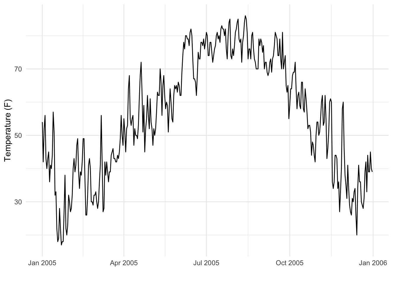 Consider the plot below, which shows daily average temperature for the city of Baltimore, MD in 2005.