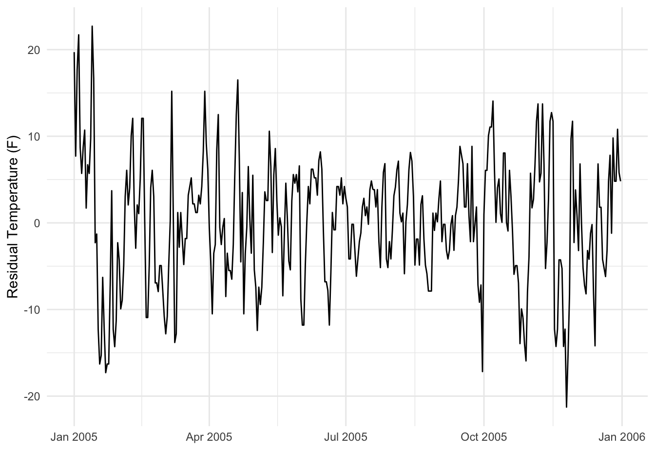 The bottom line here is that the temperature series had a strong fixed effect, which was the seasonal pattern. After removing that fixed effect we could make a somewhat better argument that the residual variation was stationary. In traditional regression settings we might assume that the residual variation is independent and identically distributed (iid), but in the time series context, there might be some residual autocorrelation remaining, even if the series is stationary.
