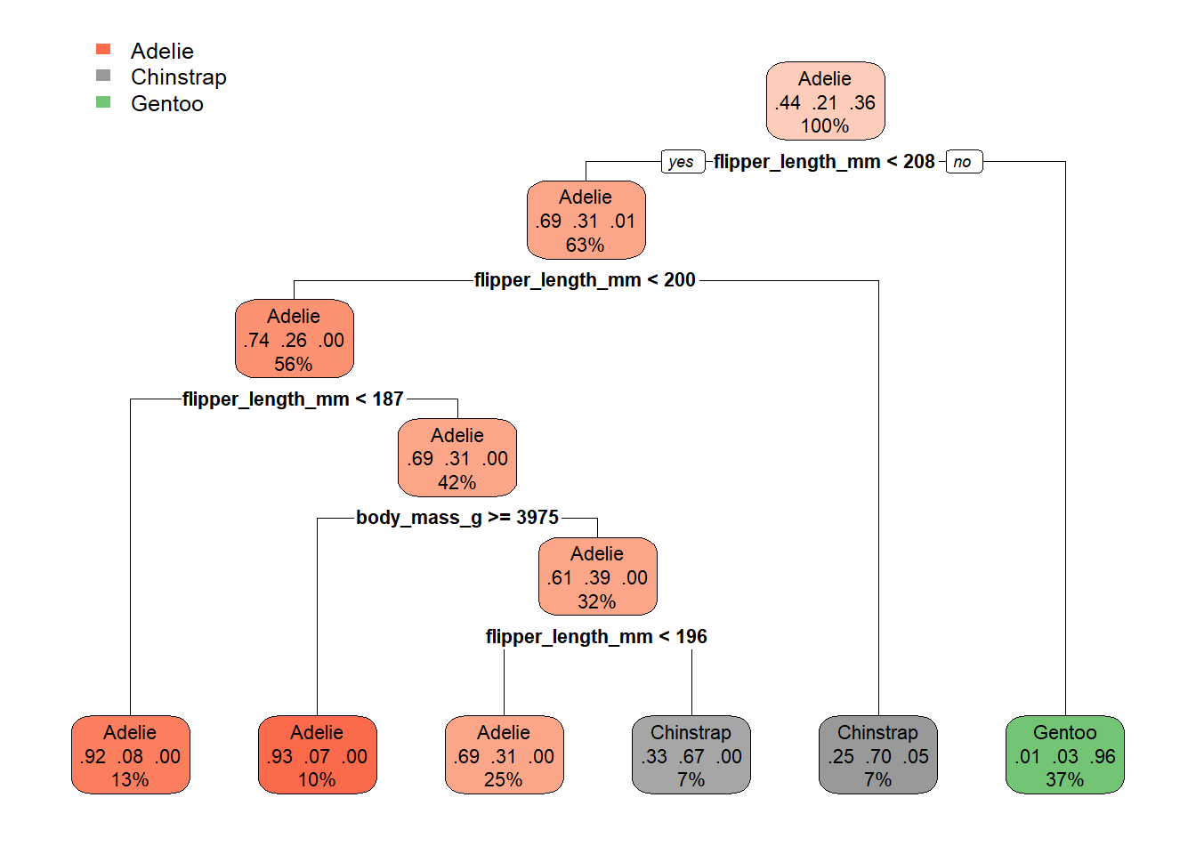 For example, the bottom left node here classifies 13% of the penguins in the ml_penguin_train data set as Adelie penguins, with 92% of this subset of penguins actually being Adelie penguins, 8% actually being Chinstrap penguins, and 0% being Gentoo penguins.