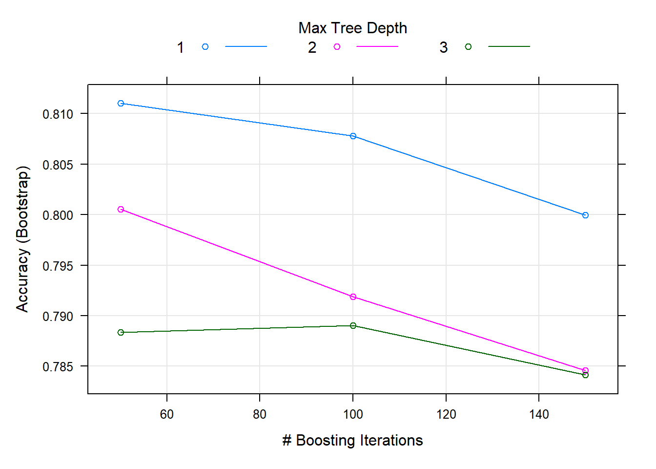 Here we can see that the method has been carried out using different combinations of tuning parameters - which here include the number of training iterations to conduct (trees), the complexity of the trees (interaction.depth), and the adaptability or learning rate of the algorithm (shrinkage).