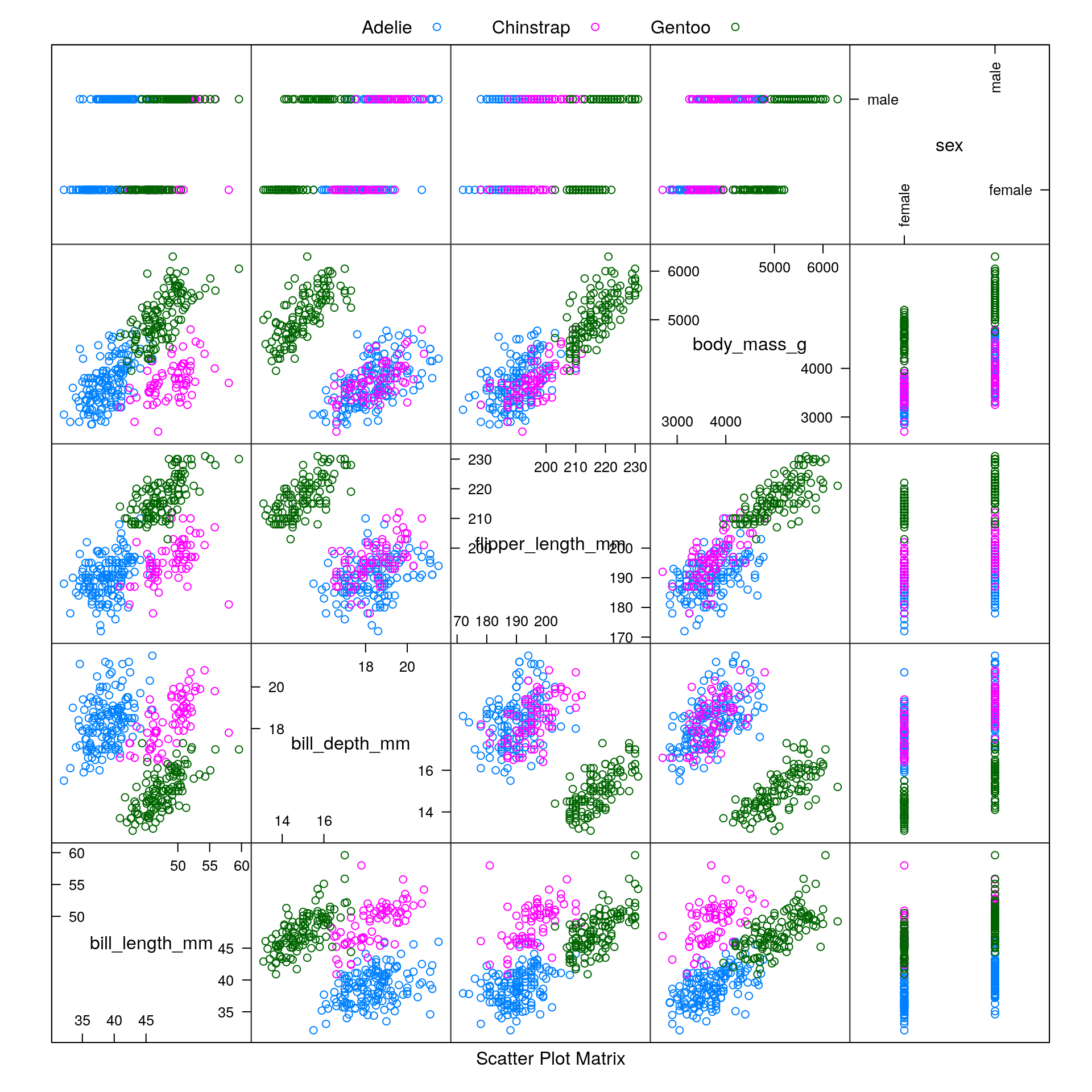 However, it is worthwhile to note that the caret package offers several options for visualising data, via the featurePlot function. Here we use this function (with the argument plot = "pairs") to produce a scatter plot matrix of the different feature variables we are using, coloured by penguin species.