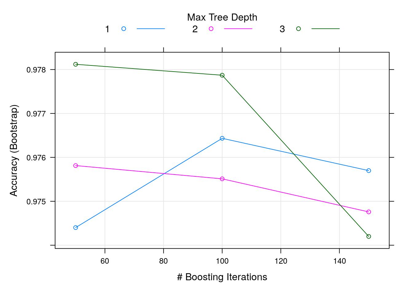 Here we can see that the method has been carried out using different combinations of tuning parameters - which here include the number of training iterations to conduct (trees), the complexity of the trees (interaction.depth), and the adaptability or learning rate of the algorithm (shrinkage).