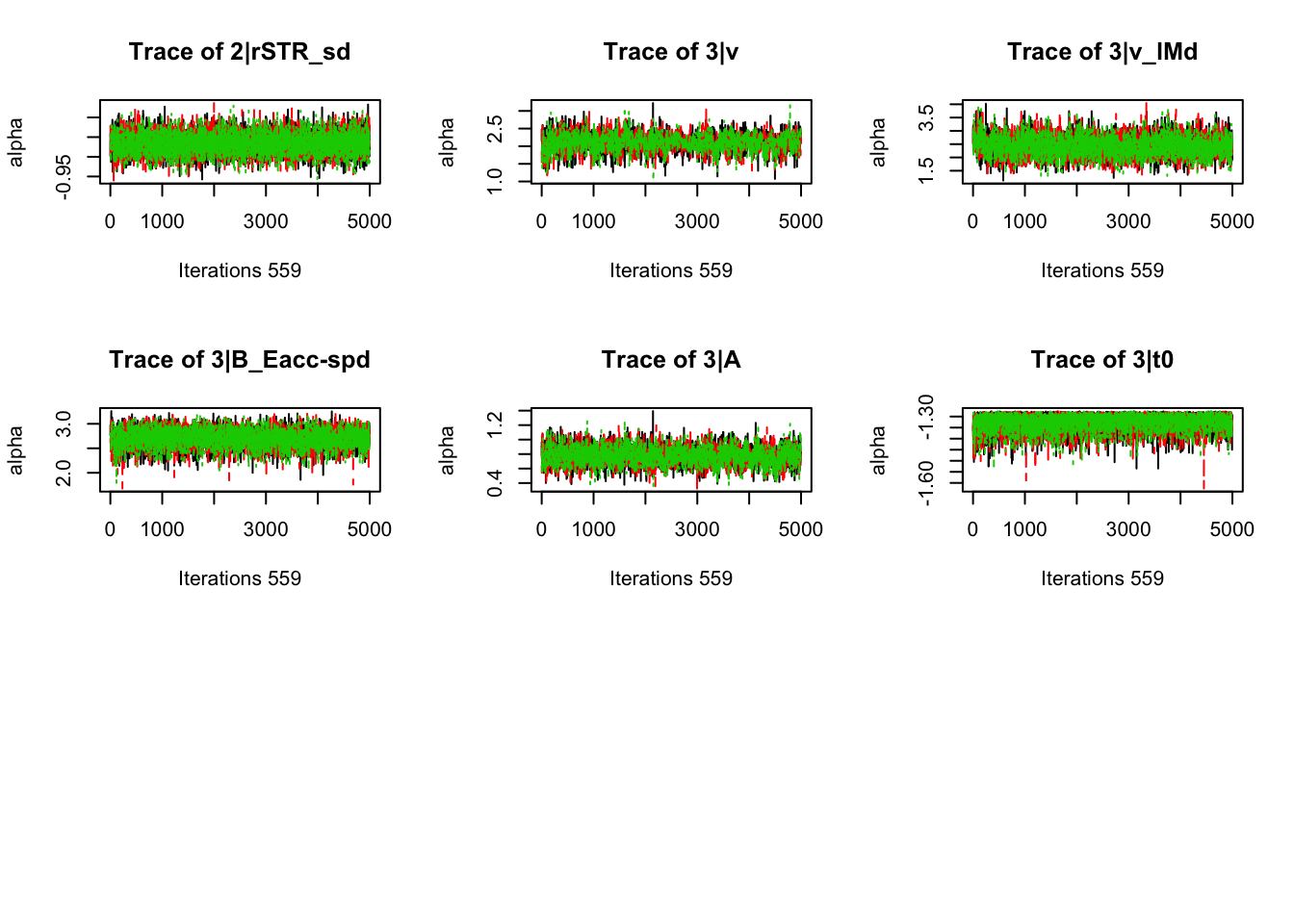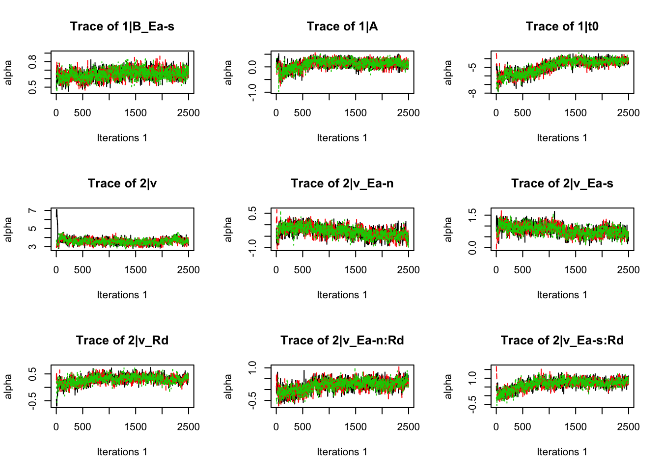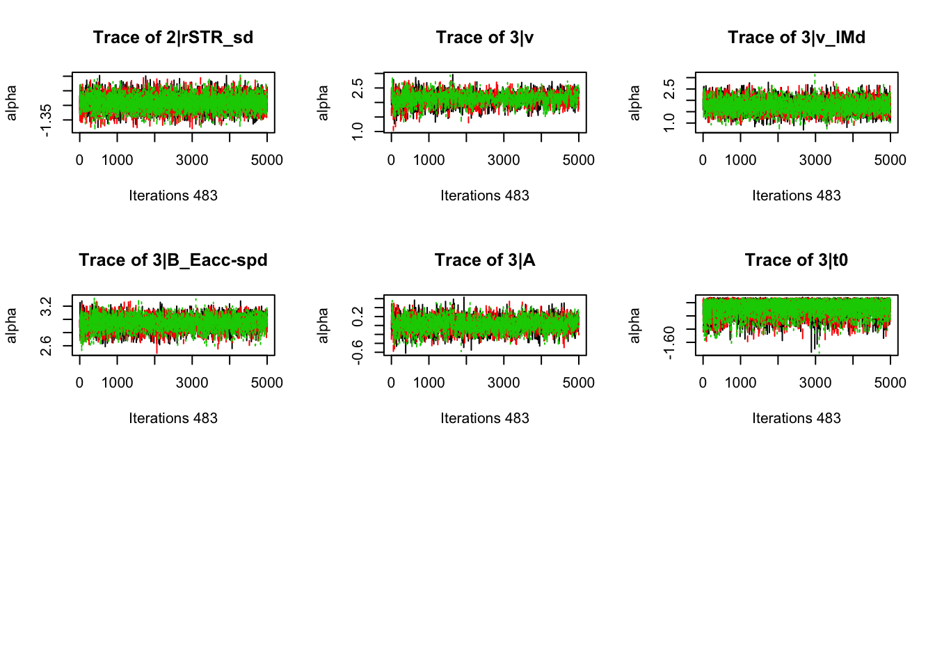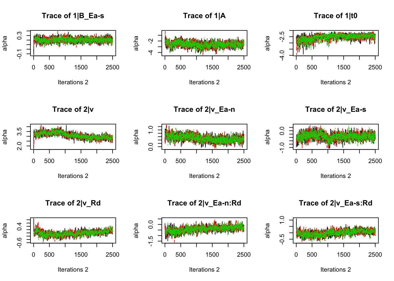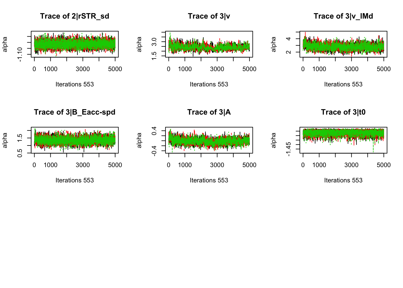 samples <- run_emc(samplers, nsample = 2500, cores_for_chains = 1, cores_per_chain = 20, verbose = T, verbose_run_stage = T)Let’s load in the pre-sampled data instead;