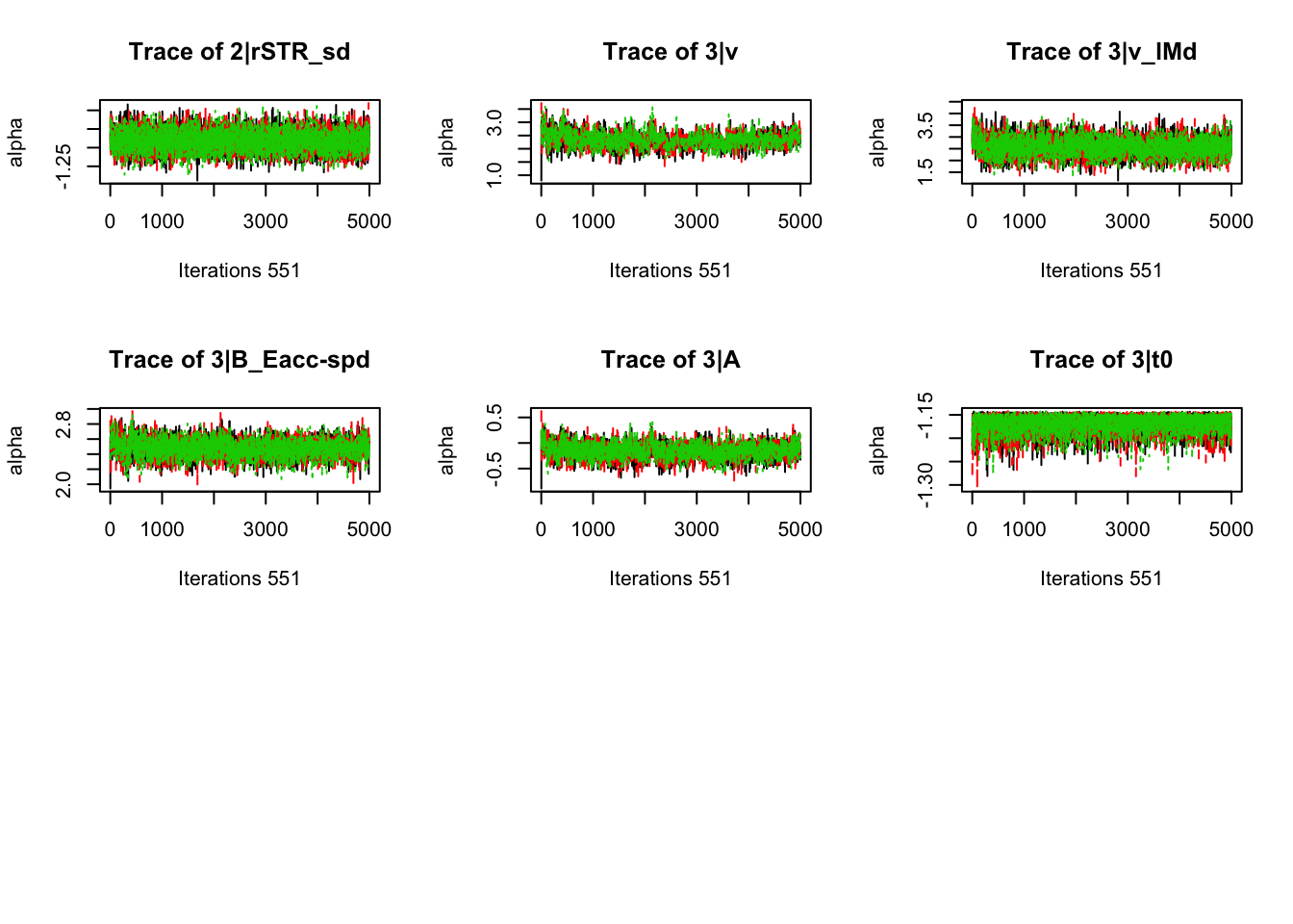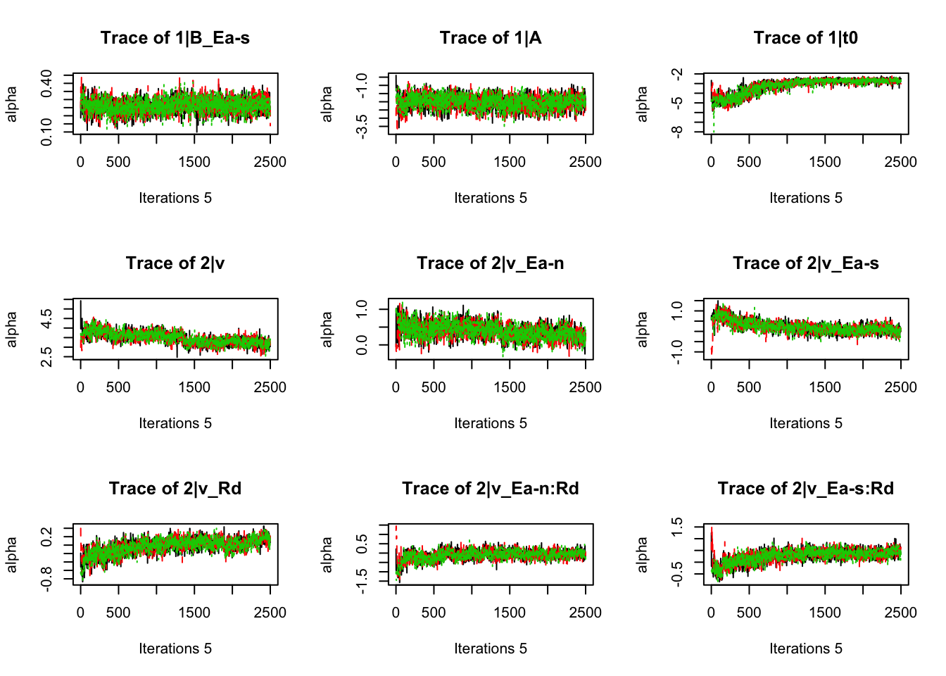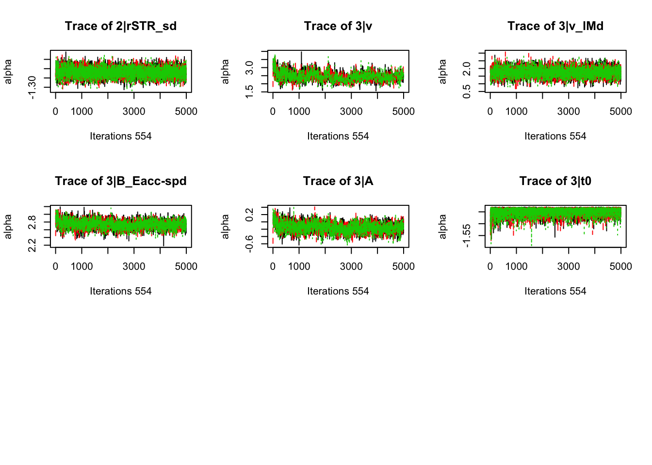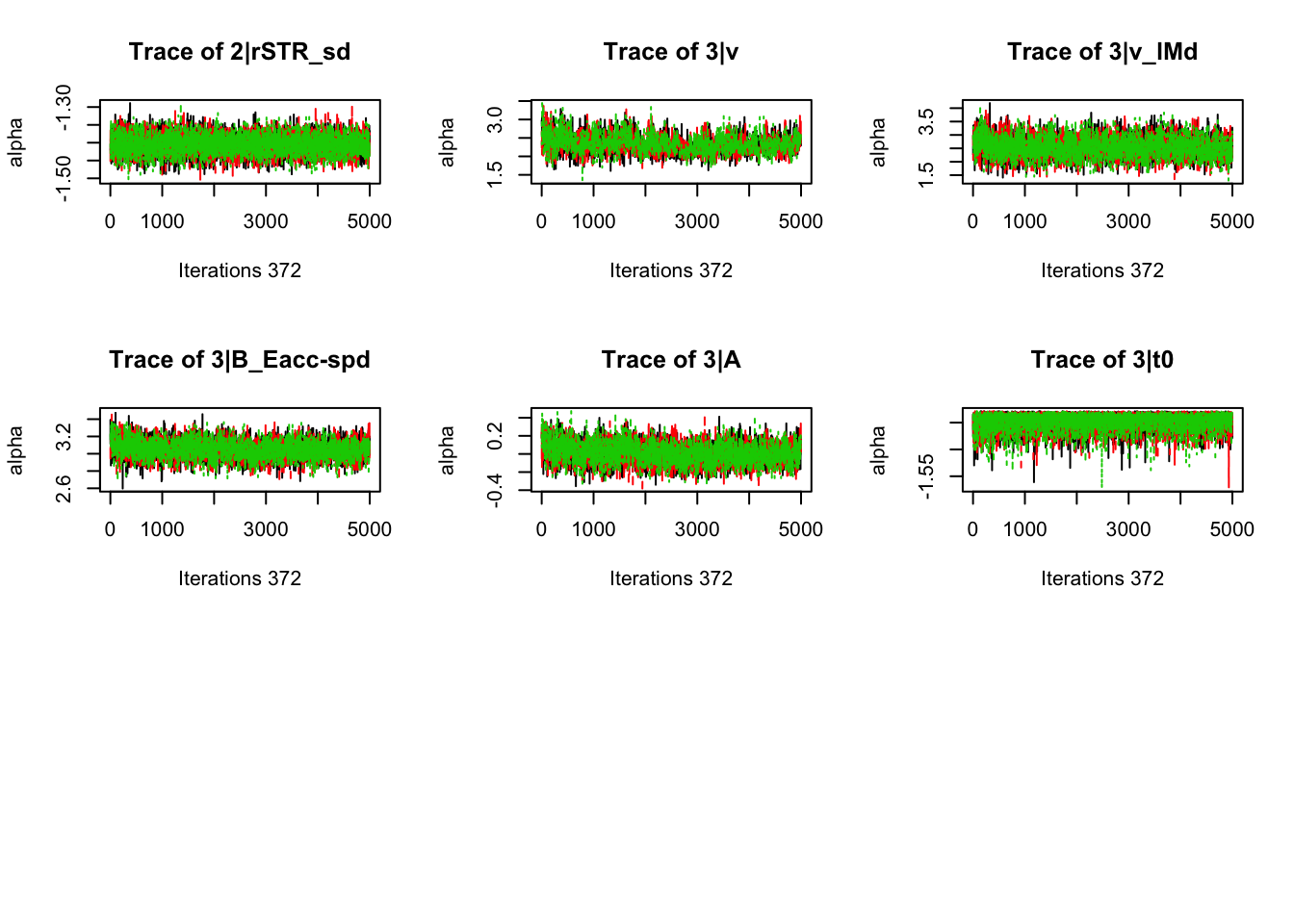 samples <- run_emc(samplers, nsample = 2500, cores_for_chains = 1, cores_per_chain = 20, verbose = T, verbose_run_stage = T)Let’s load in the pre-sampled data instead;