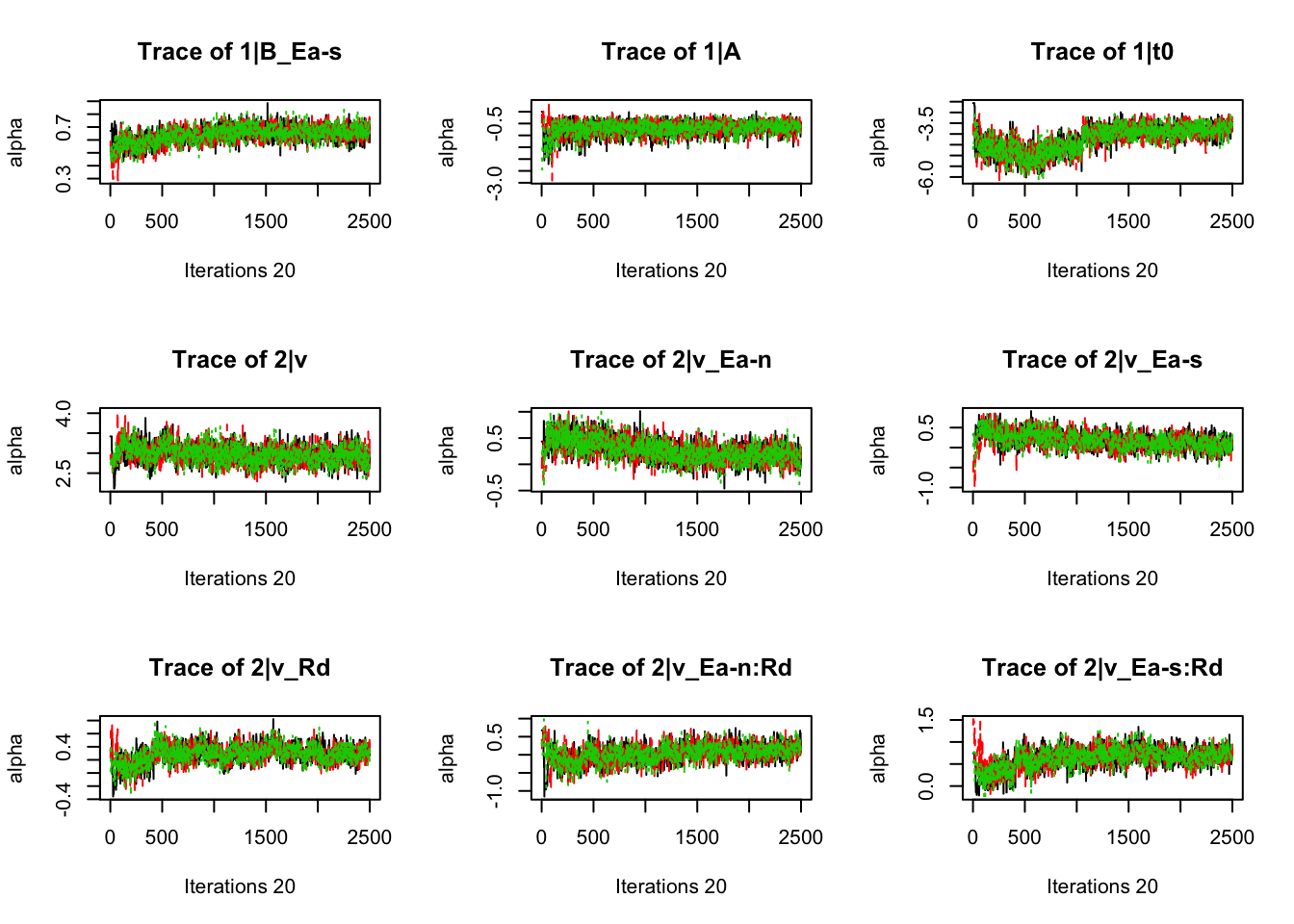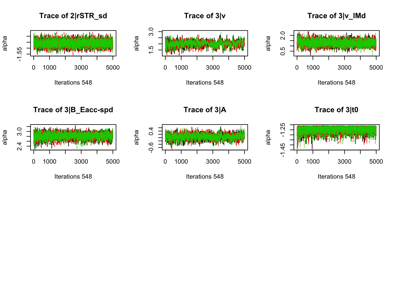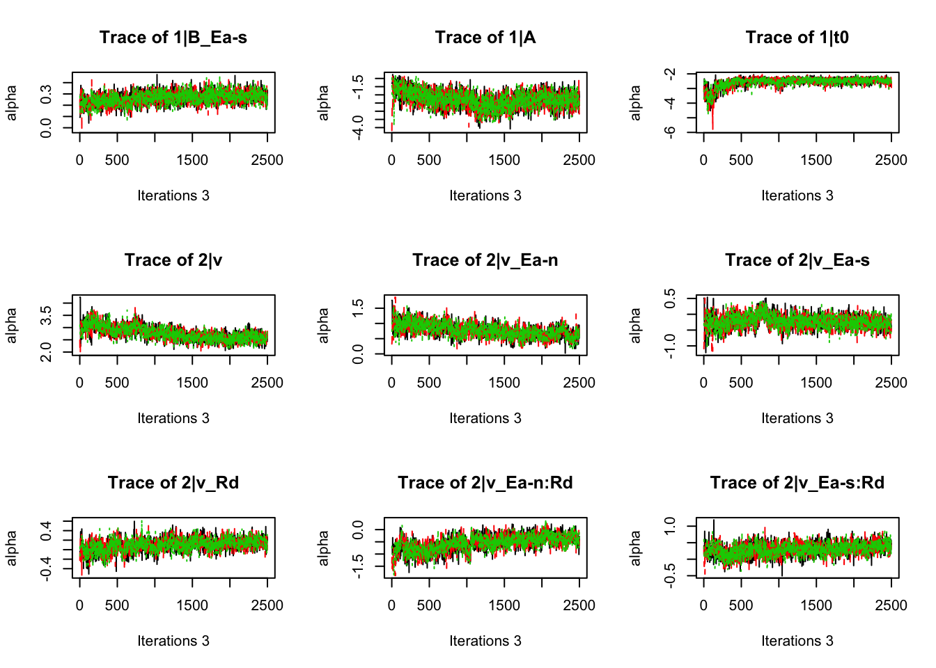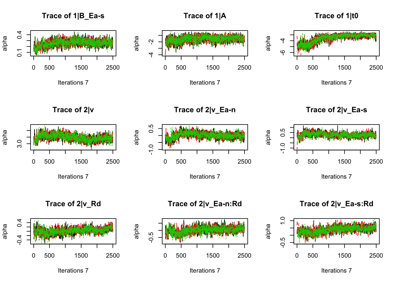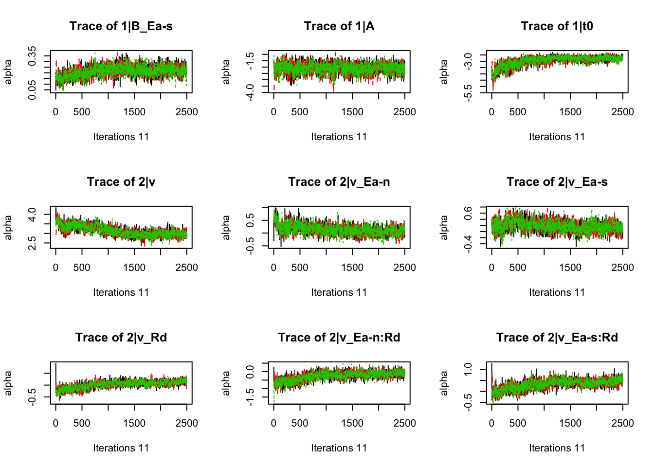 samples <- run_emc(samplers, nsample = 2500, cores_for_chains = 1, cores_per_chain = 20, verbose = T, verbose_run_stage = T)Let’s load in the pre-sampled data instead;