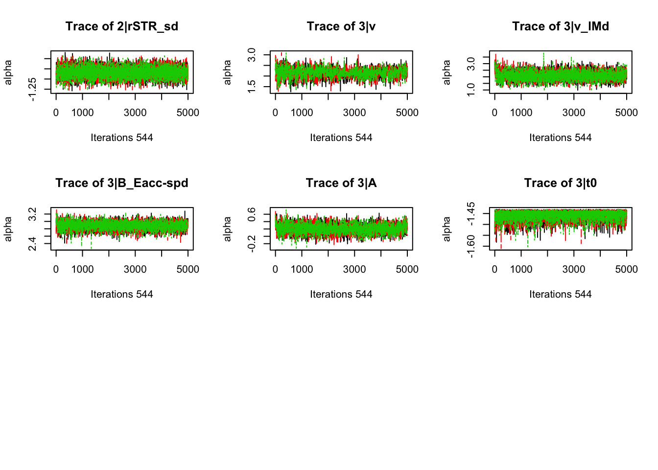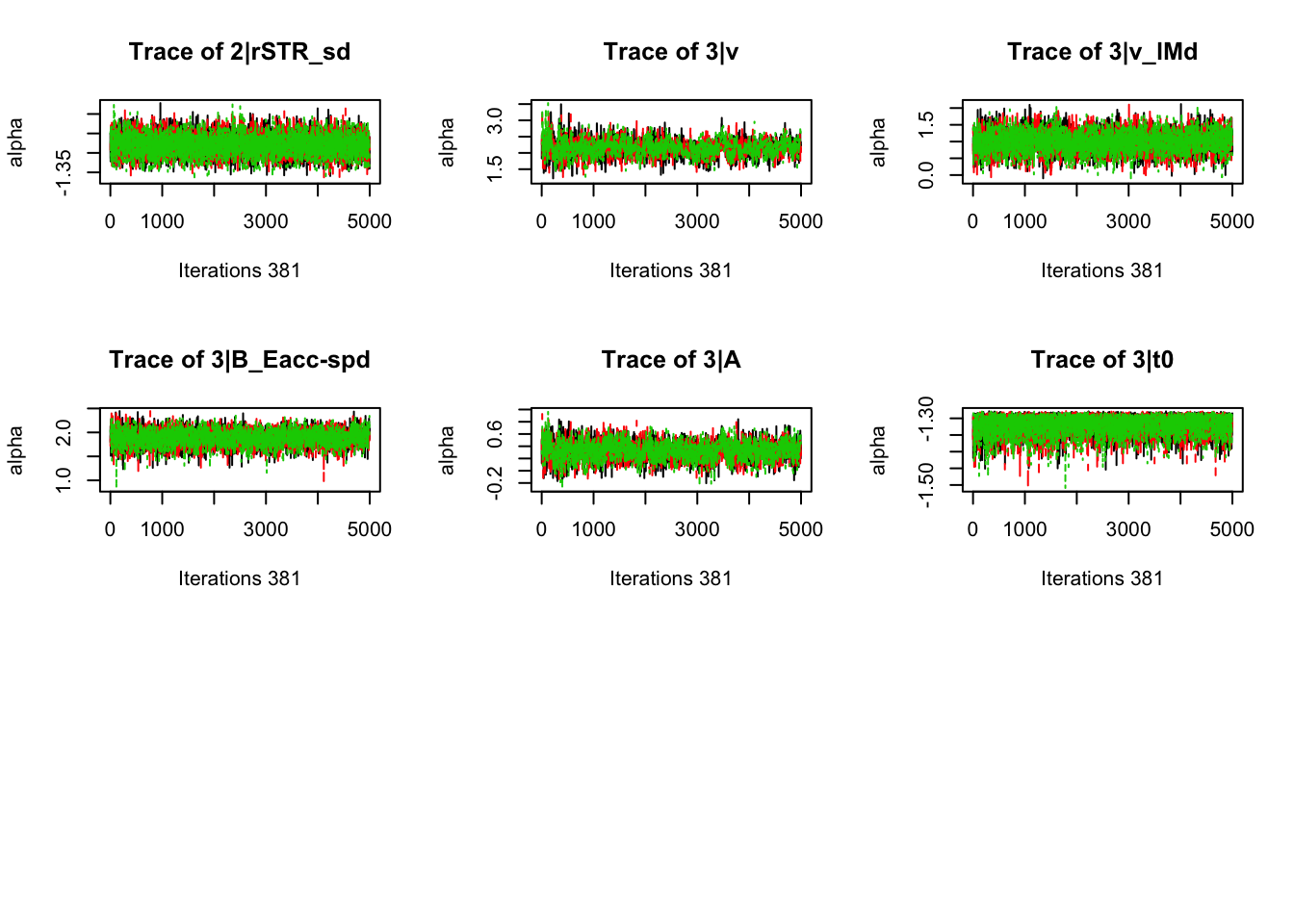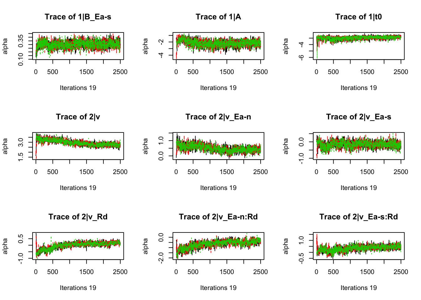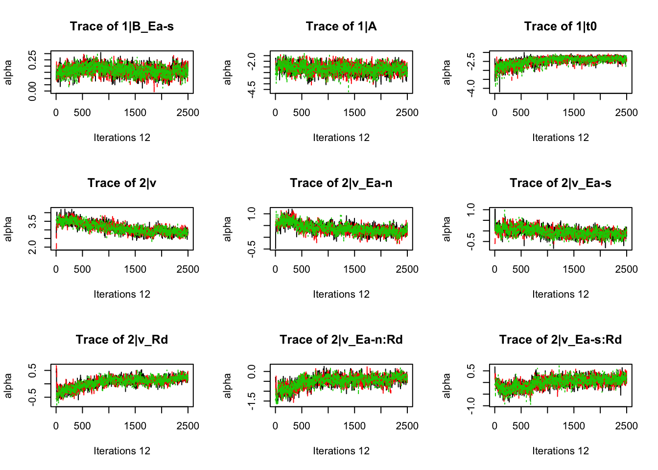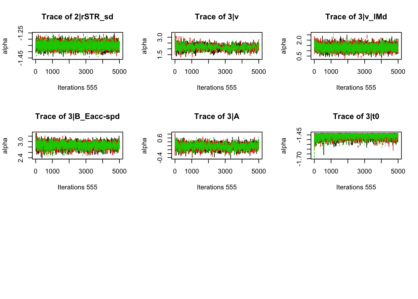 samples <- run_emc(samplers, nsample = 2500, cores_for_chains = 1, cores_per_chain = 20, verbose = T, verbose_run_stage = T)Let’s load in the pre-sampled data instead;