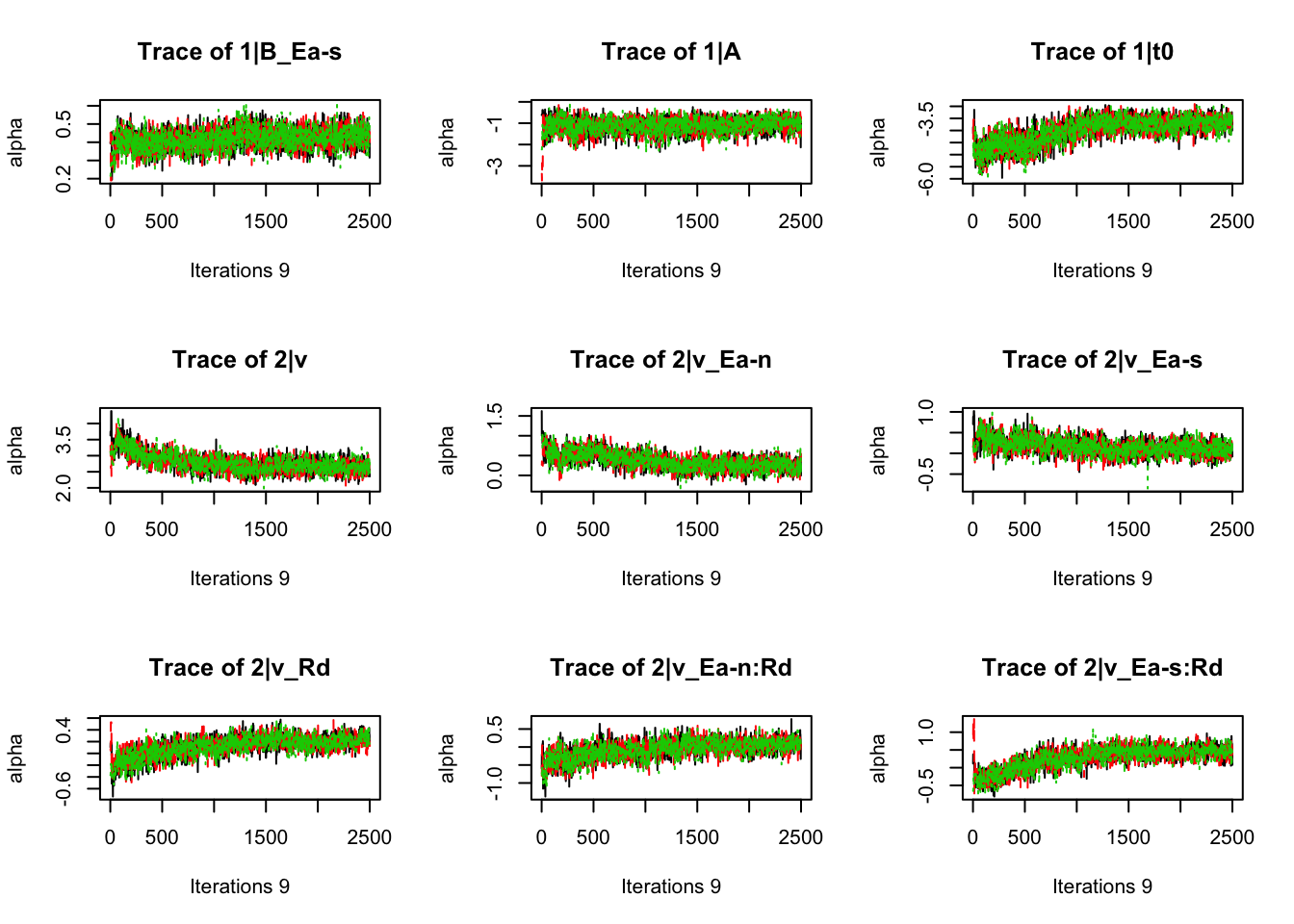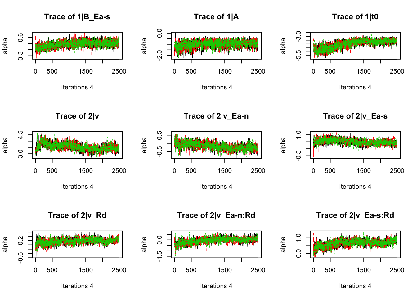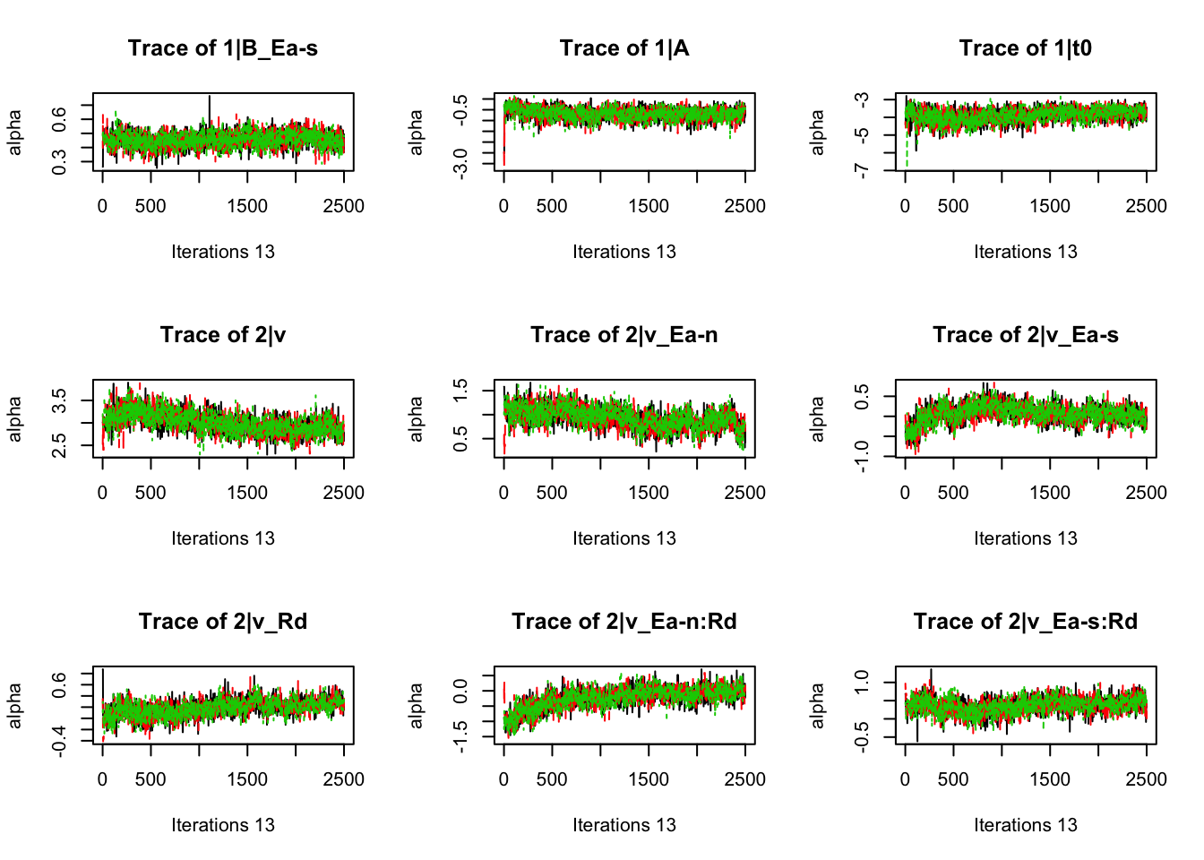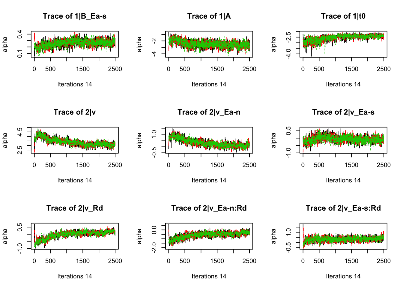 samples <- run_emc(samplers, nsample = 2500, cores_for_chains = 1, cores_per_chain = 20, verbose = T, verbose_run_stage = T)Let’s load in the pre-sampled data instead;