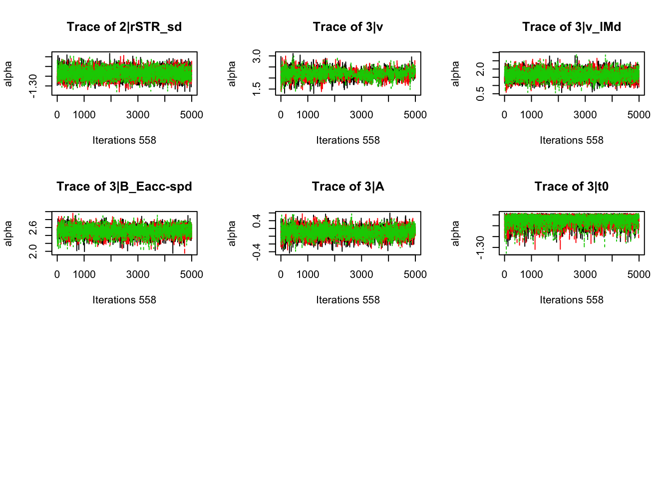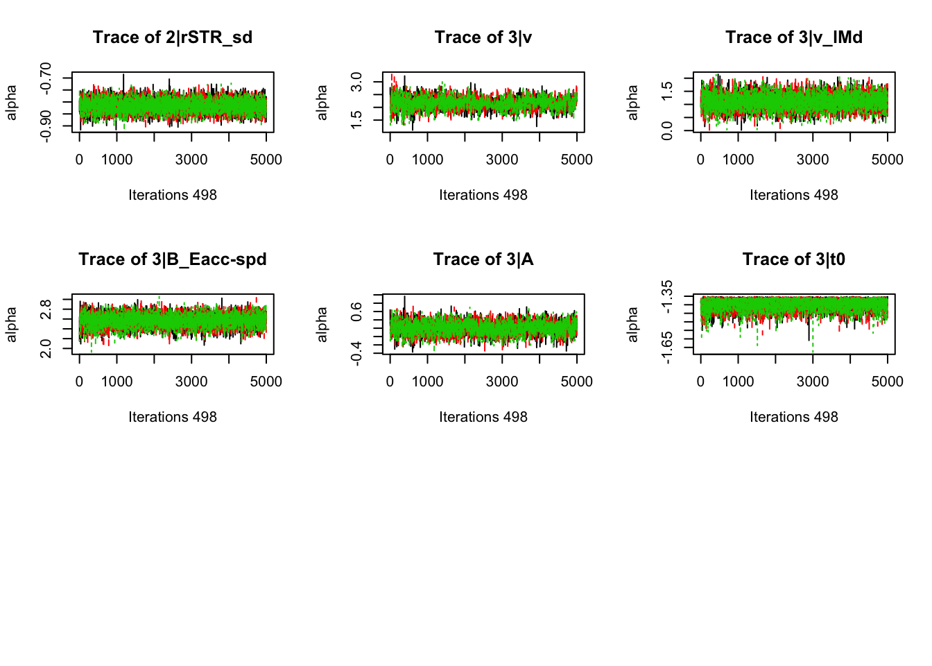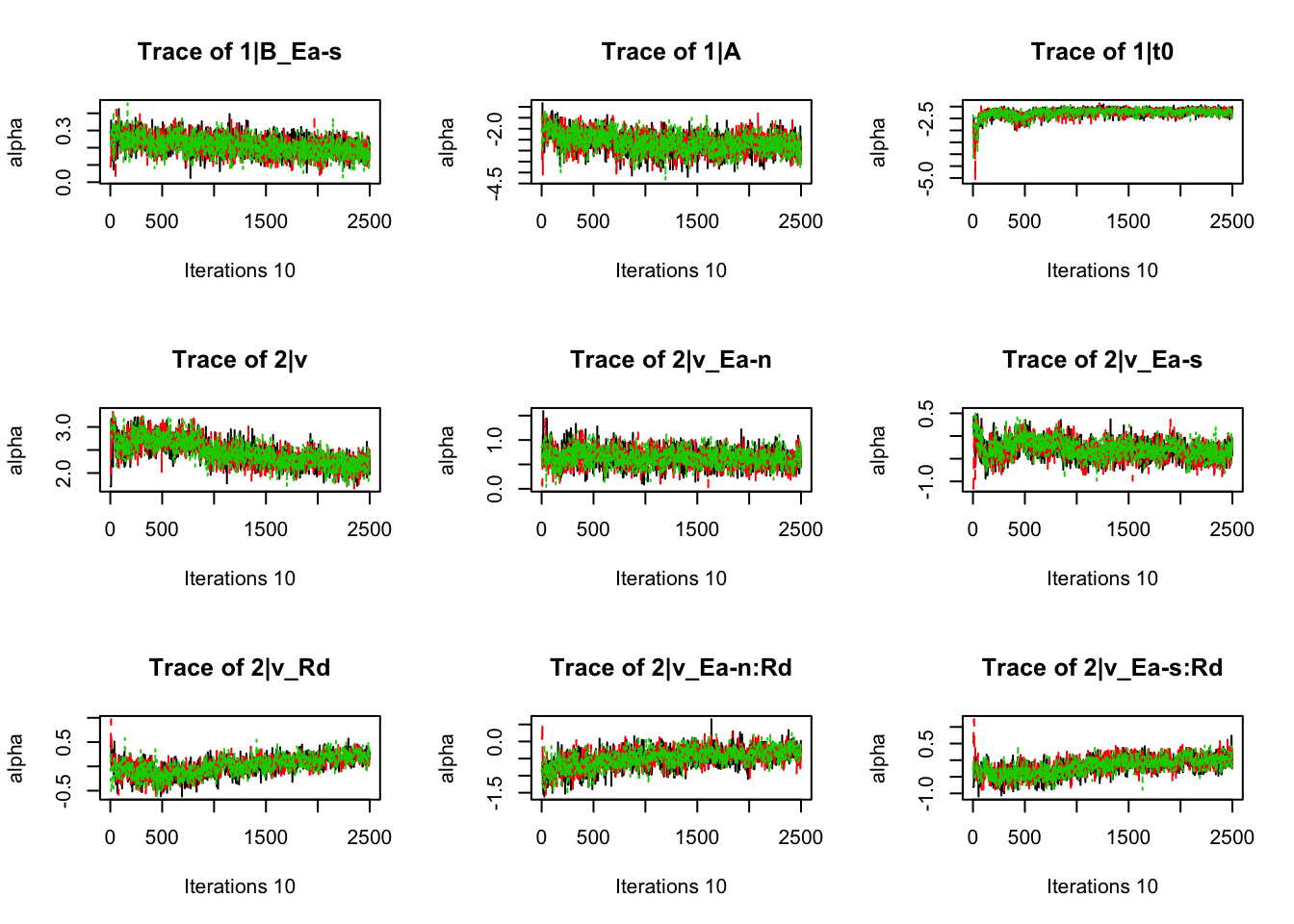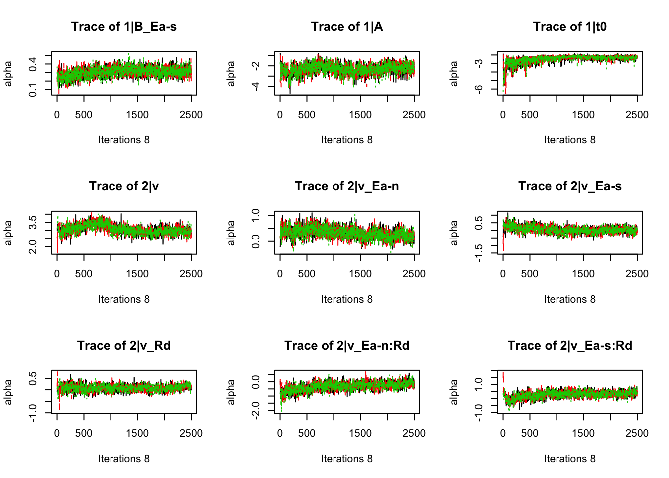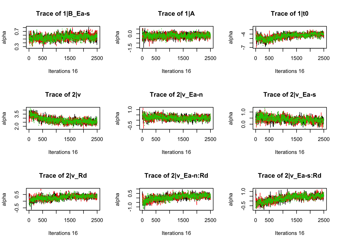 samples <- run_emc(samplers, nsample = 2500, cores_for_chains = 1, cores_per_chain = 20, verbose = T, verbose_run_stage = T)Let’s load in the pre-sampled data instead;