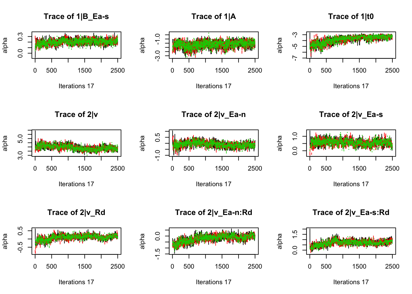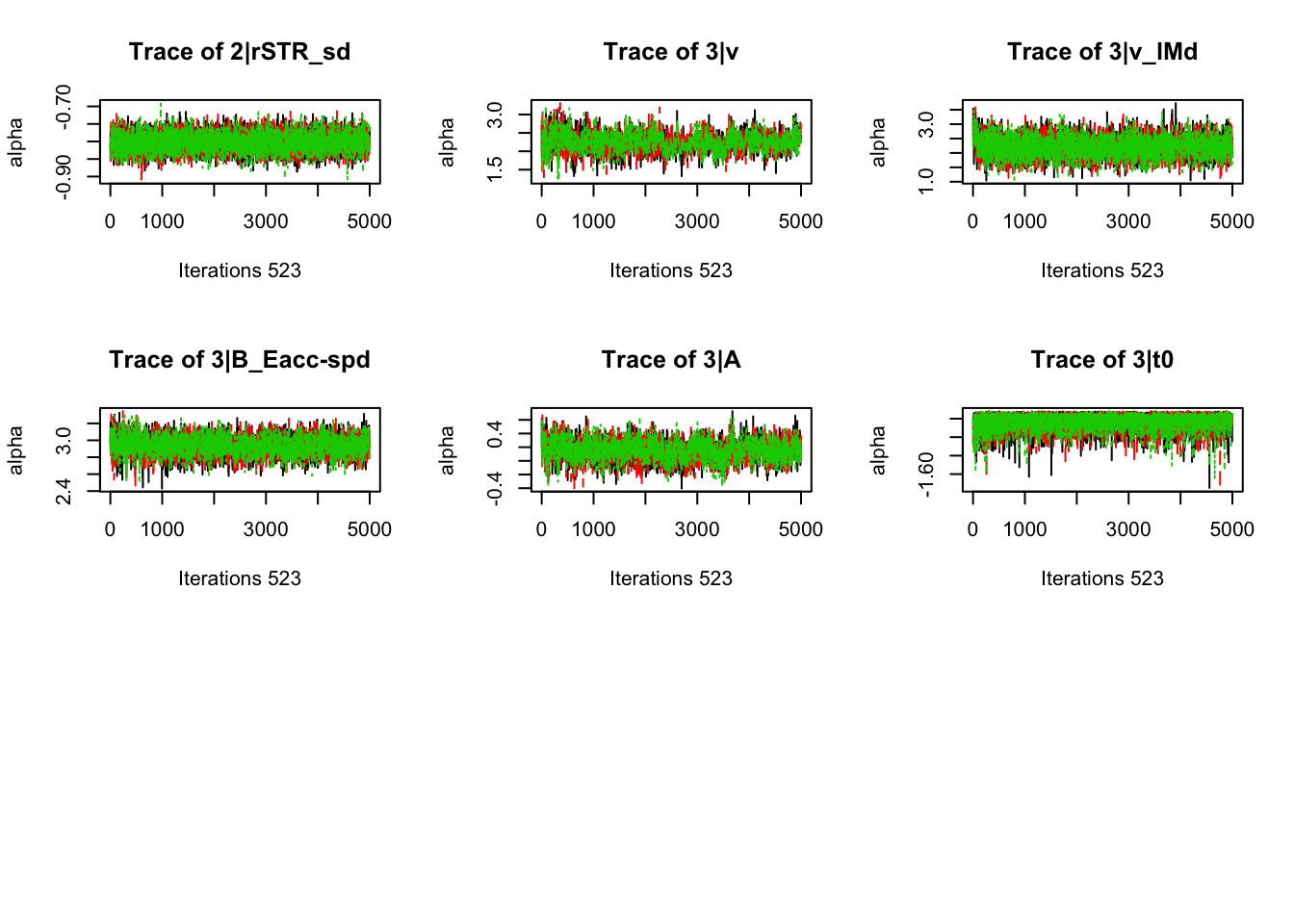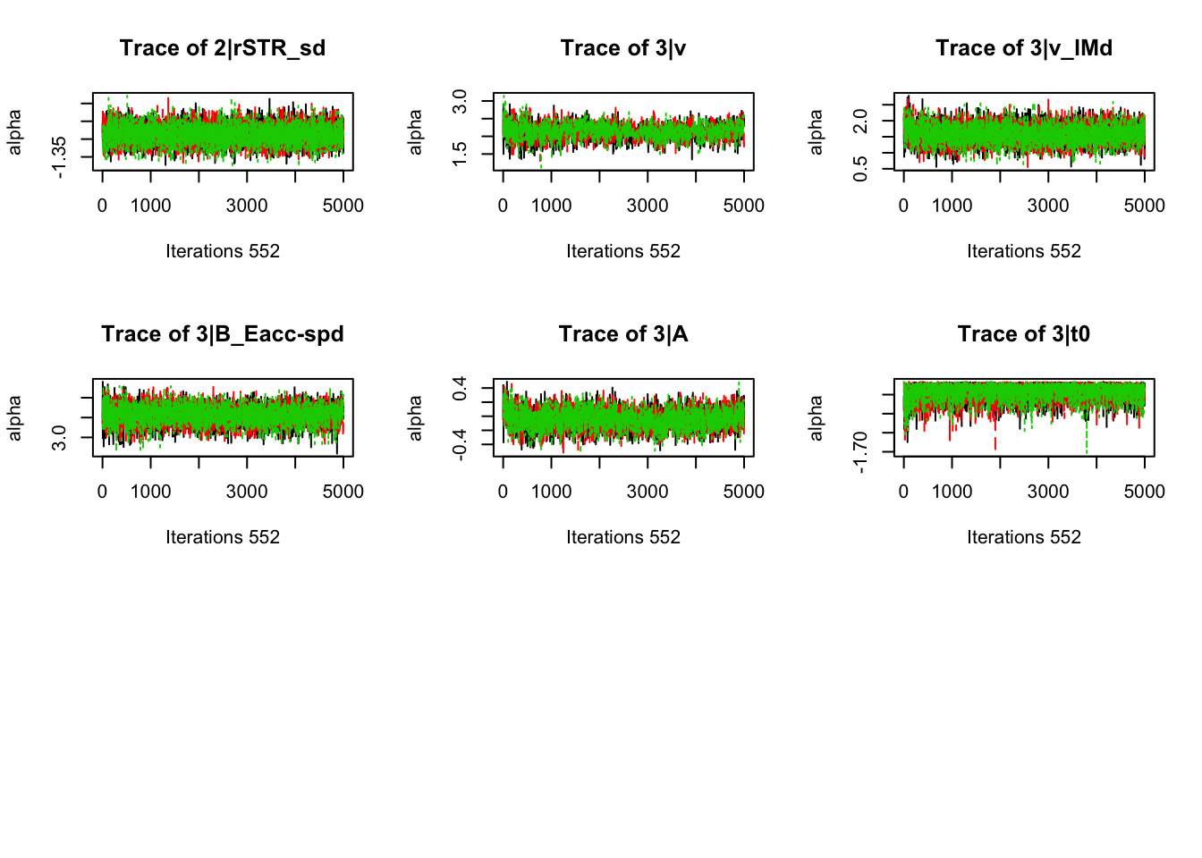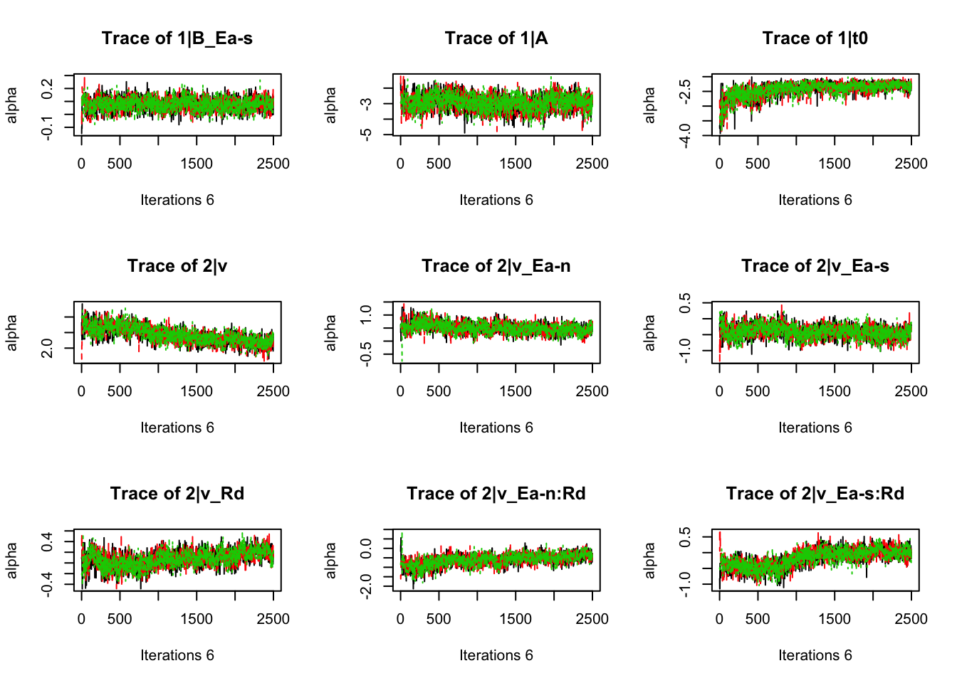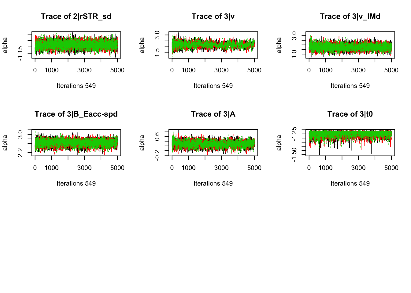 samples <- run_emc(samplers, nsample = 2500, cores_for_chains = 1, cores_per_chain = 20, verbose = T, verbose_run_stage = T)Let’s load in the pre-sampled data instead;
