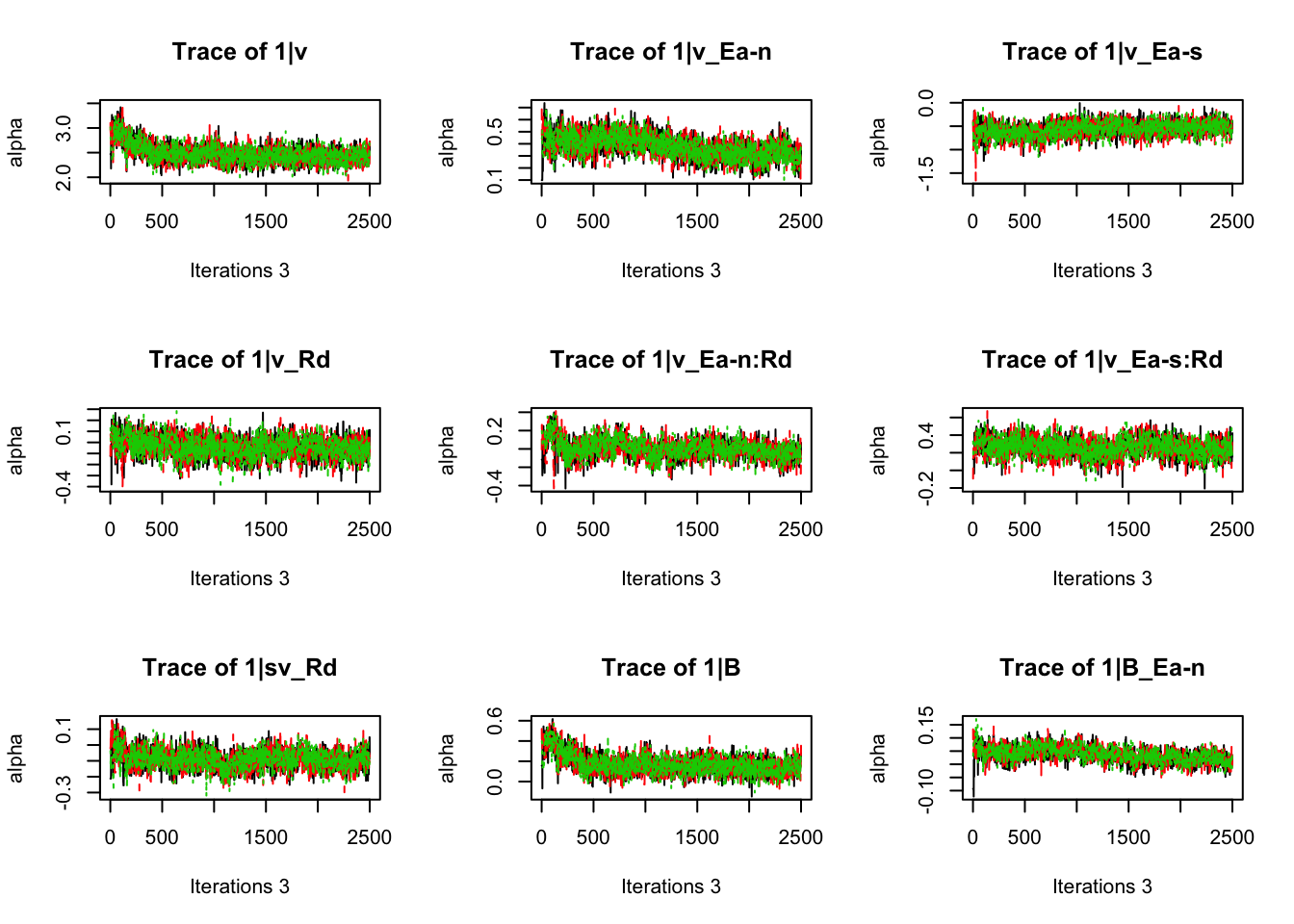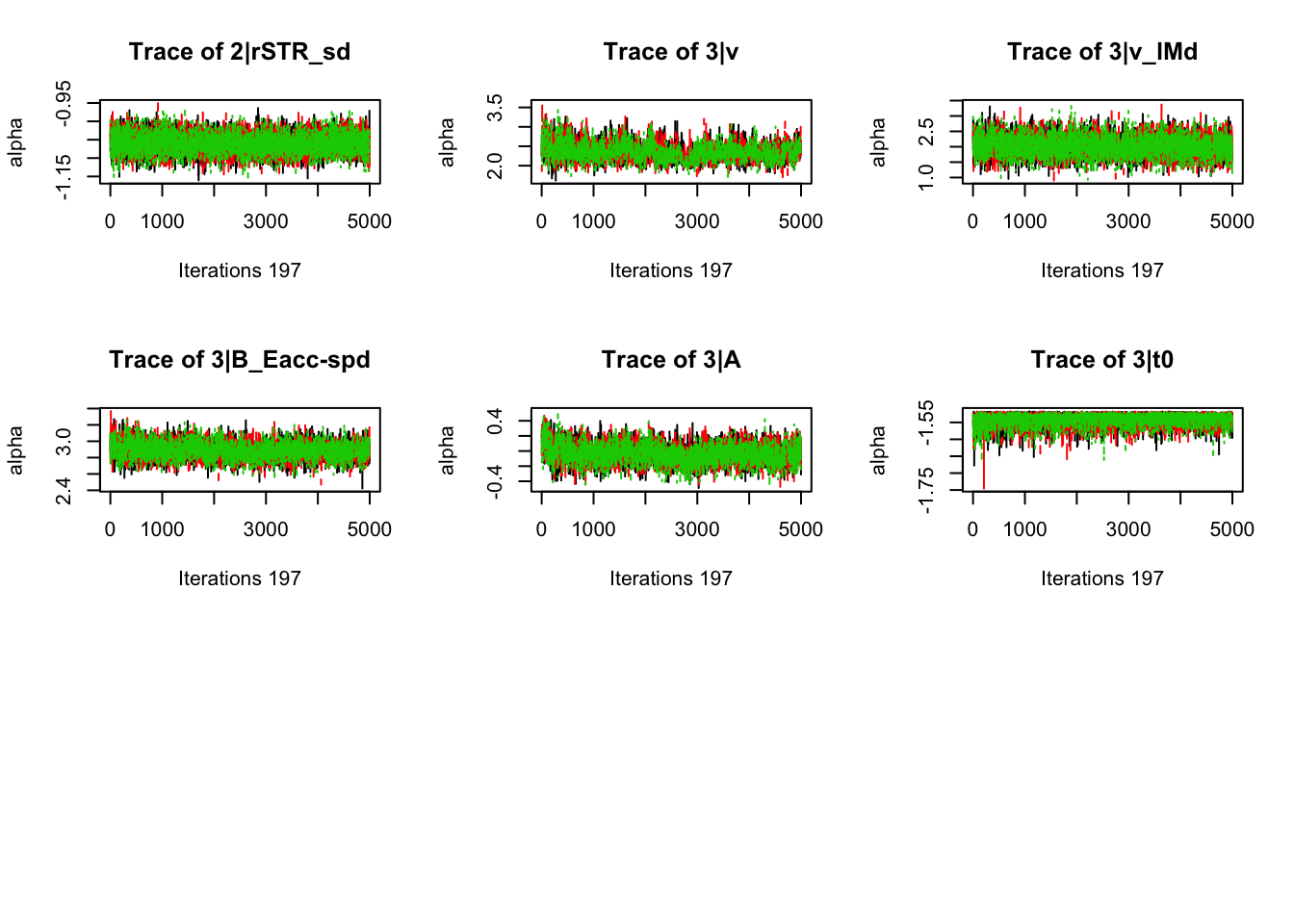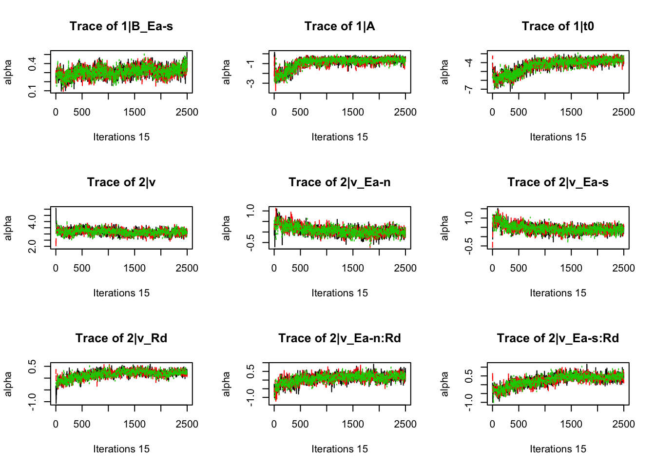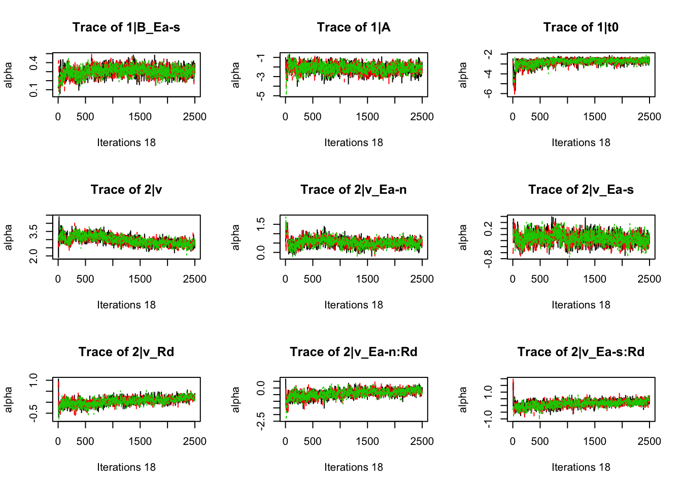 samples <- run_emc(samplers, nsample = 2500, cores_for_chains = 1, cores_per_chain = 20, verbose = T, verbose_run_stage = T)Let’s load in the pre-sampled data instead;
