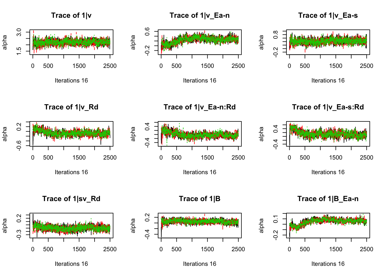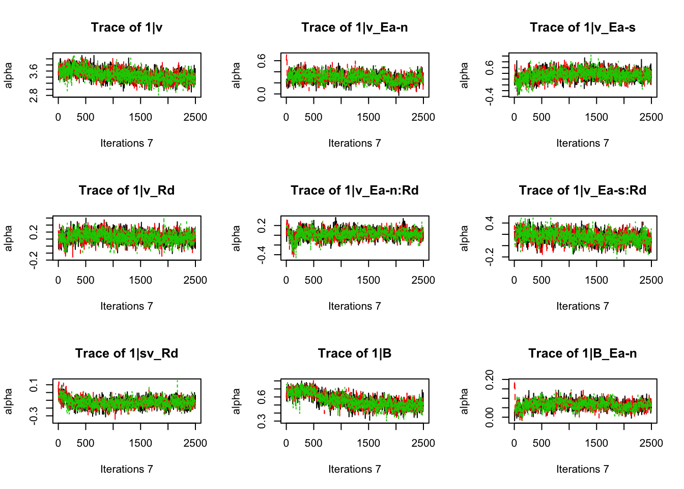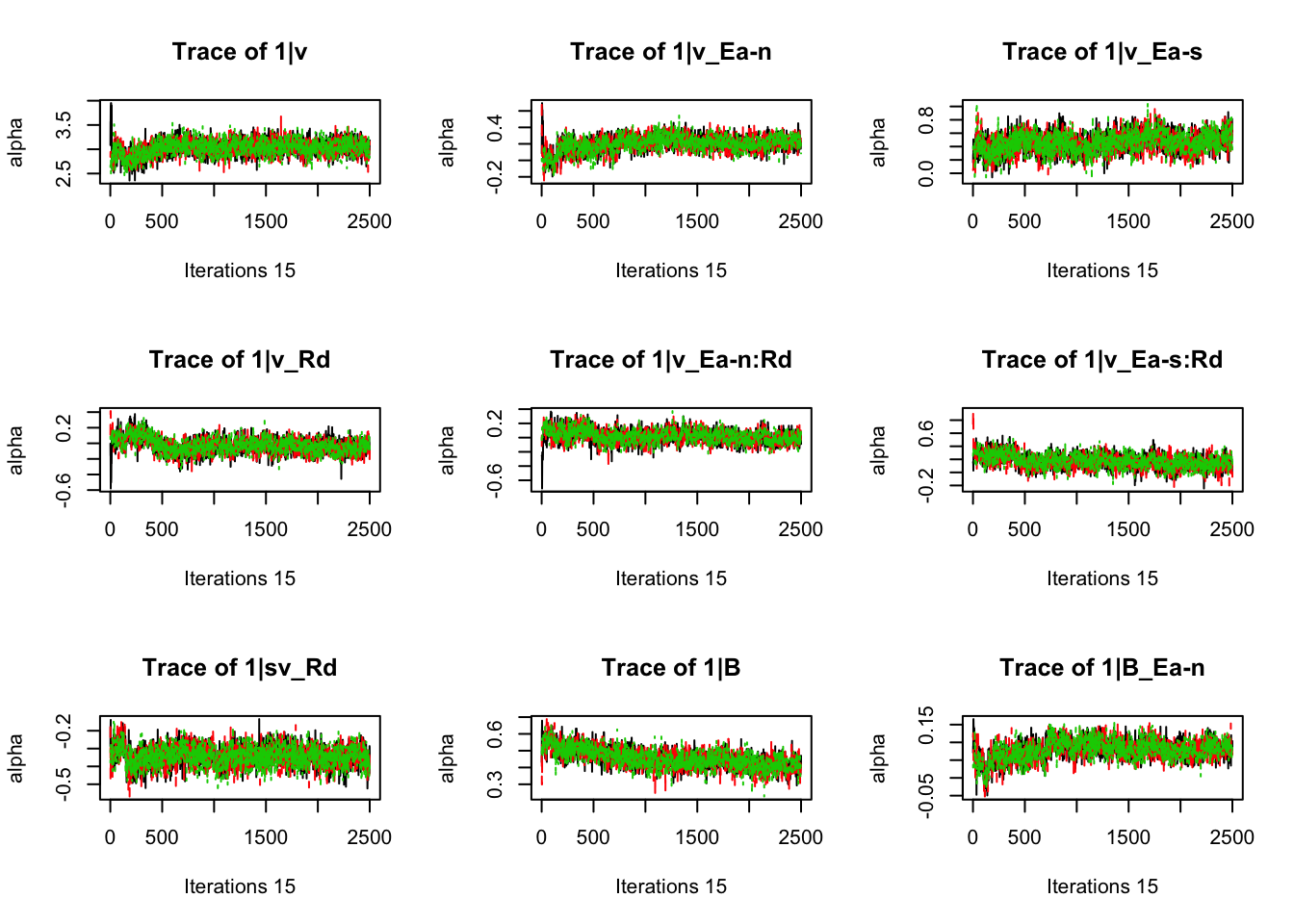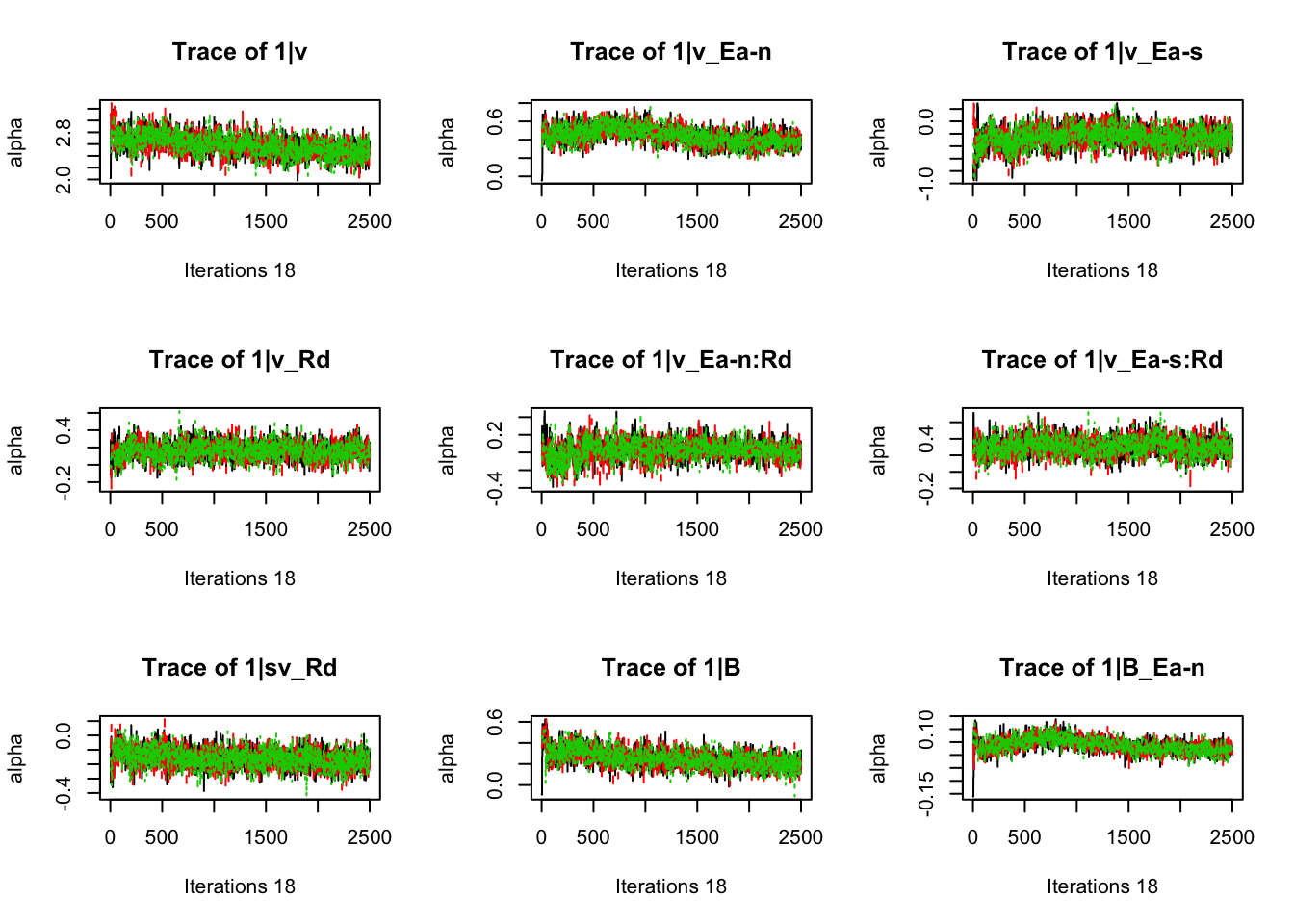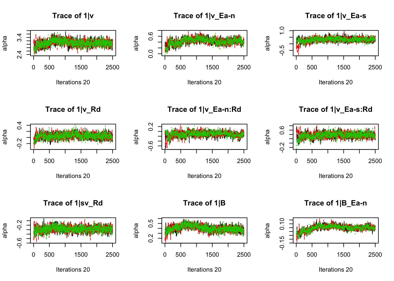samples <- run_emc(samplers, nsample = 2500, cores_for_chains = 1, cores_per_chain = 20, verbose = T, verbose_run_stage = T)Let’s load in the pre-sampled data instead;