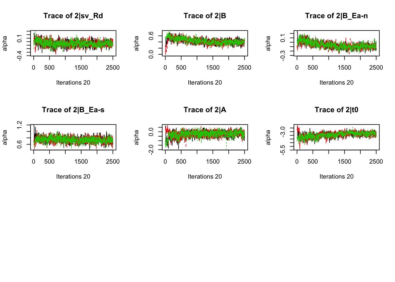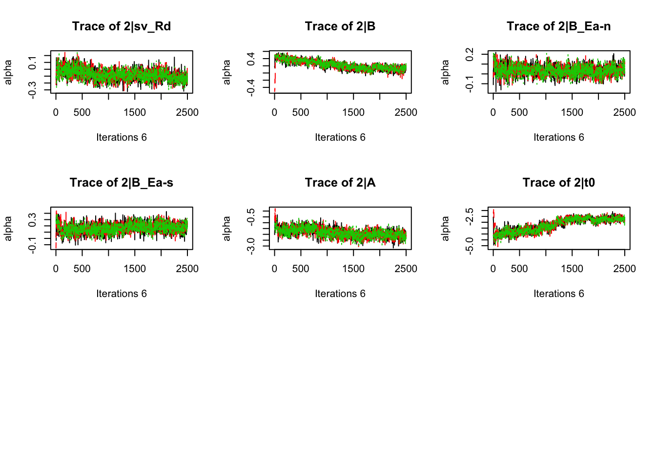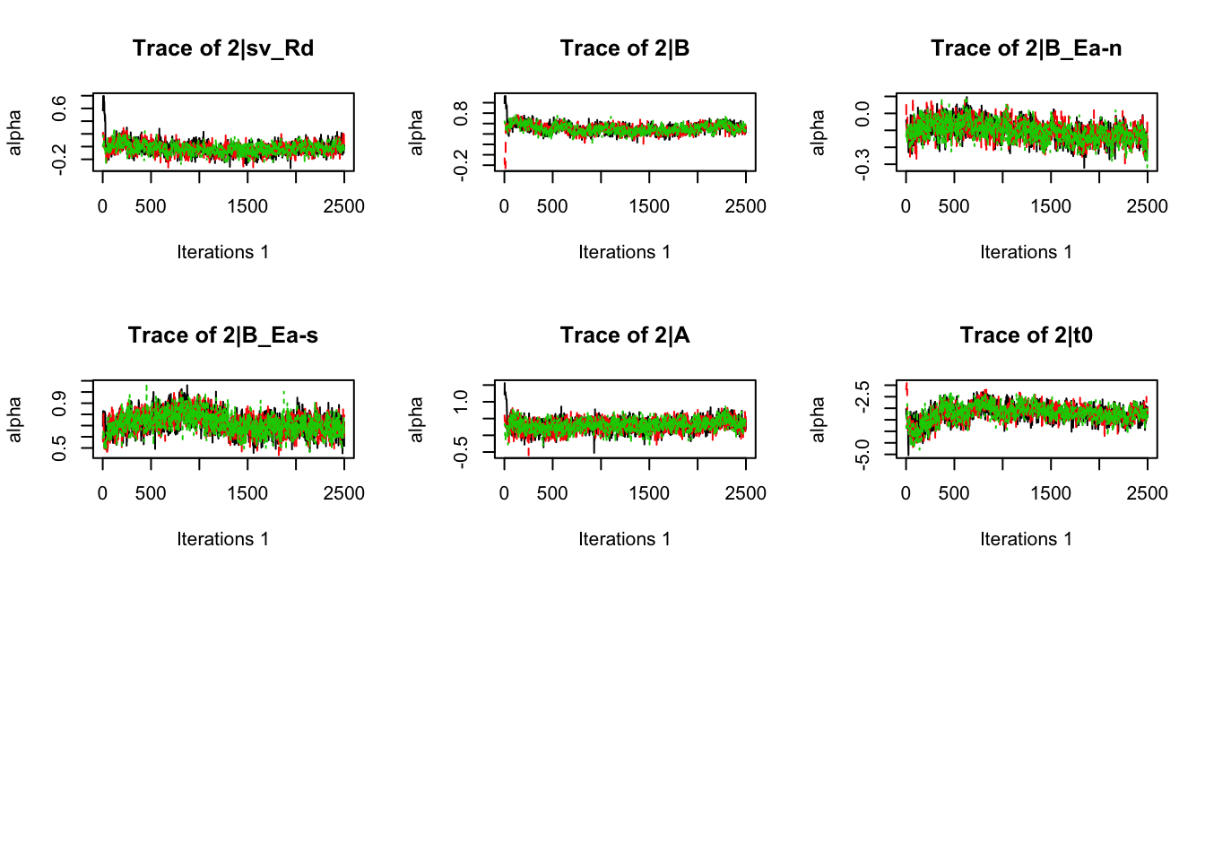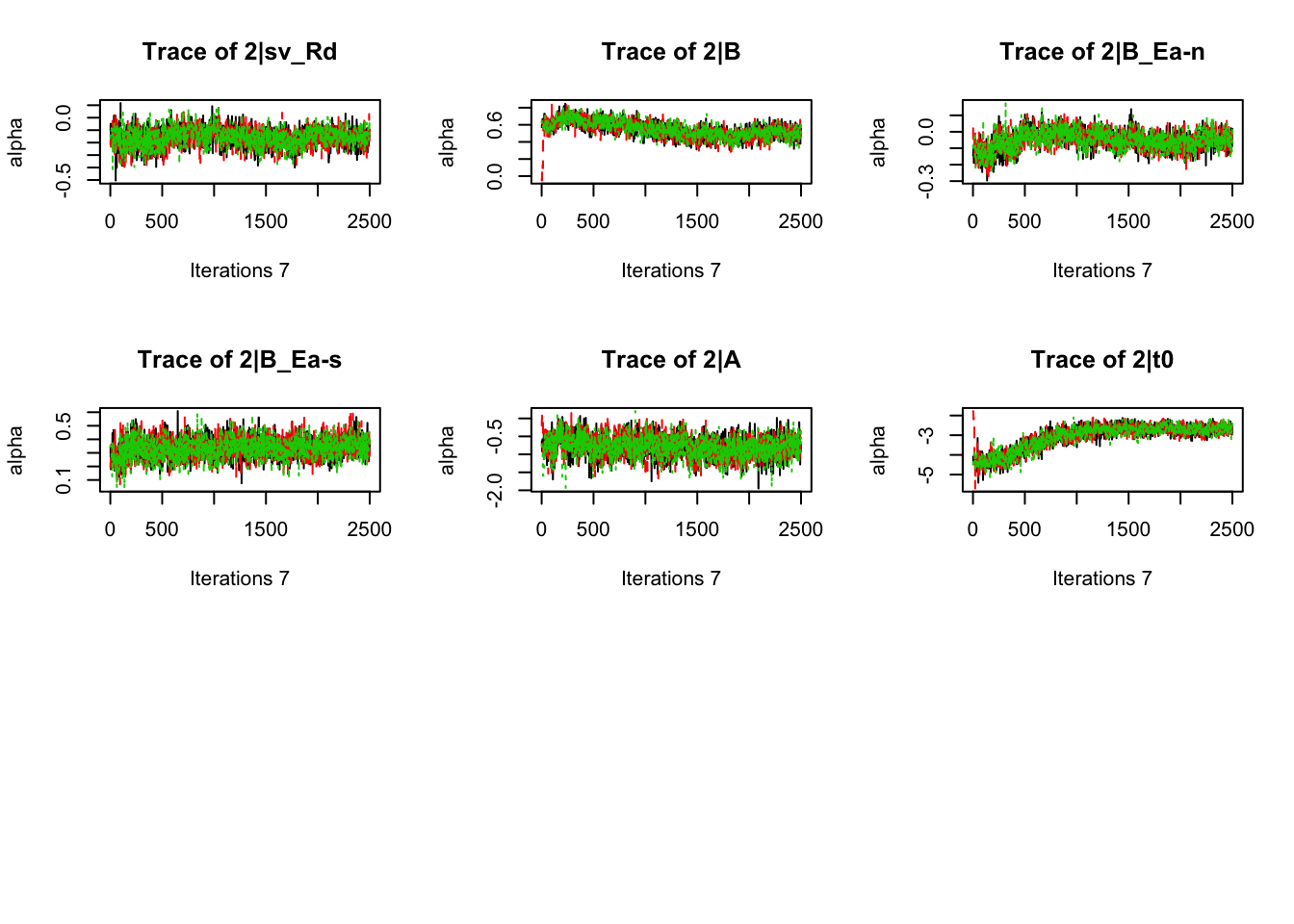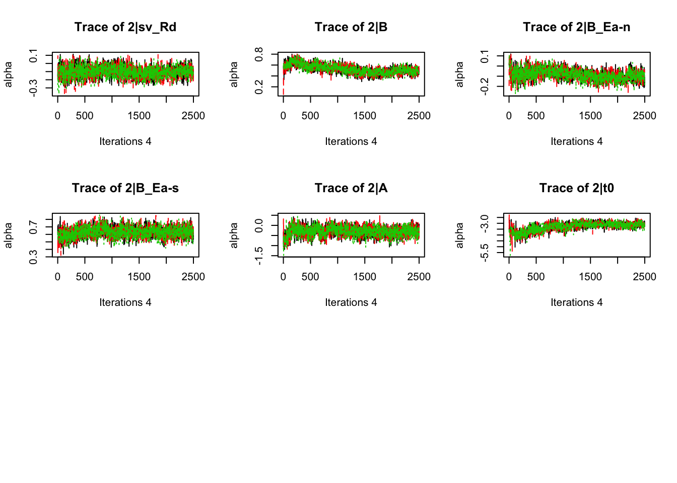 load("~/Desktop/emc_advanced/vignettes/JointModels/samples/joint_PNAS.RData")We also check whether our chains converged;