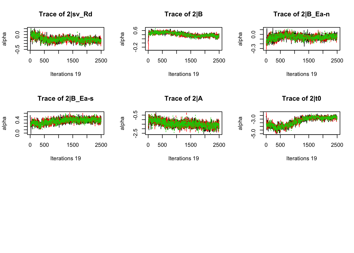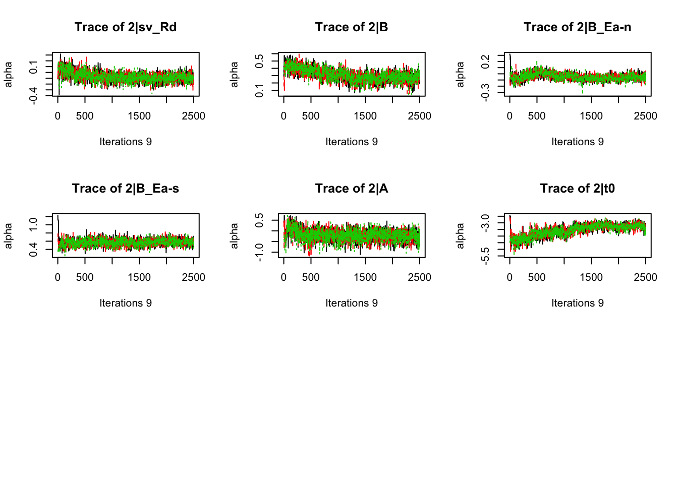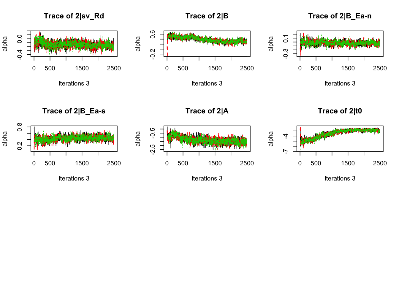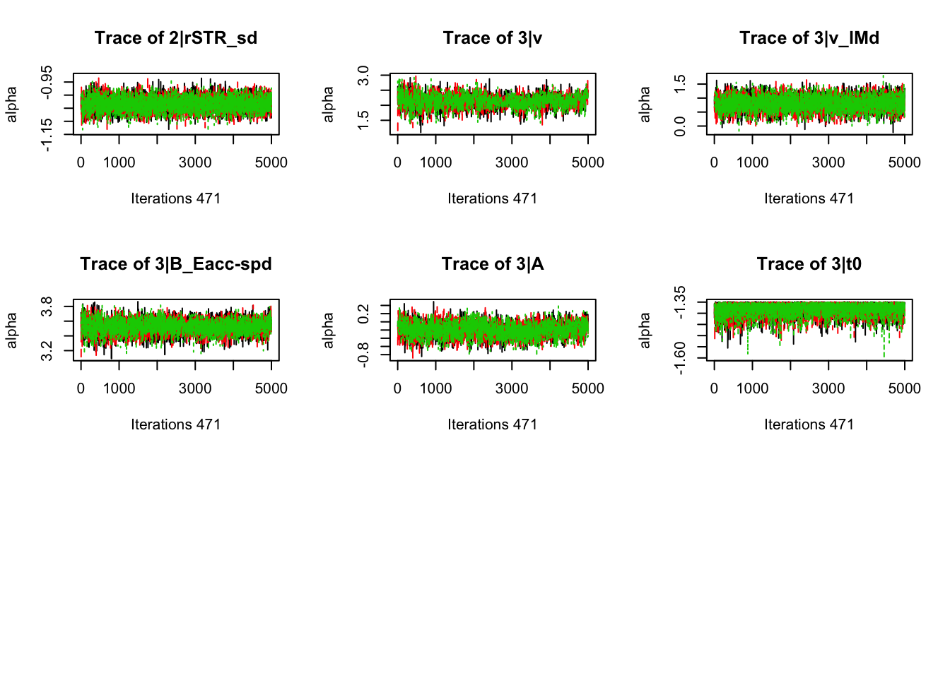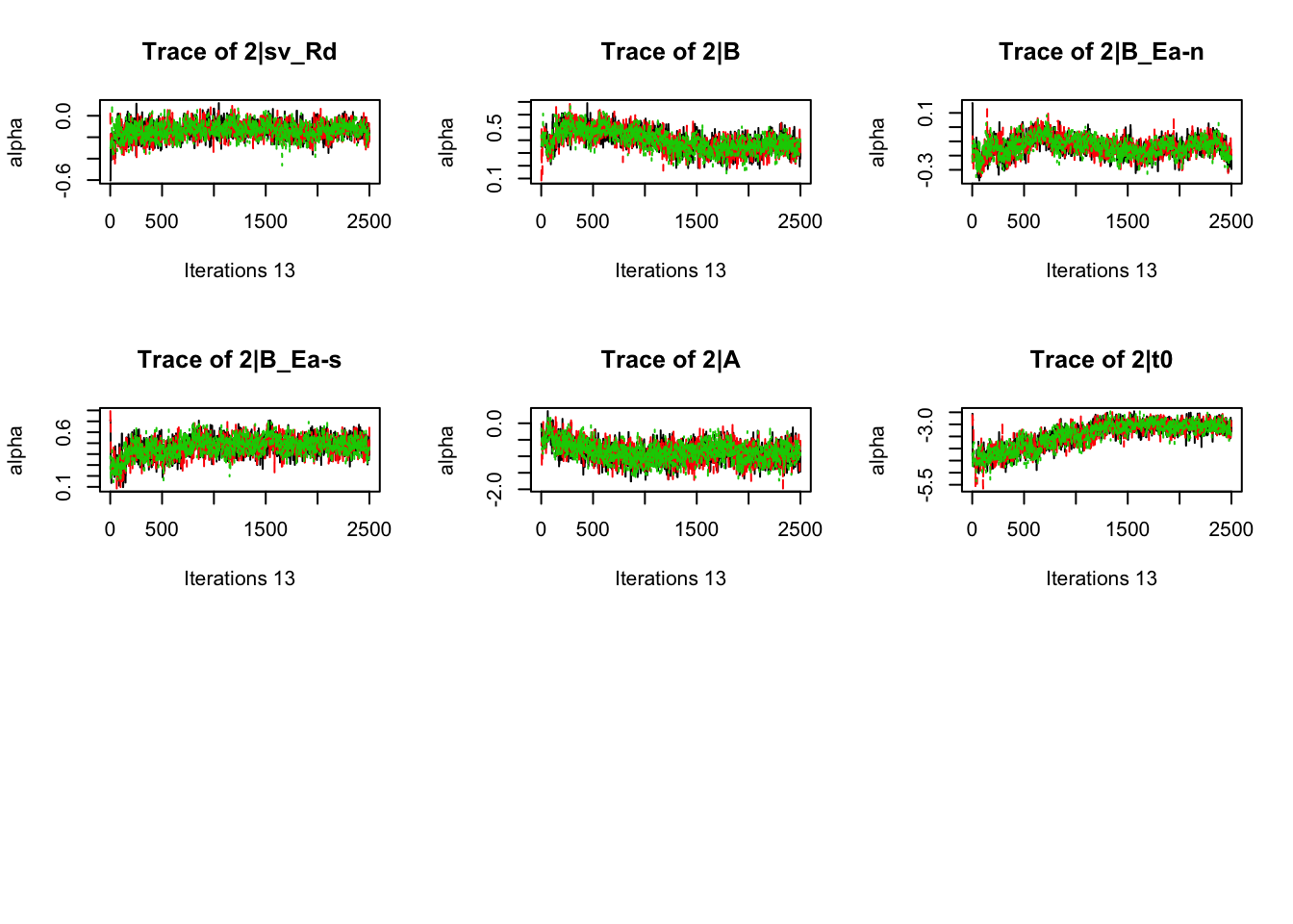 load("~/Desktop/emc_advanced/vignettes/JointModels/samples/joint_PNAS.RData")We also check whether our chains converged;