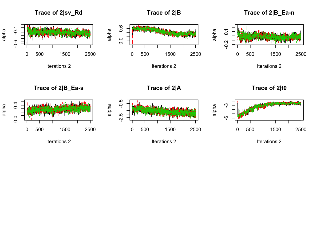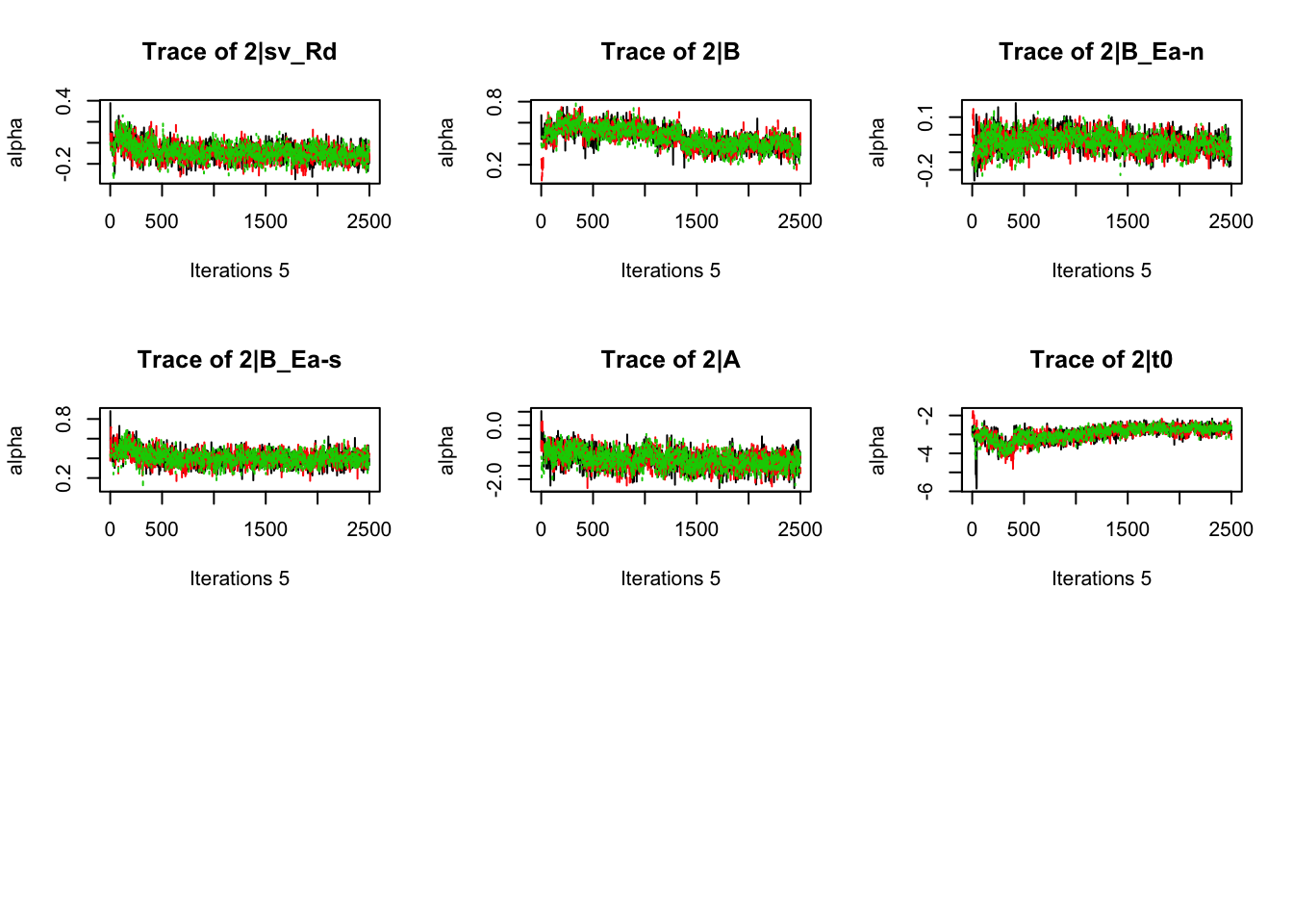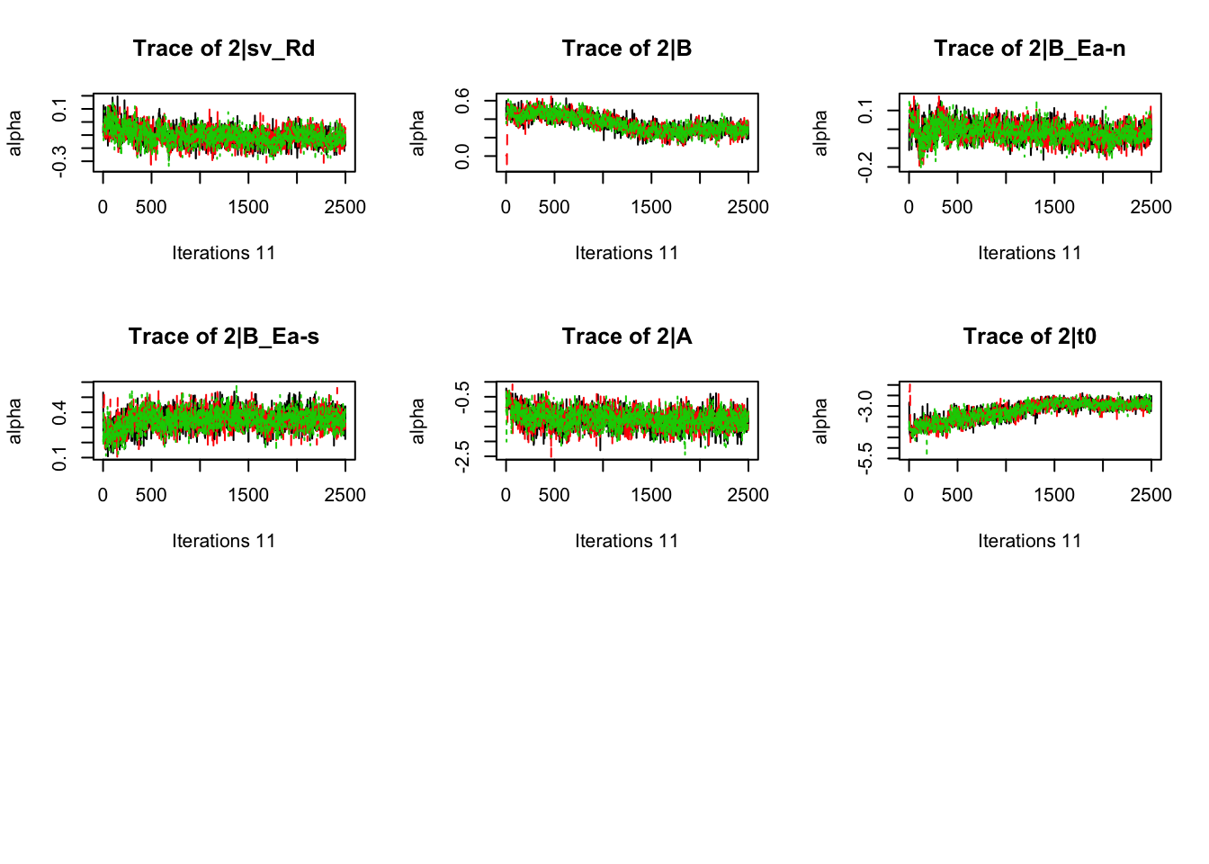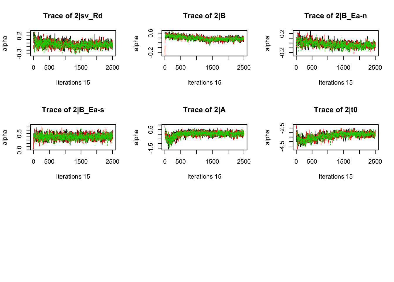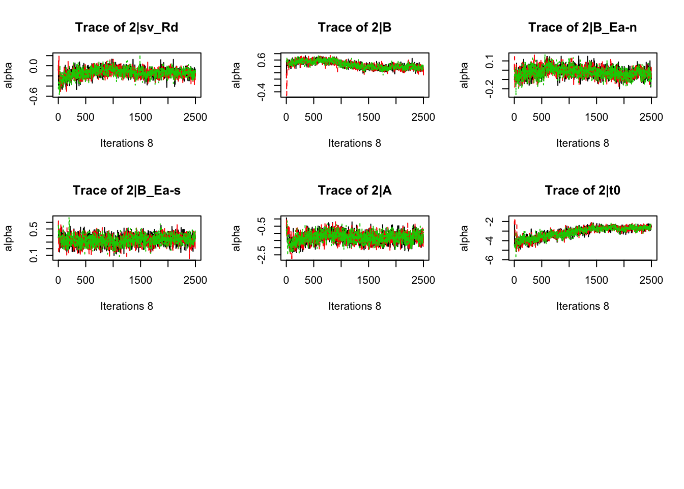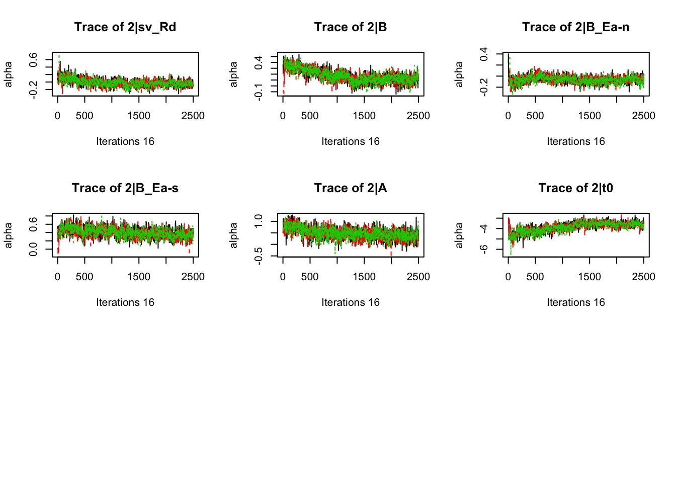 load("~/Desktop/emc_advanced/vignettes/JointModels/samples/joint_PNAS.RData")We also check whether our chains converged;