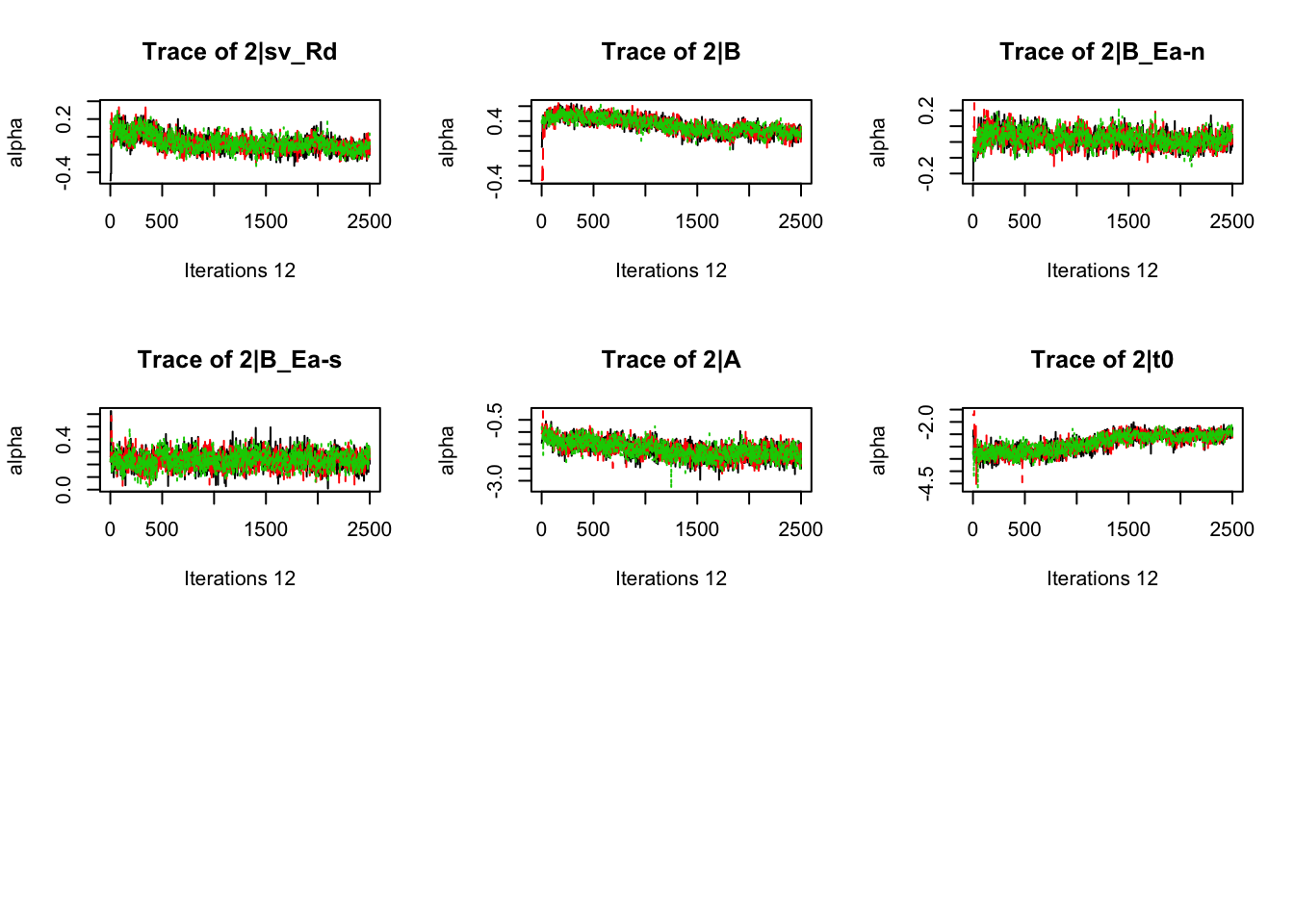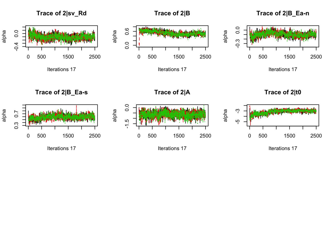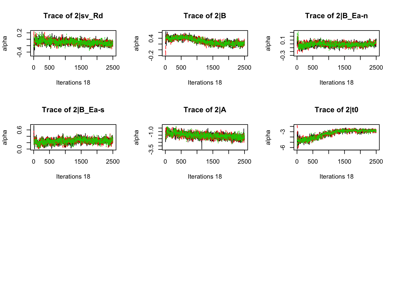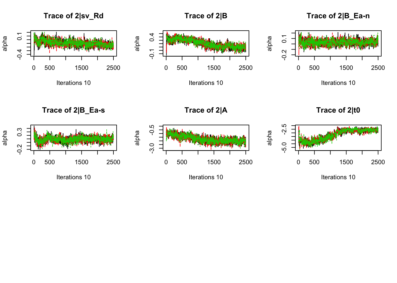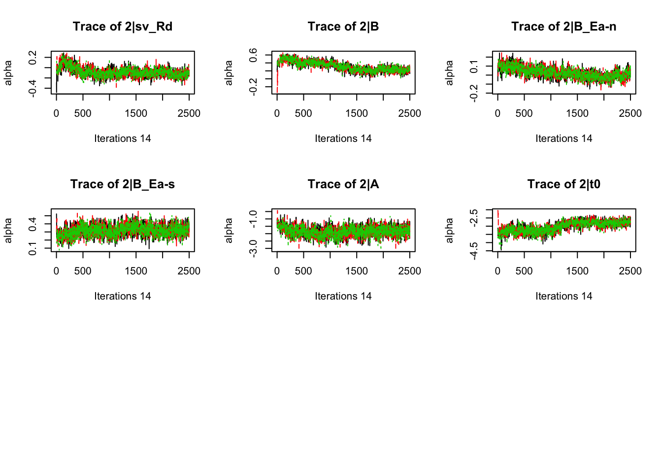 load("~/Desktop/emc_advanced/vignettes/JointModels/samples/joint_PNAS.RData")We also check whether our chains converged;