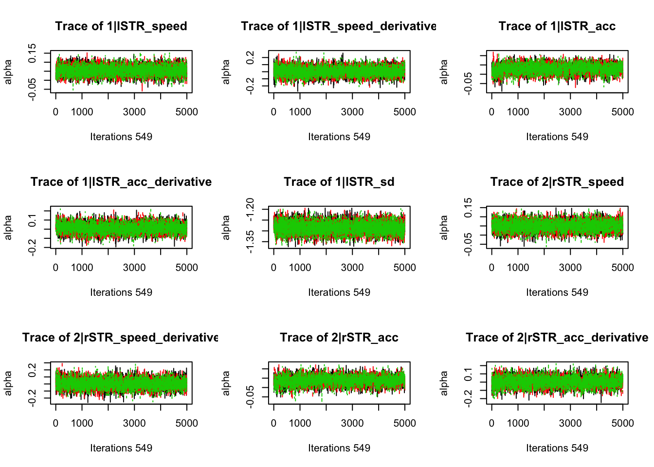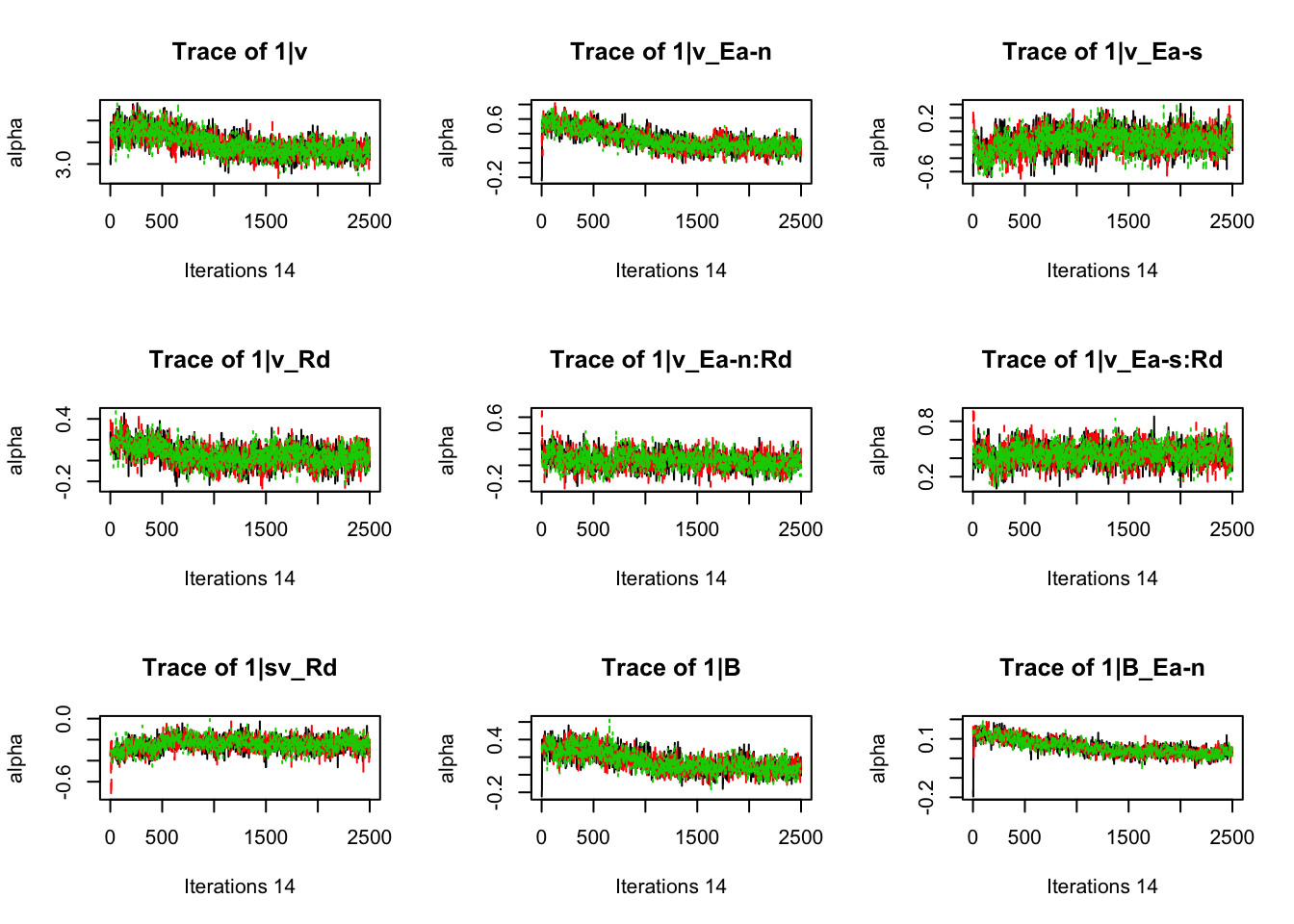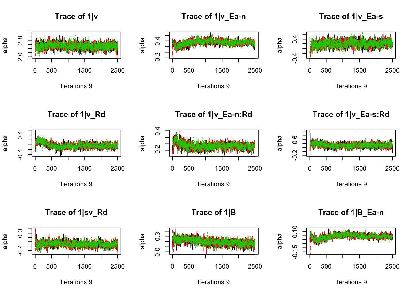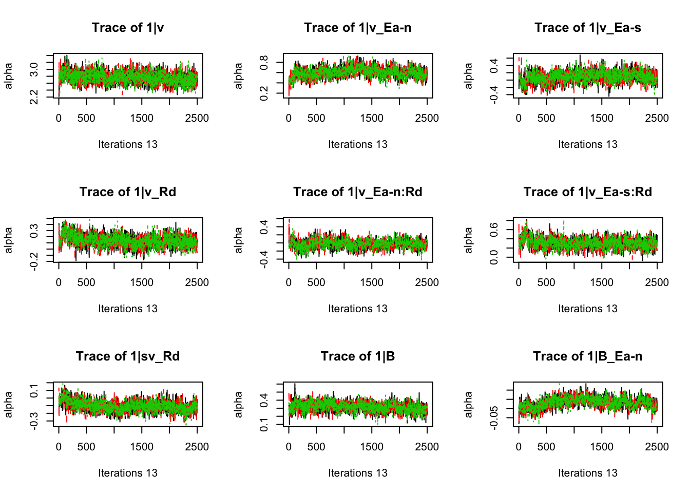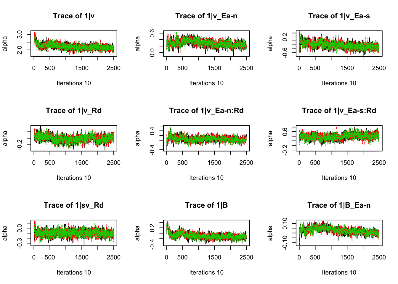 load("~/Desktop/emc_advanced/vignettes/JointModels/samples/joint_PNAS.RData")We also check whether our chains converged;