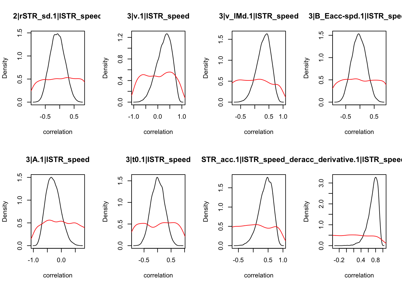 As we can see, none of the credible intervals of the correlations between the neural model and the behavioral model did not contain 0. This is not unsurprising given the low amount of behavioral trials completed. So we have to be cautious about making inference on these correlations.