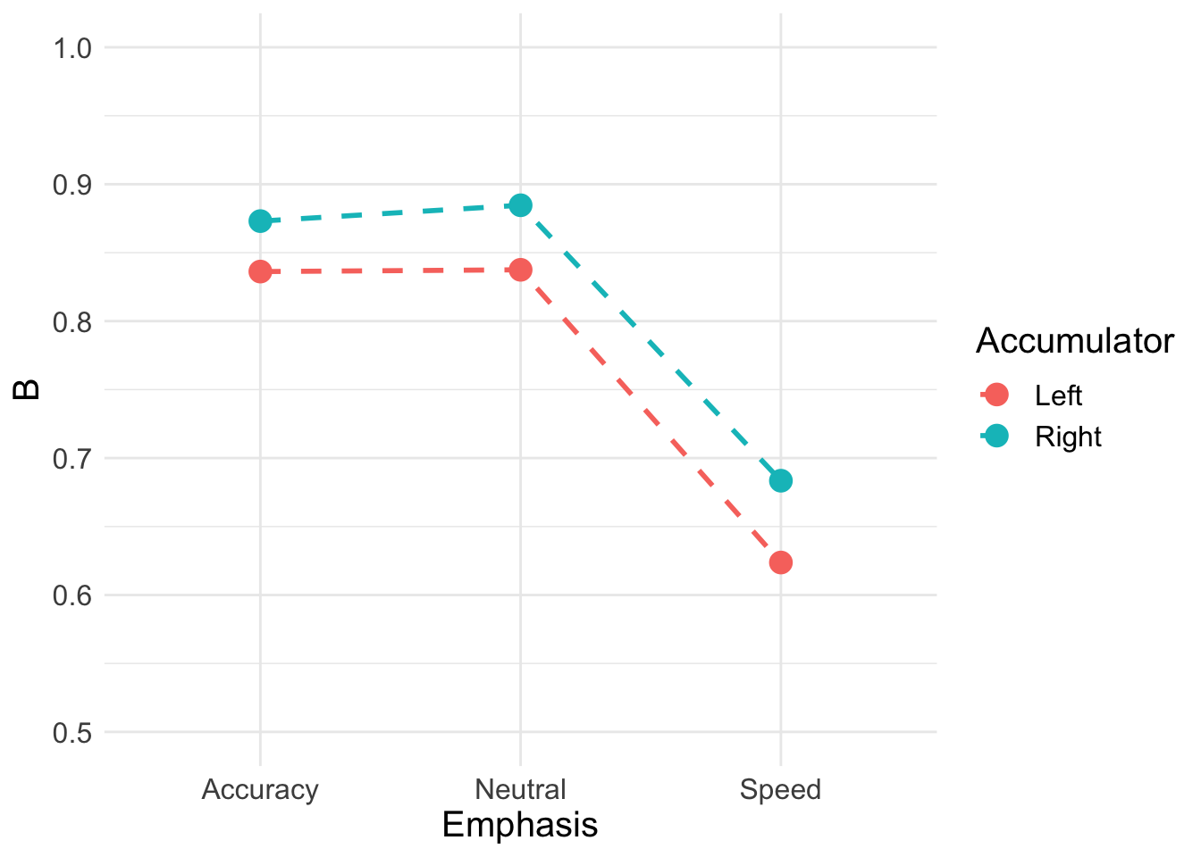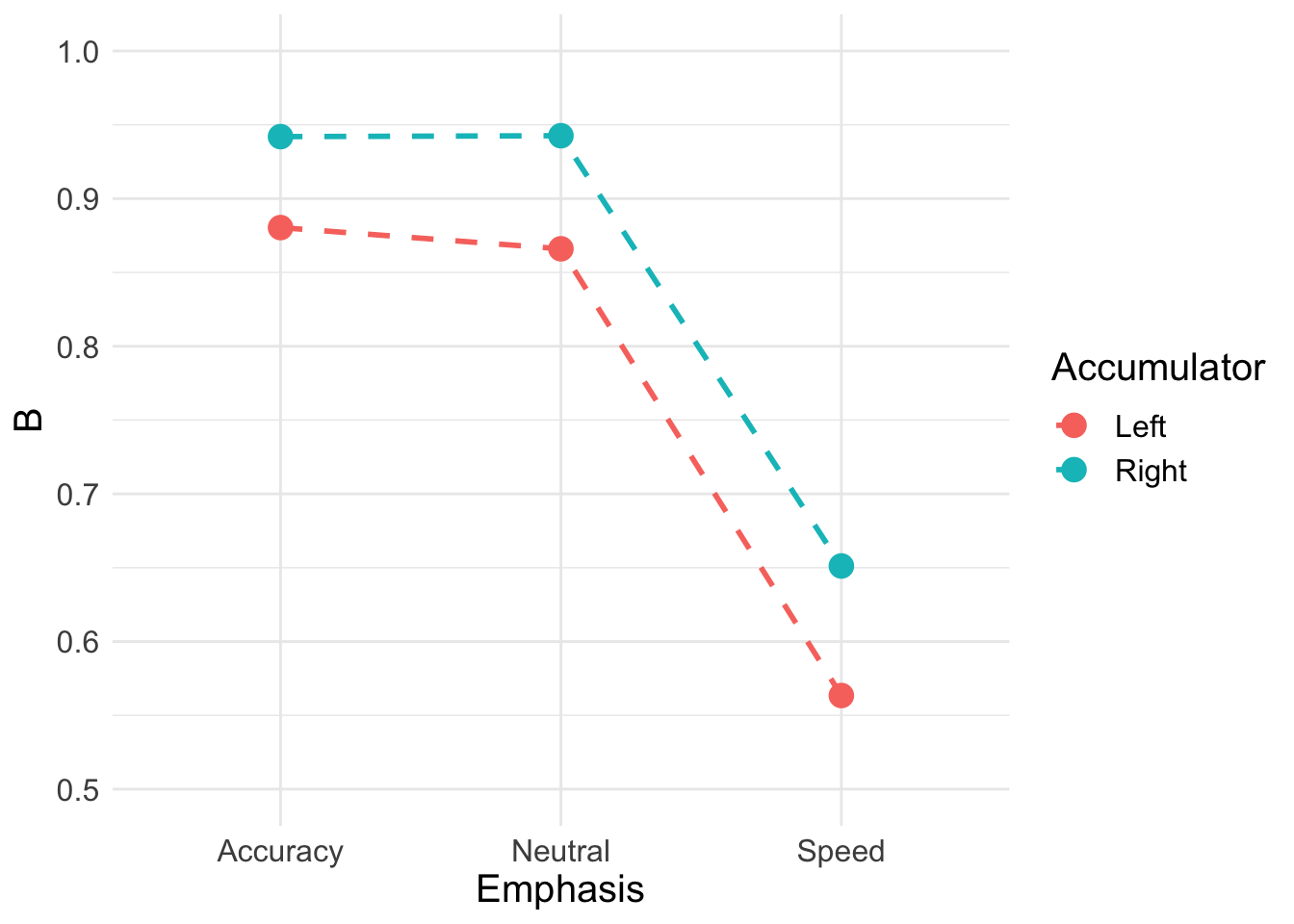 v: Drift rate.The rate of evidence accumulation for each accumulator. For the models, we generally estimate intercept and difference terms, such that the difference is the difference in drift rate between competing accumulators. The intercept drift term is often seen as the urgency term.sv: Drift rate variance. This is the between trial variance parameter for the drift rate distribution. Typically,svis set as a constant to 1 (Donkin et al. 2011) (however we show options below for this).B: Response threshold or response caution. The arbitrary amount of evidence needed before the corresponding response is executed. Generally,b = B + Ato ensure that threshold is greater than start point.A: Start point interval or evidence in accumulator before beginning of decision process. Start point varies from trial to trial in the interval [0, A] (uniform distribution). Average amount of evidence before evidence accumulation across trials is A/2.t0: non-decision time or response time constant (in seconds). Lower bound for the duration of all non-decisional processes (encoding and response execution).