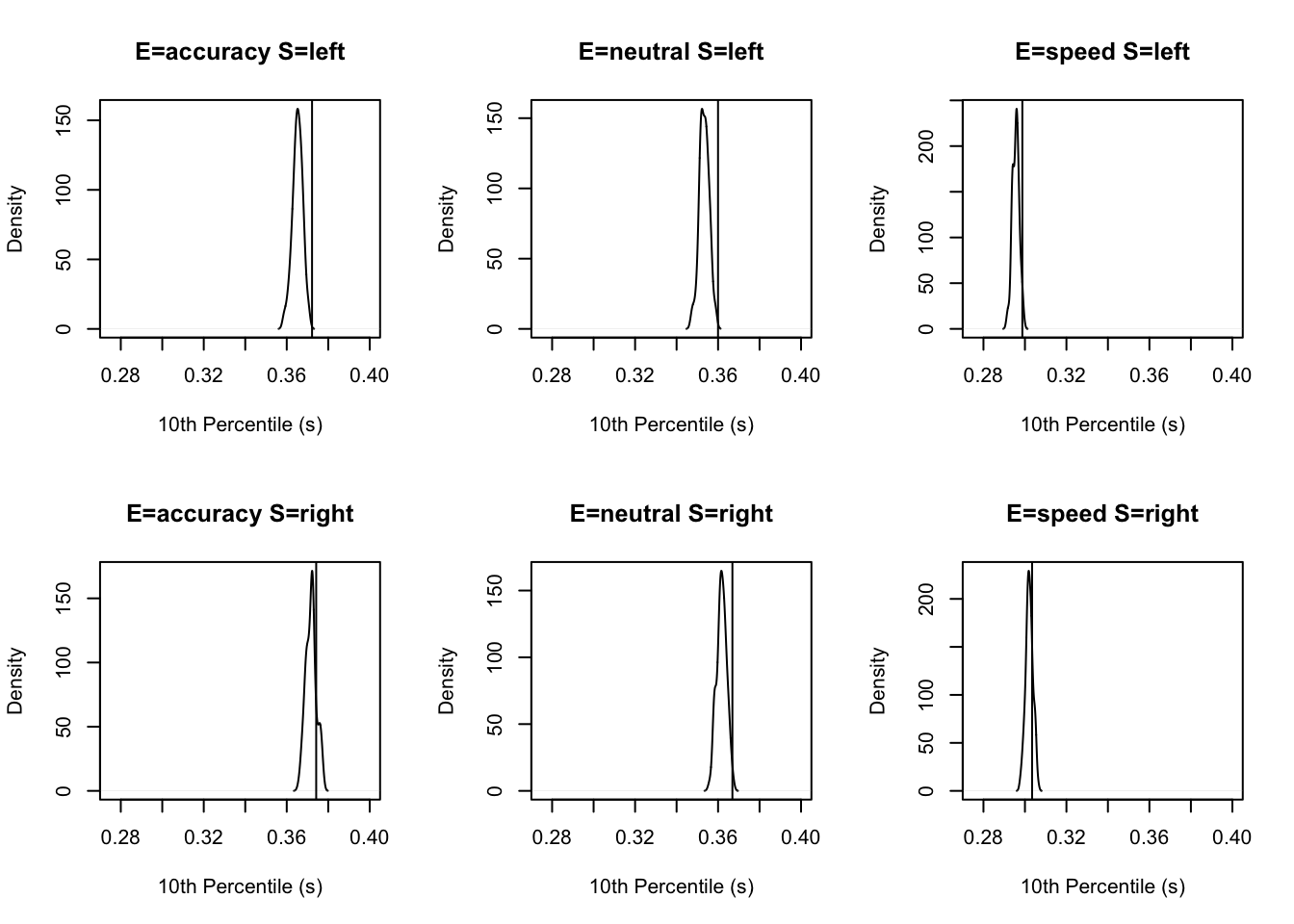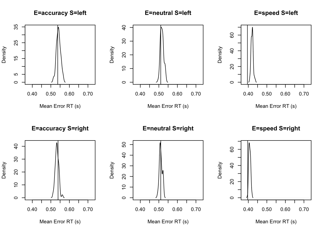 # NB: This data has been truncated at 0.25s and 1.5sNow, we’re going to fit a series of models to the Forstmann (2008) data. The first model will only vary threshold with emphasis. The second varies threshold, drift and non-decision time with emphasis (saturated). The next three models include the estimation of a variability parameter sv. In the first models we set sv=1 to establish a scale.