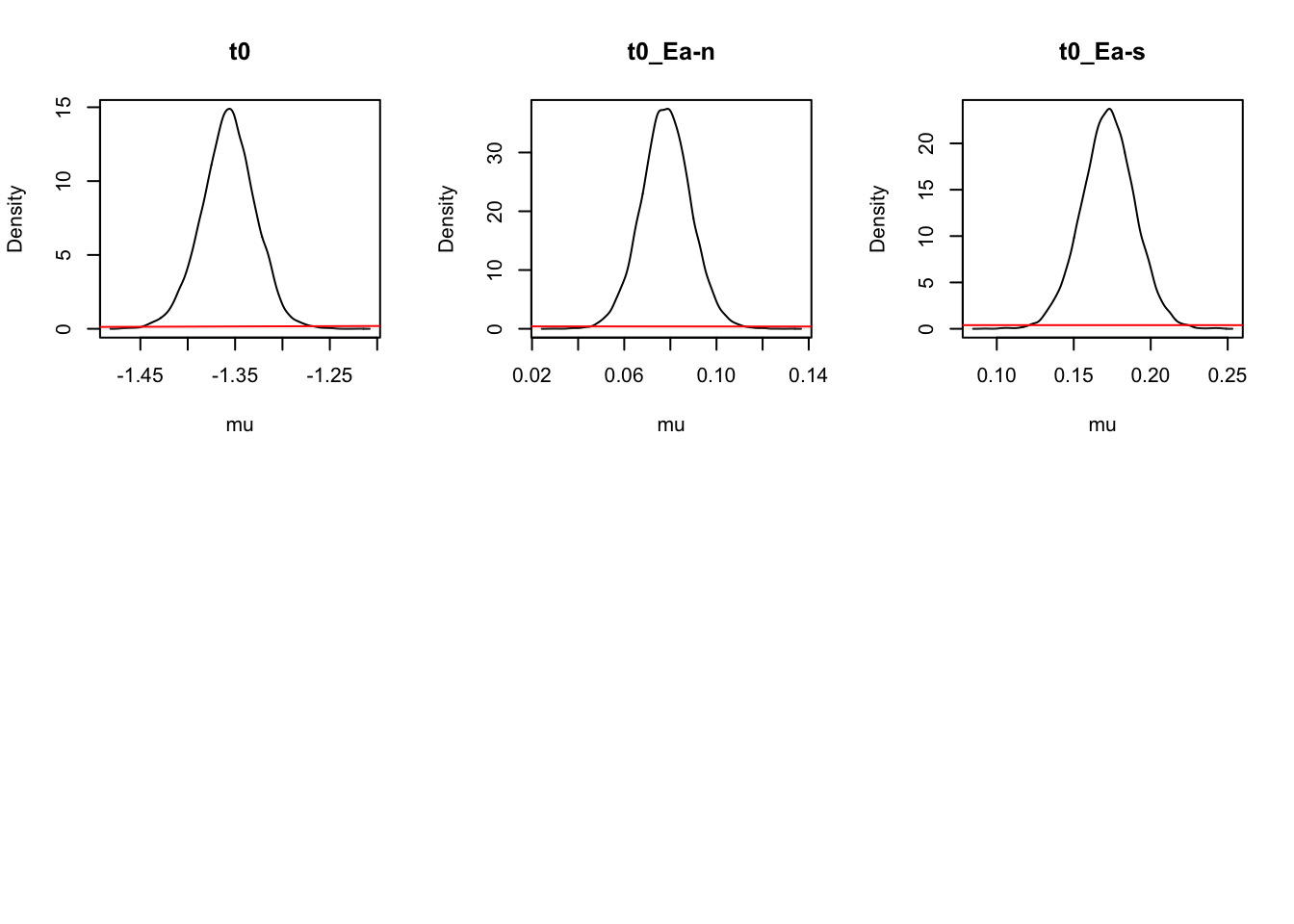 Note that this includes one of the failed models (Bvt0_sv). It’s worth taking a look at the chains and diagnostics for this model to help identify problems in your own modelling. Comparing these estimates to a “good” run will be immediately obvious, with stuck chains, parameters not showing stationarity, low GD statistics and low effective sample sizes.