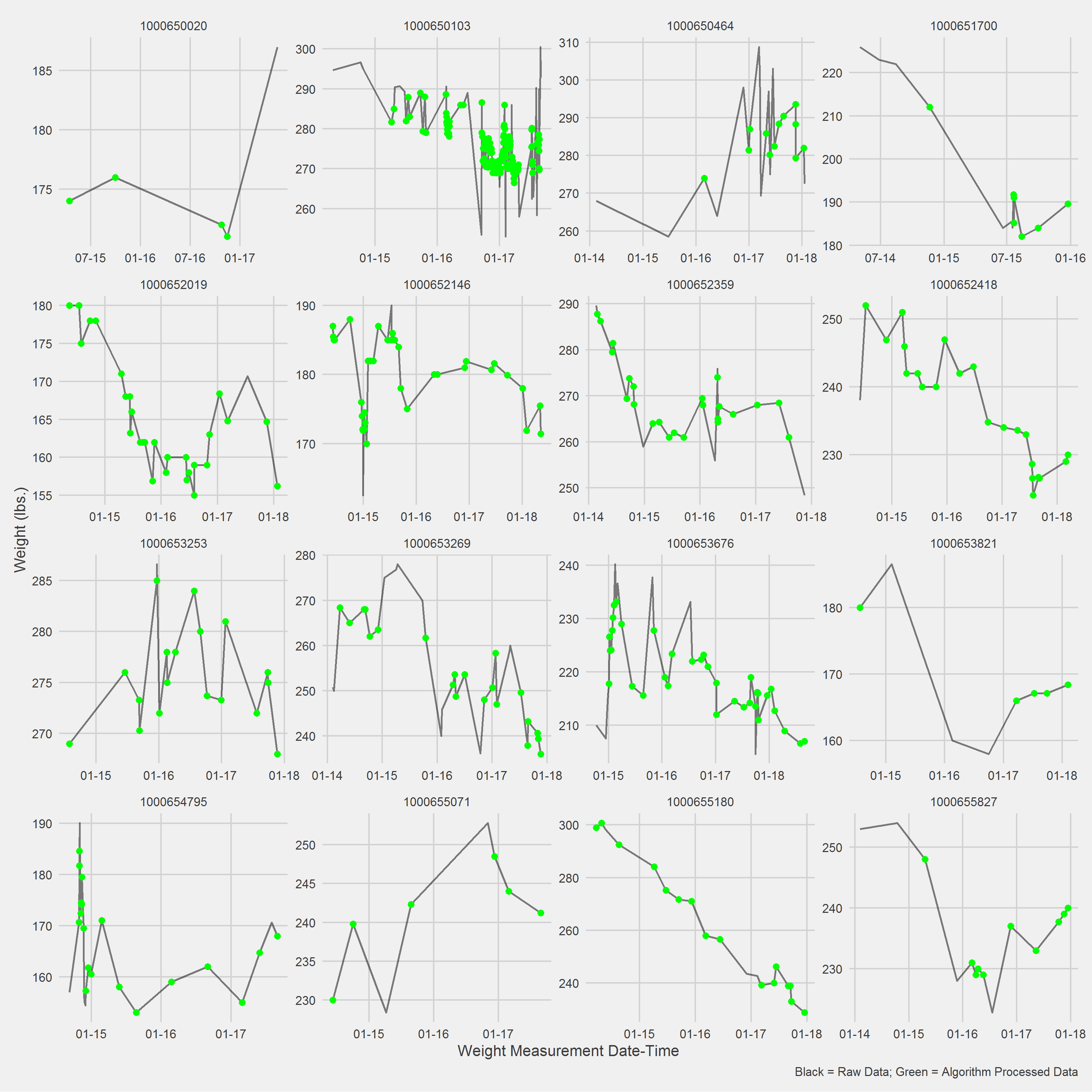 variables = c("AgeAtVisit", "Gender"))Displaying a Vignette of 16 selected patients with at least 1 weight observation removed.