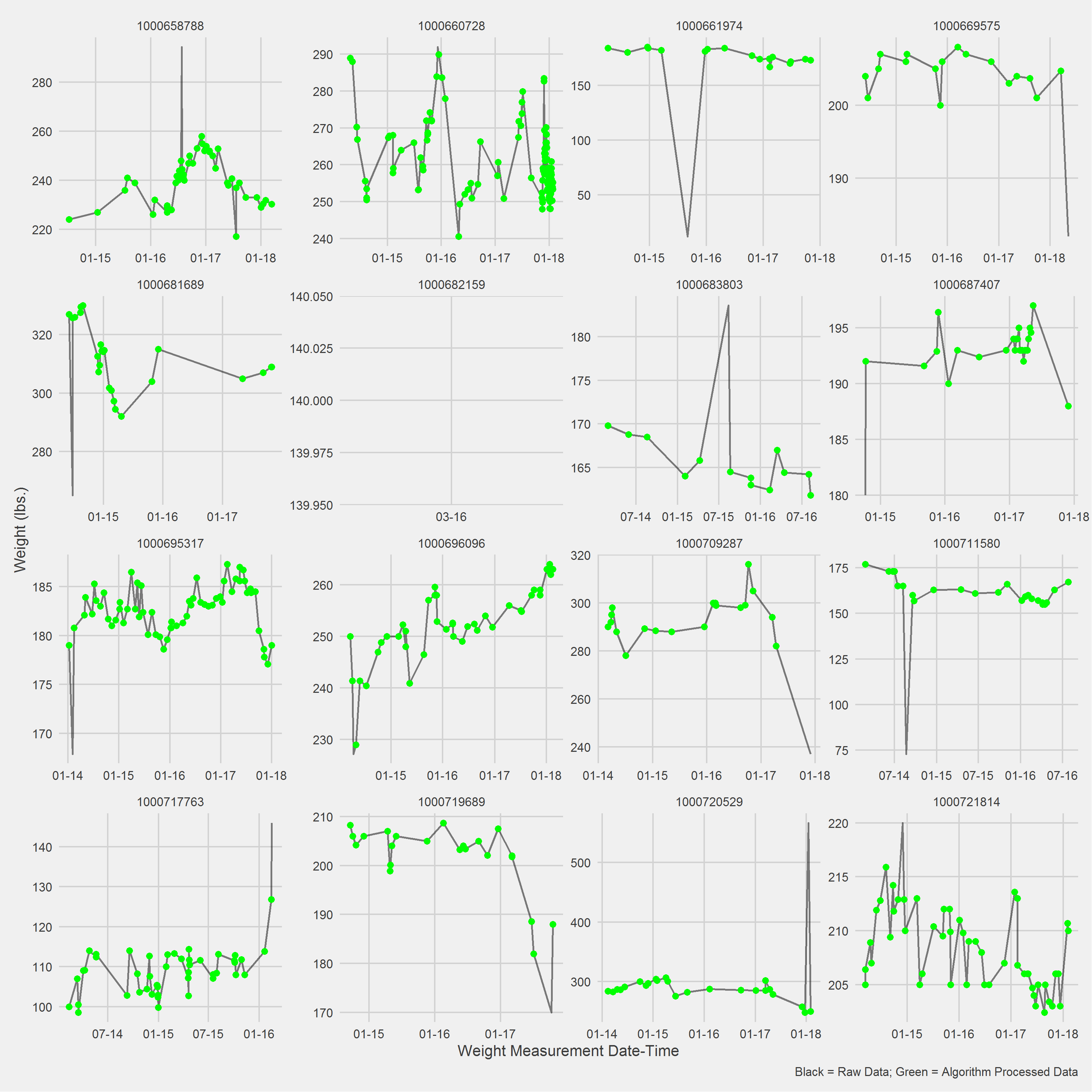 Displaying a Vignette of 16 selected patients with at least 1 weight observation removed.