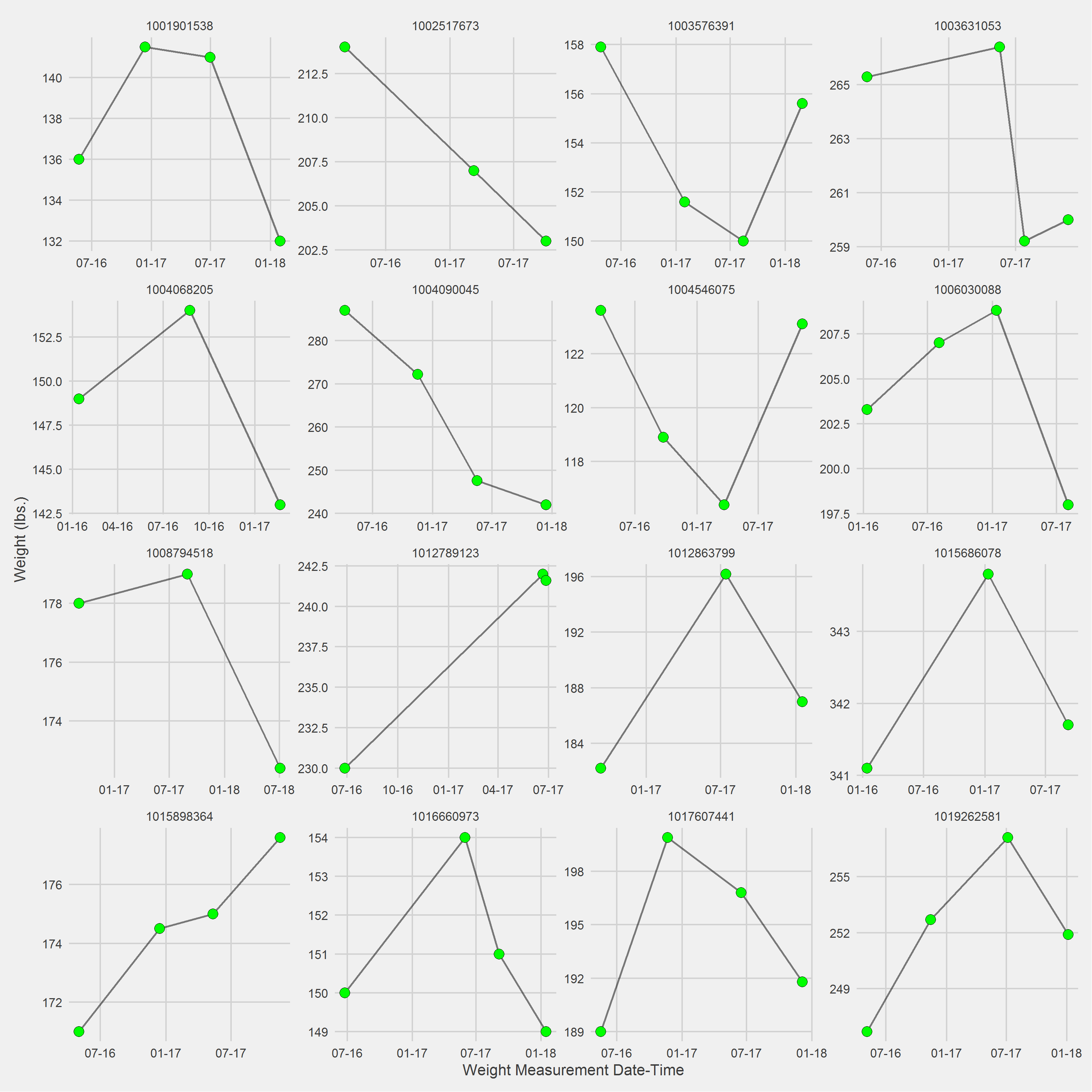 pad = 1)Vignette of 16 randomly selected individuals, displaying weight trajectories since first MOVE! visit in 2016
