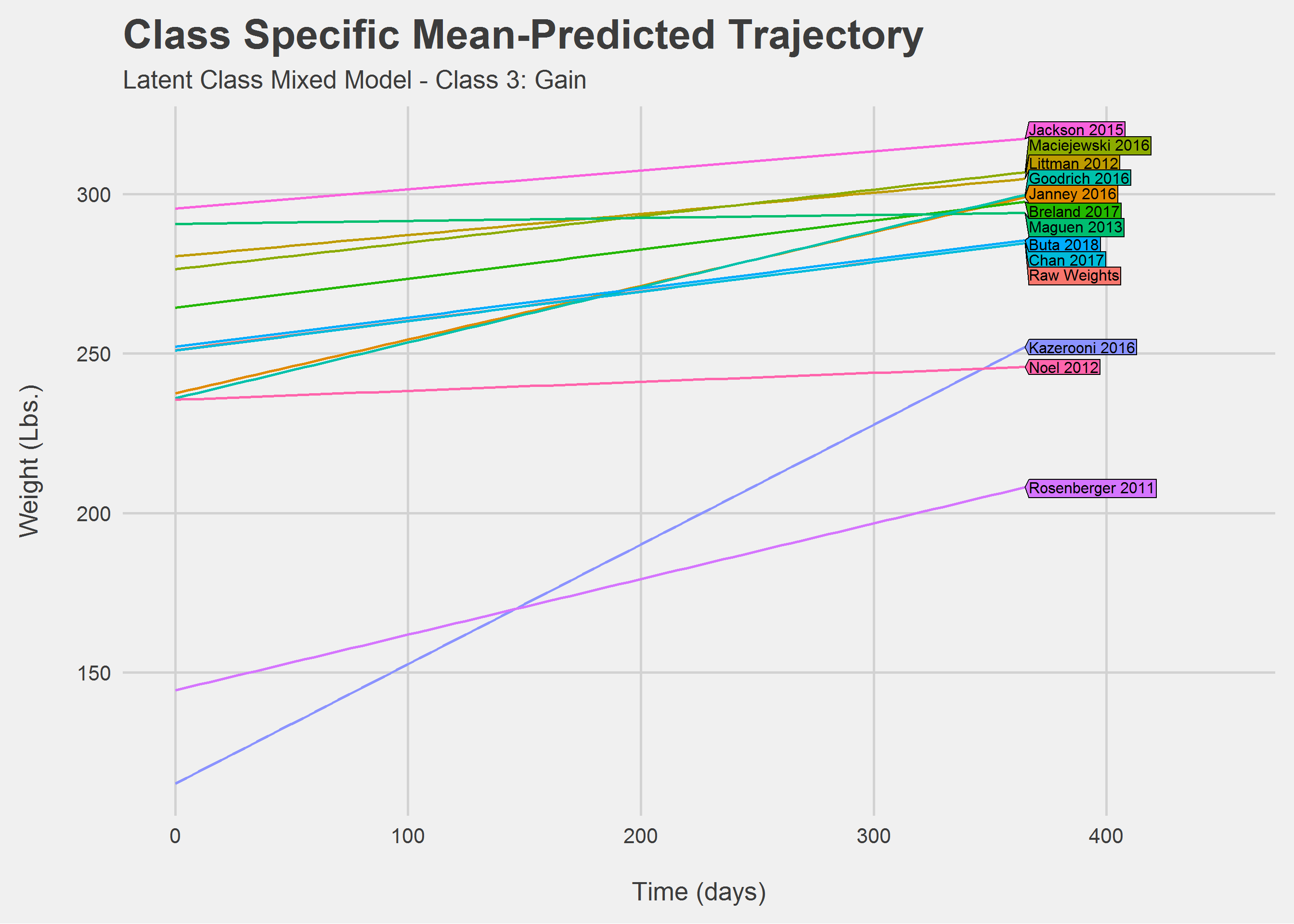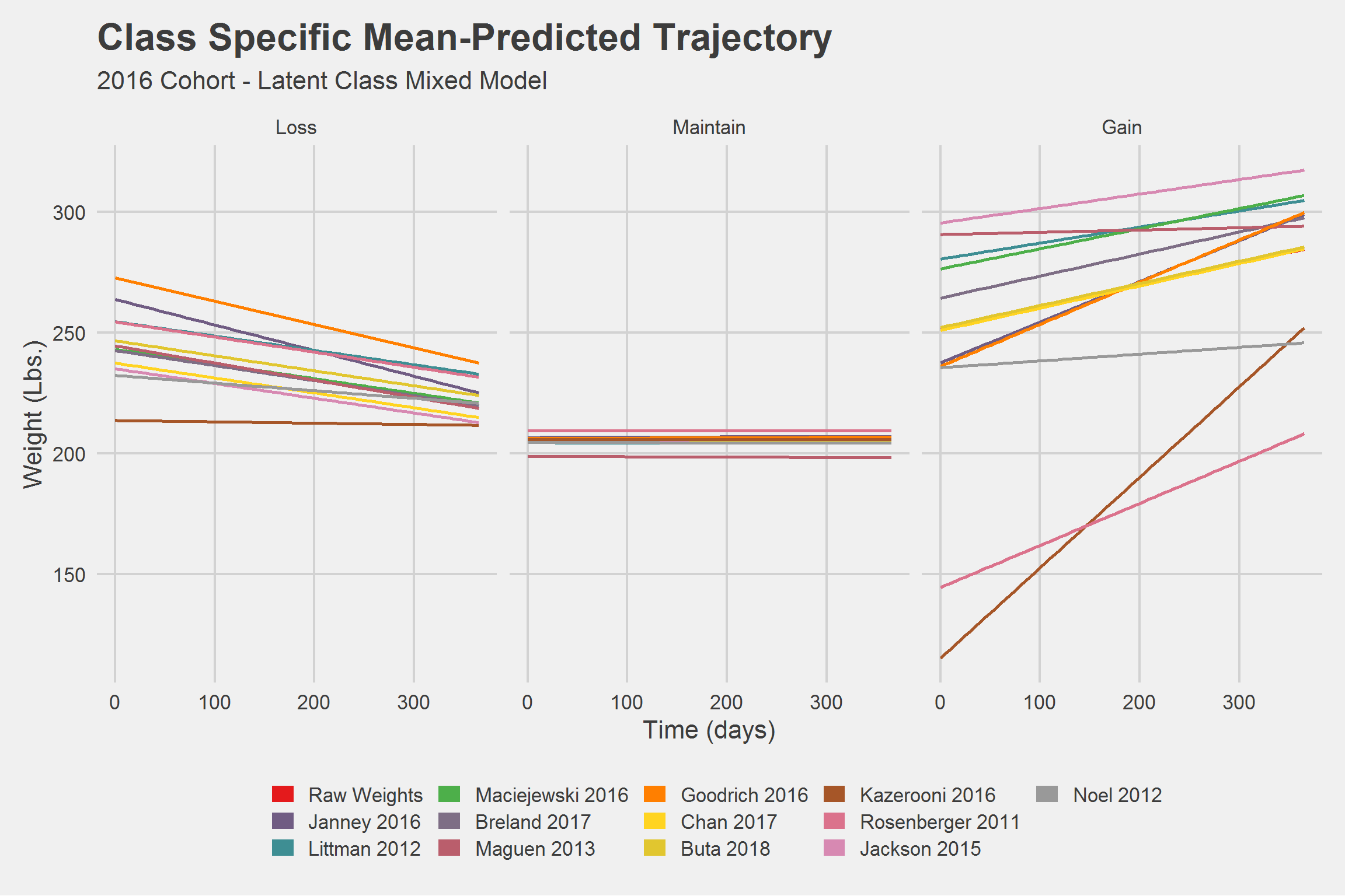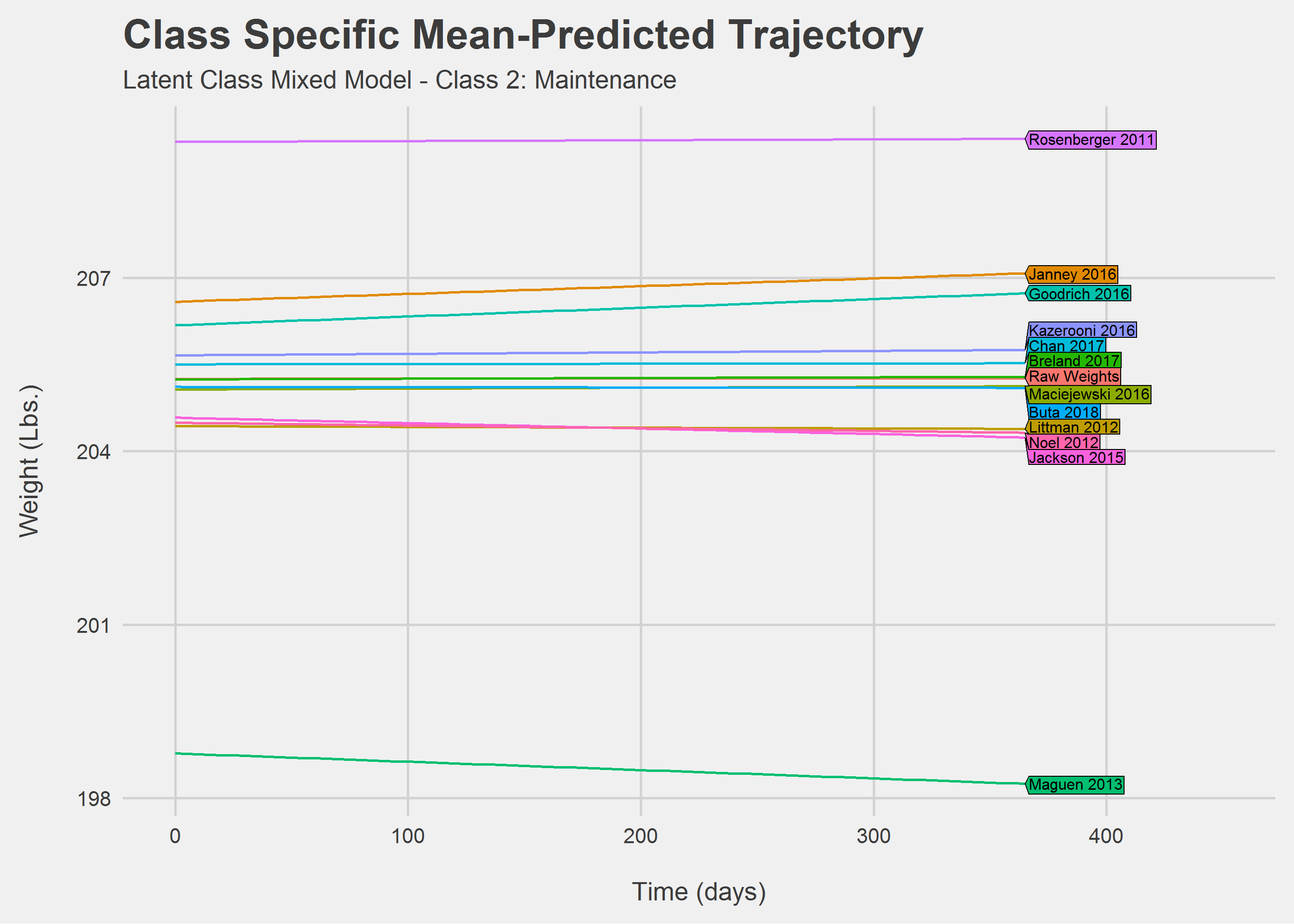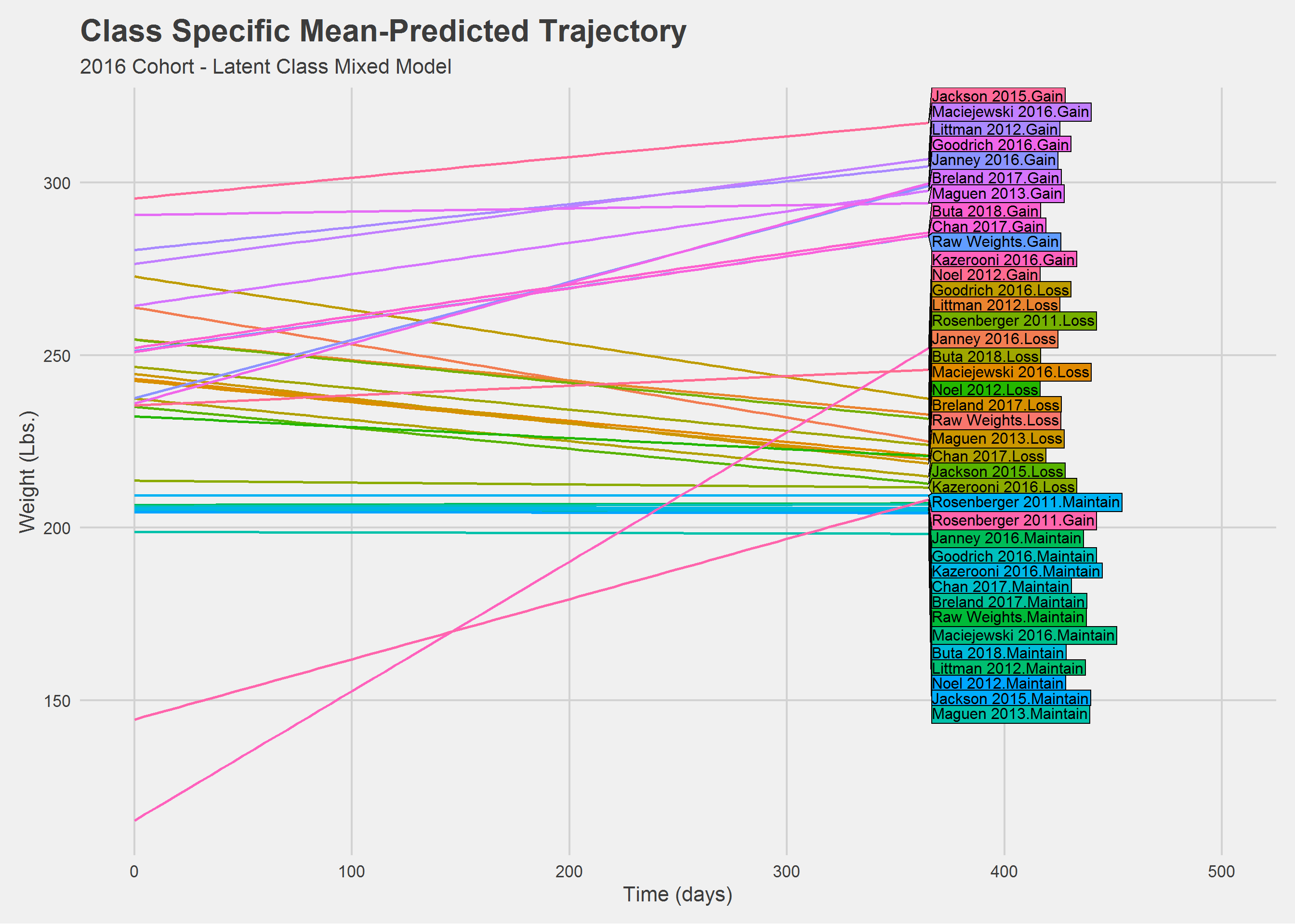For this analysis we will use a latent class mixed model to examine the effect that different weight cleaning algorithms would have on overall trajectories. Some things to consider: Since this is a linear method it makes the most sense to analyze those individuals where their trajectory is assumed to be decreasing or increasing, and thus this analysis only involves the MOVE 2016 cohort (could also do 2008). Second, based on experience with this data I am only assuming two latent groups or classes, this may not represent reality as people can presumably increase, decrease or maintain the same weight over time. Further analyses is warranted to find a better fitting model.