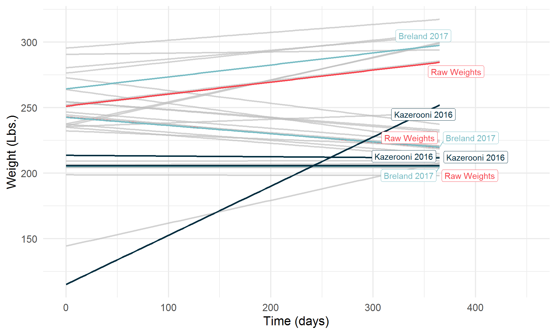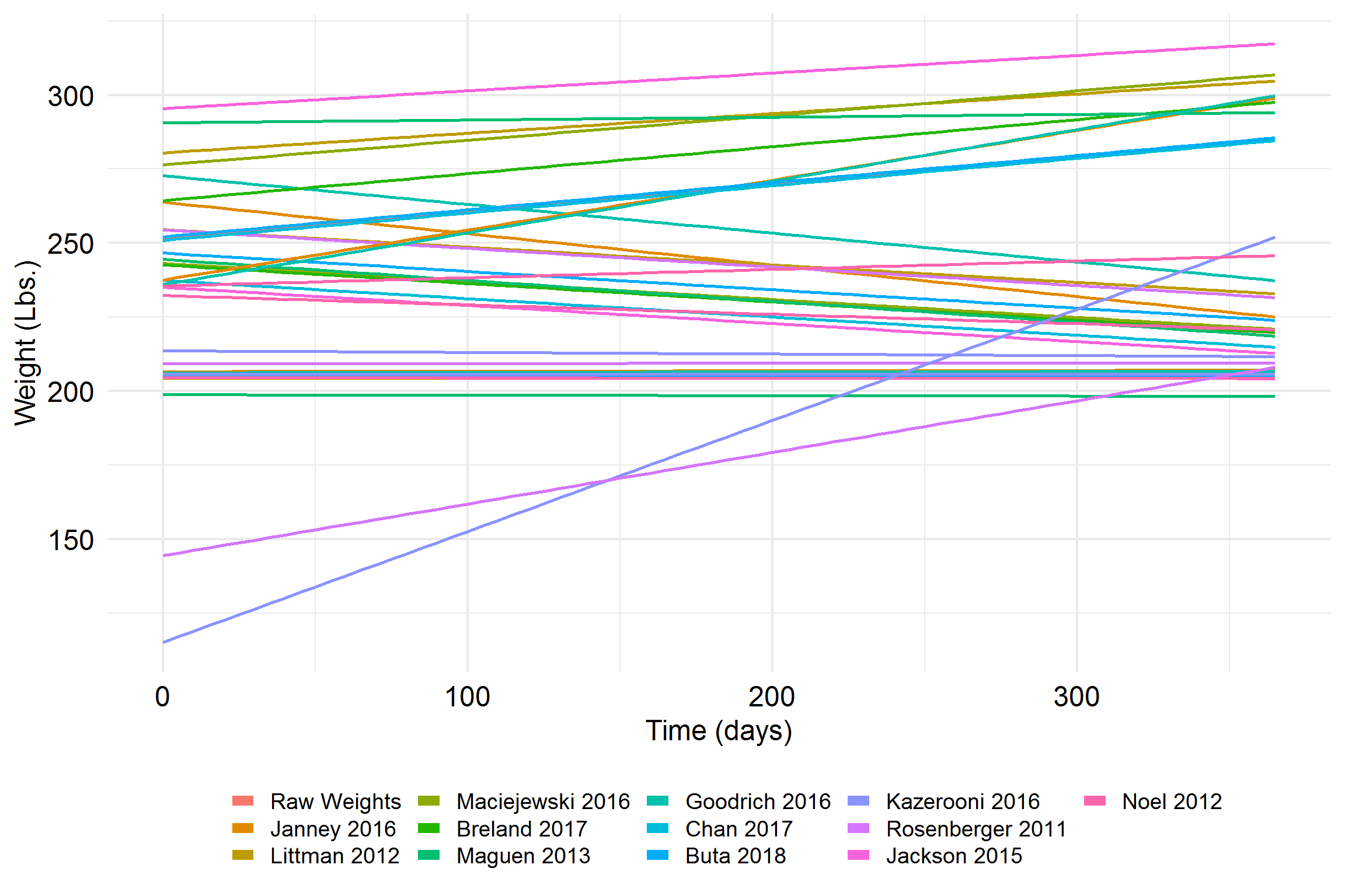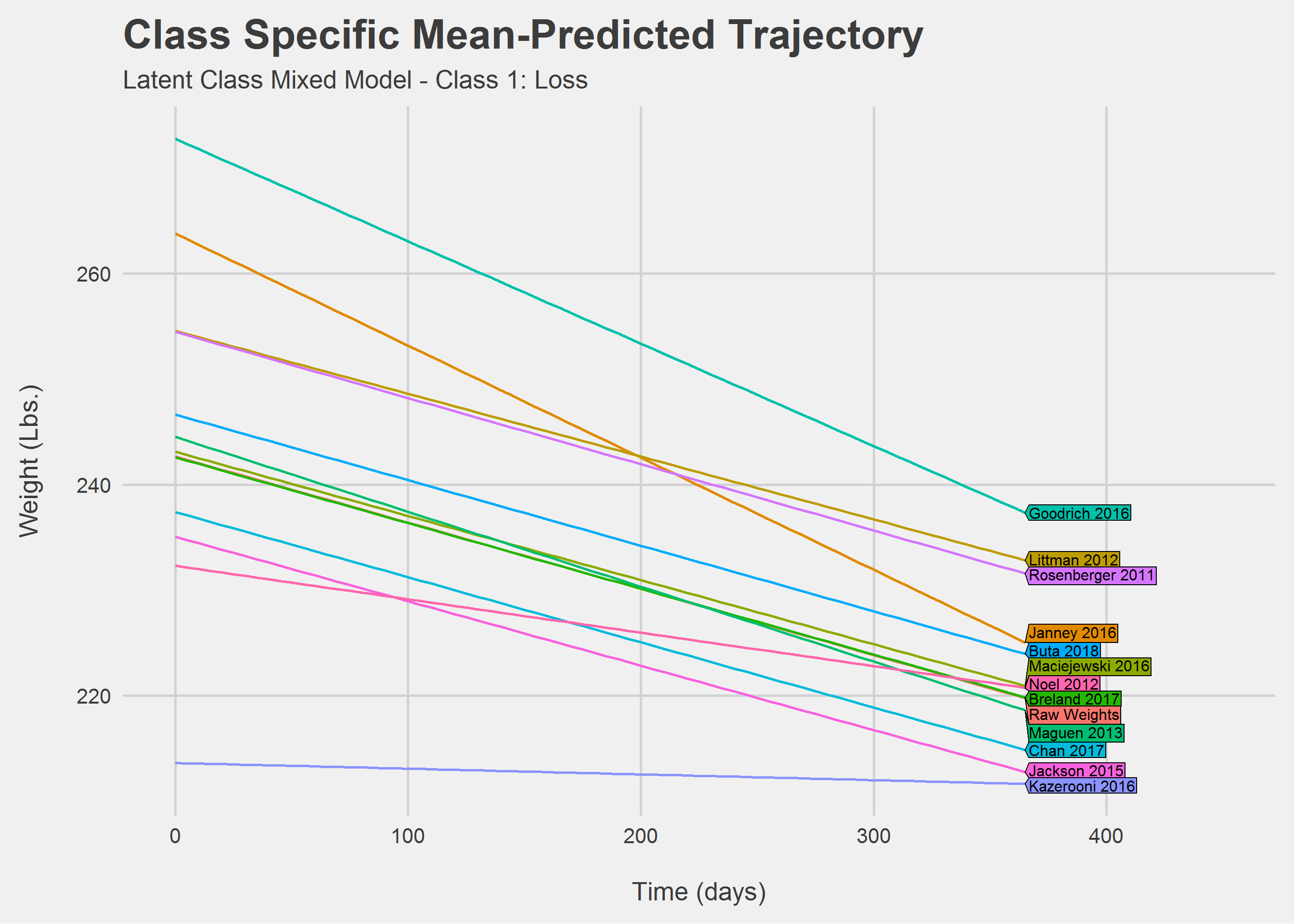 For this analysis we will use a latent class mixed model to examine the effect that different weight cleaning algorithms would have on overall trajectories. Some things to consider: Since this is a linear method it makes the most sense to analyze those individuals where their trajectory is assumed to be decreasing or increasing, and thus this analysis only involves the MOVE 2016 cohort (could also do 2008). Second, based on experience with this data I am only assuming two latent groups or classes, this may not represent reality as people can presumably increase, decrease or maintain the same weight over time. Further analyses is warranted to find a better fitting model.