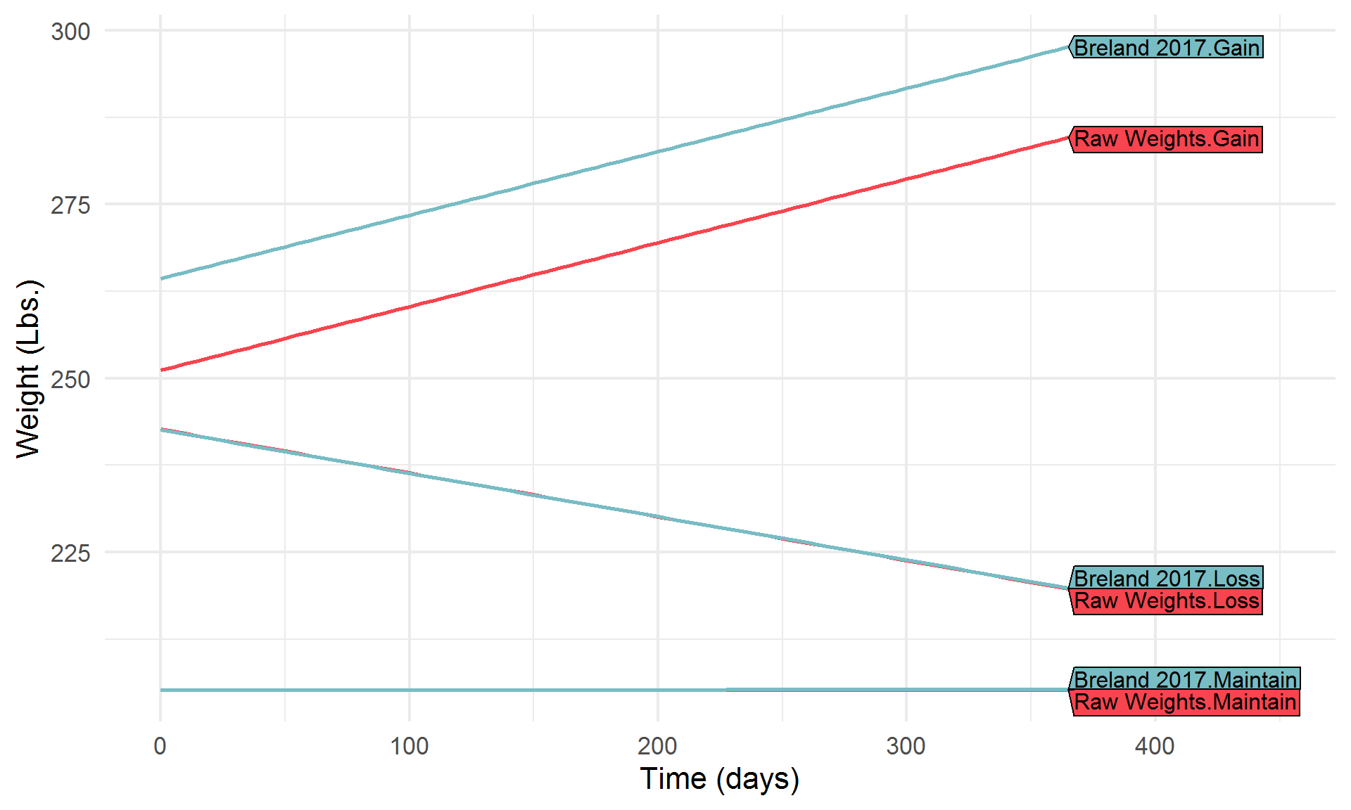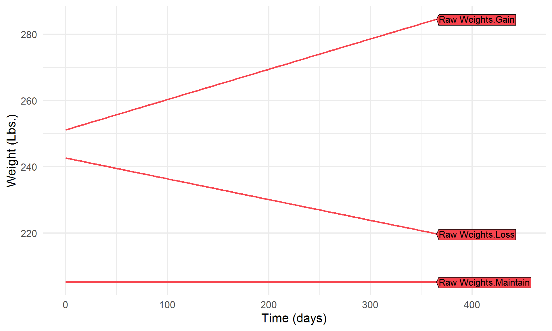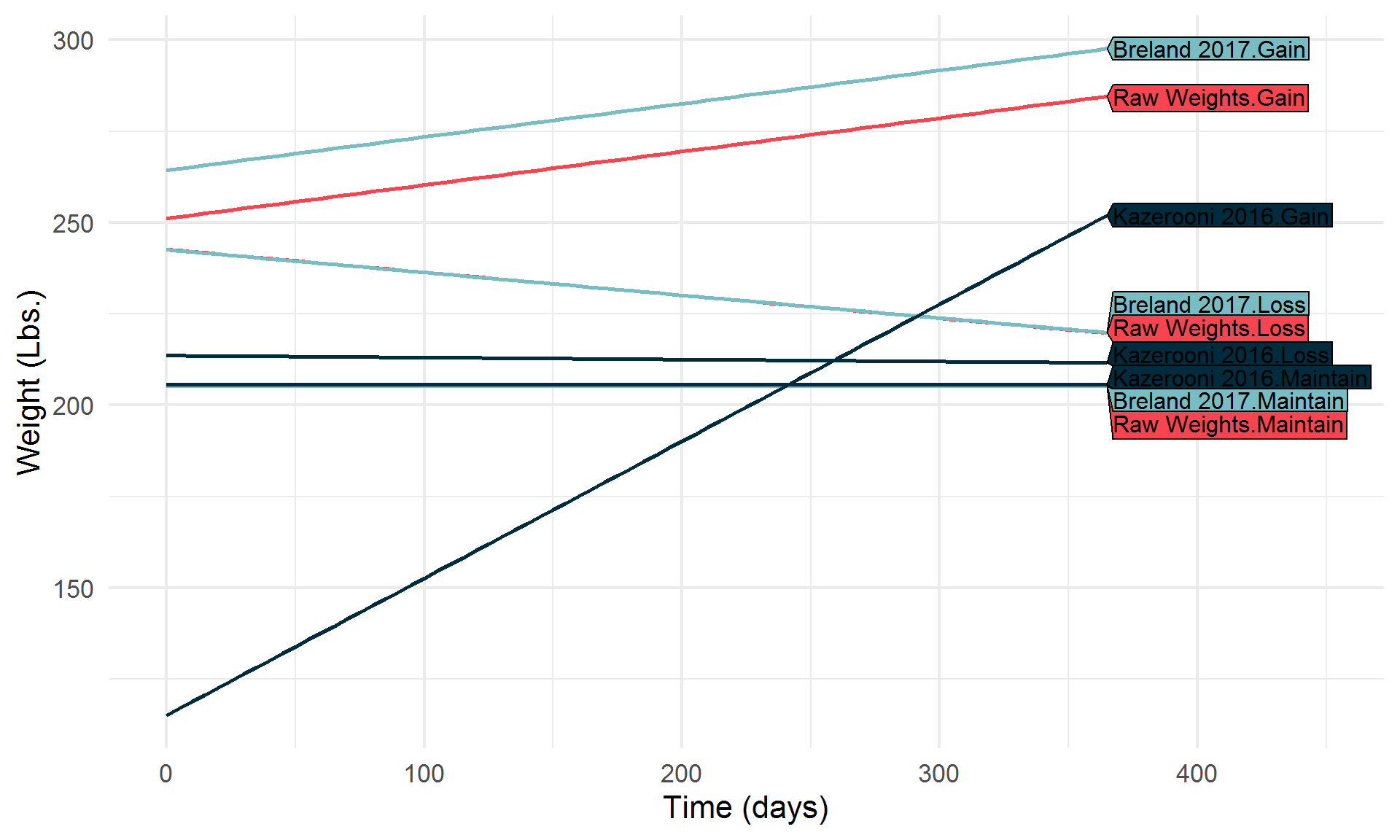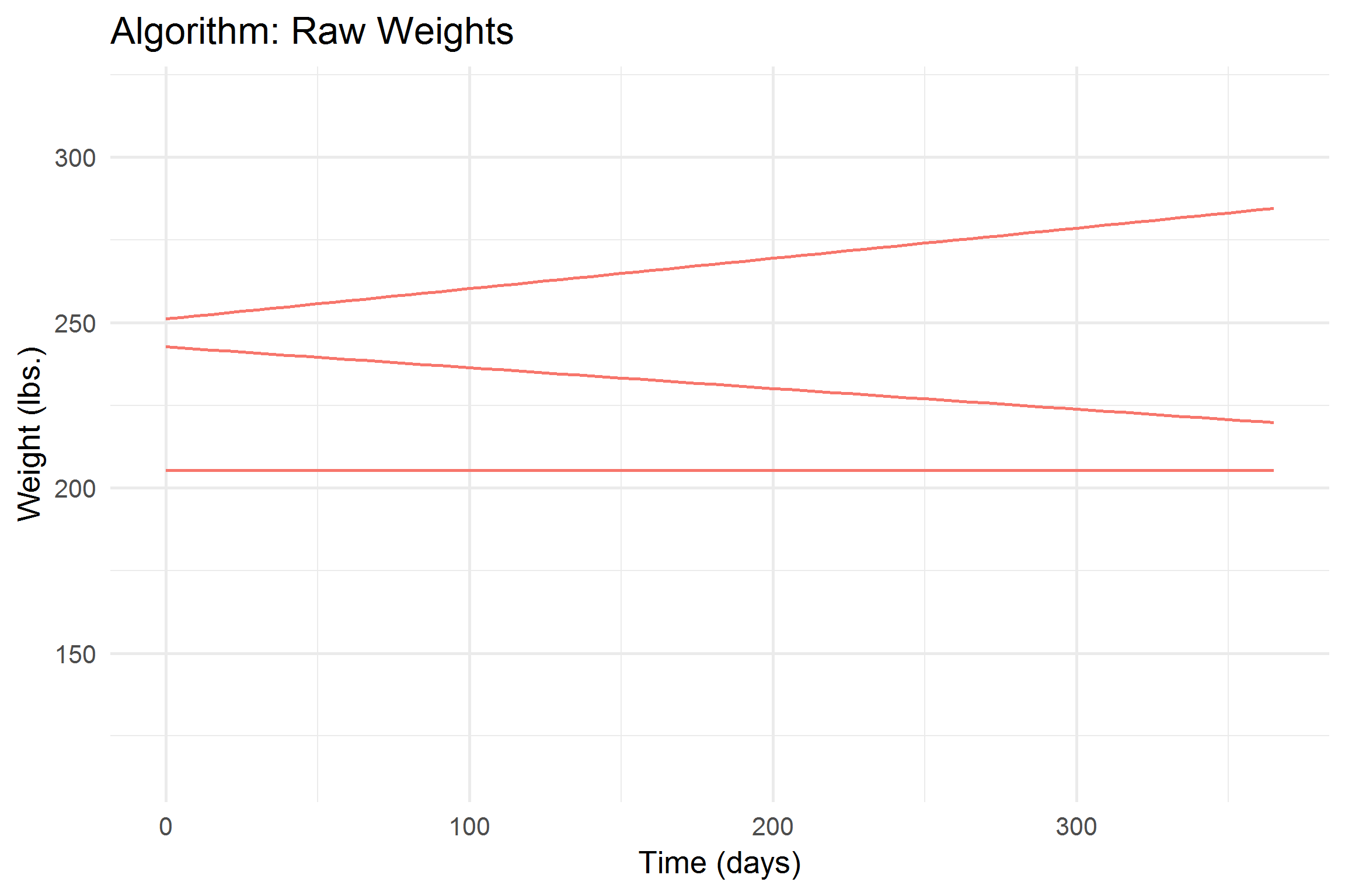 For this analysis we will use a latent class mixed model to examine the effect that different weight cleaning algorithms would have on overall trajectories. Some things to consider: Since this is a linear method it makes the most sense to analyze those individuals where their trajectory is assumed to be decreasing or increasing, and thus this analysis only involves the MOVE 2016 cohort (could also do 2008). Second, based on experience with this data I am only assuming two latent groups or classes, this may not represent reality as people can presumably increase, decrease or maintain the same weight over time. Further analyses is warranted to find a better fitting model.