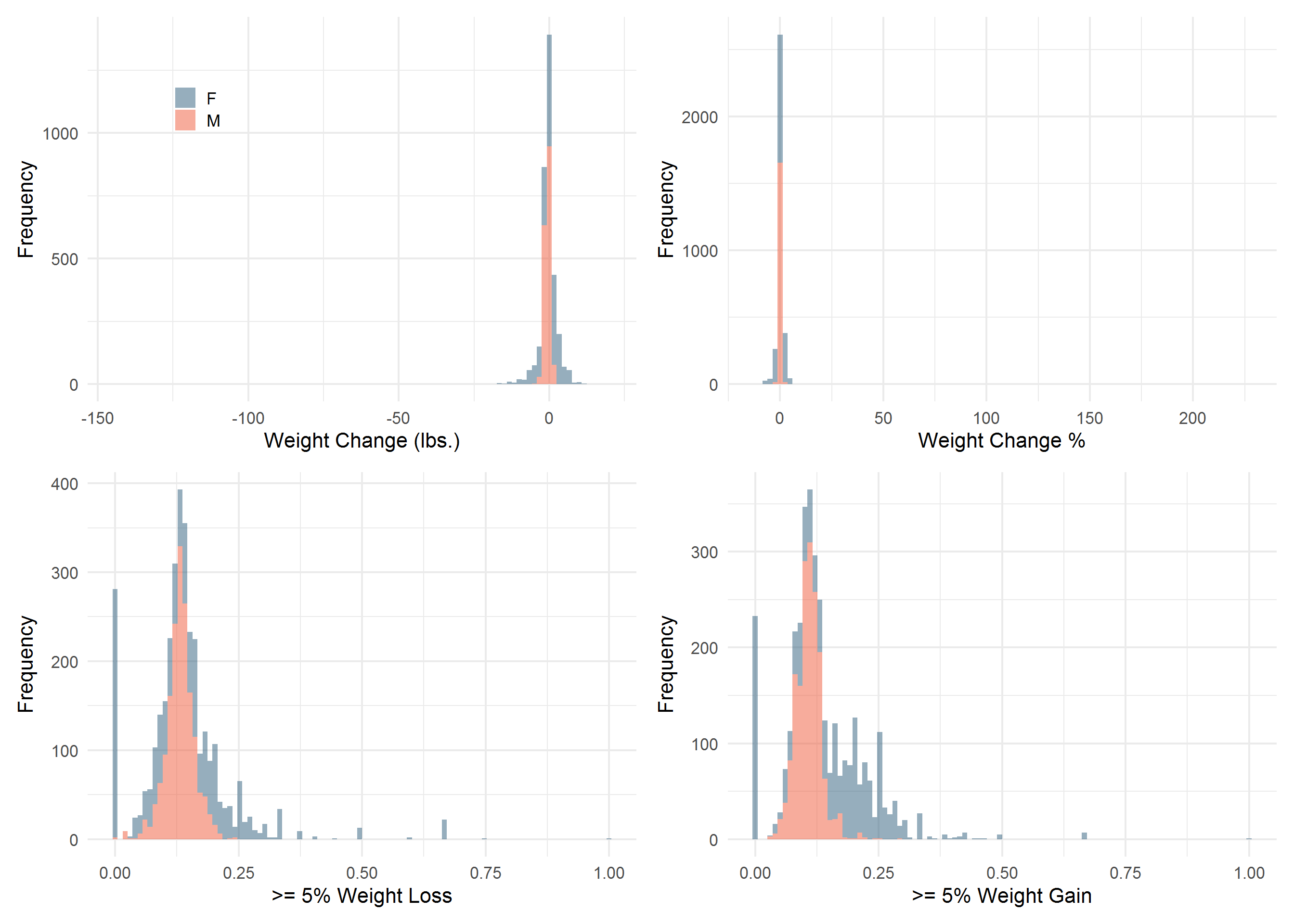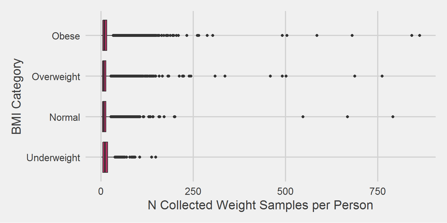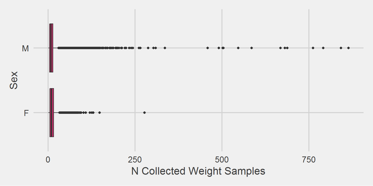 Men have, on average, slightly fewer weight values recorded than women in our sample.