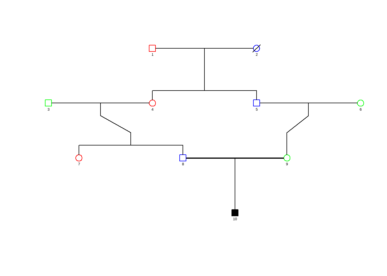plot.pedigree(family,cex = 0.8, col = c("red","blue","green","red","blue","green","red","blue","green","black"))